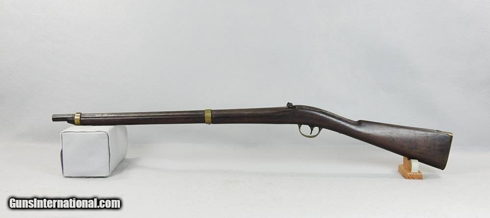 Description: This is a 54-Caliber side hammer breech loading carbine a.k.a. “Mule Ear.” It has an oval loading port and a 24 ¼” barrel. The top of the breech is marked Cast Steel and above it the date 1847 above that P above that RP and above that U.S.N. above that W. Jenks. The inside of the loading lever is number 539. With the oval loading port, a paper cartridge with ball and powder could be loaded much quicker than the round ball and loose powder. The mechanical function is very good and tight. The barrel at the muzzle end is pitted but the rifling is very strong and the rest of the bore is bright and shiny. I would consider trades for pre 1899 ANTIQUE PISTOLS and rifles on any of my items.. WHAT DO YOU HAVE TO TRADE? Ask about our 30-90 day lay-away program. We accept Bank Check, Money order, Personal checks or wire transfer. Antique: Yes Manufacturer: N.P. Ames Co Model: Side Hammer breech loading carbine Serial Number: 539 Barrel Length: 24 1/4” Price: $2,195.00 Contact Seller |