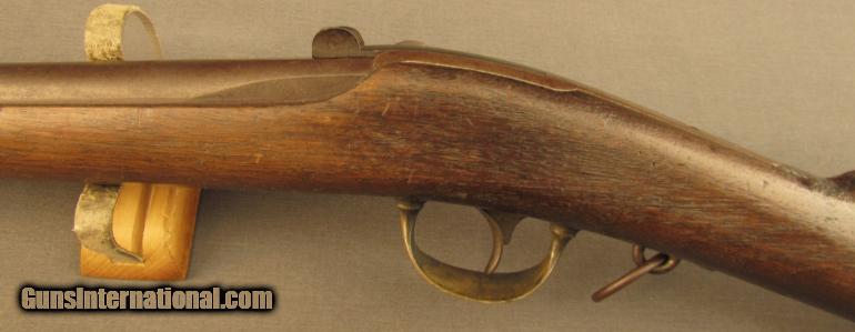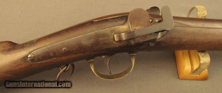 Description: NSN, .54 Caliber, 24 1/4" barrel with a very good, bright bore that has minor freckling and pitting at the breech. This is the later model, Remington-marked carbine with Maynard tape primer and has an overall smooth brown patina with scattered areas of smooth freckling along the barrel and some minor flaking along the exposed portion of the breech lever. Traces of original blue can be seen on the side hammer as well. The brass fixtures have developed a dark ochre patina spots of dark brown tarnish on the trigger guard and tang. The walnut stock has an excellent military oil finish with scattered small handling marks and small blemishes including a small area of surface chips and with-the-grain cracks at the tip of the wrist tang as well as a few minor surface chips around the buttplate. The mechanism is still tight and fully functional. This is a fine example of a rather scarce American naval carbine since only about 1,000 were ever built. Antique SOLD Antique: Yes Manufacturer: Jenks Model: Mule Ear Caliber Info: .54 Cal Gauge Info: .54 Cal |