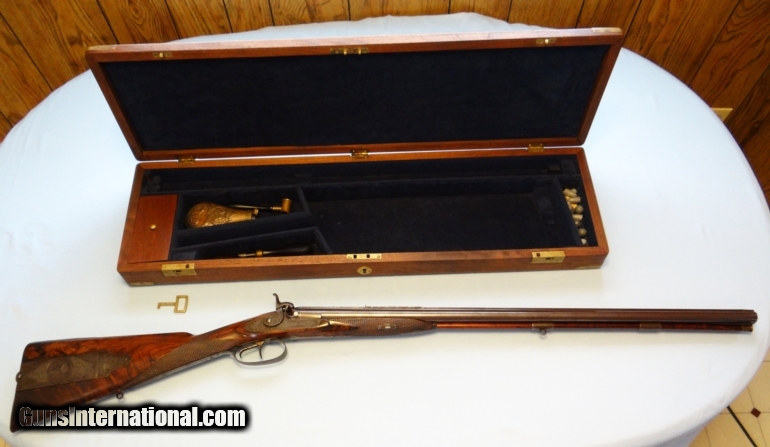 Description: John Hayton Cape Rifle, Double rifle Beautiful Percussion John Hayton Cape Rifle, Double Rifle. Right barrel 20 bore, left barrel 45 cal winged bullet, belted ball. Shoots round balls or conicals just fine. Beautiful wood and engraving. Platinum inserts up the barrel and patchbox or sightbox ingraved with a lion. SOLD Antique: Yes |