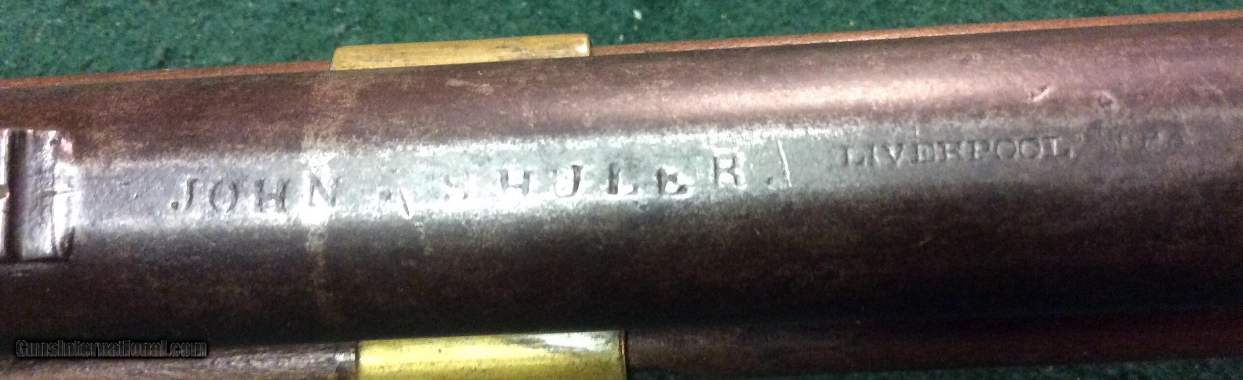Description: PRICE REDUCED NOW $3,400.00 Offered for sale is this John Shuler Liverpool Perry County Pennsylvania Rifle / Smoothe Bore swivel breech. Henry Parker warranted lock. 33" bbl's rifled bbl is approx .50" and the smoothe bore is approx .75". Double trigger set with brass trim and keyhole patch box with push button release. Some engraving and inlay. Good and proper barrel mark. See photo of slight butt stock damage. Overall a fine example of this important gun smithing family. The shuler family worked predominantly in Liverpool Perry County Penna. with the Pennsylvania canal system on the Susquehanna river running directly along the edge of the town their work was well known and traveled. SOLD Antique: Yes Manufacturer: John Shuler Model: Swivel Breech Caliber Info: .50 approx Bore: .75 approx |