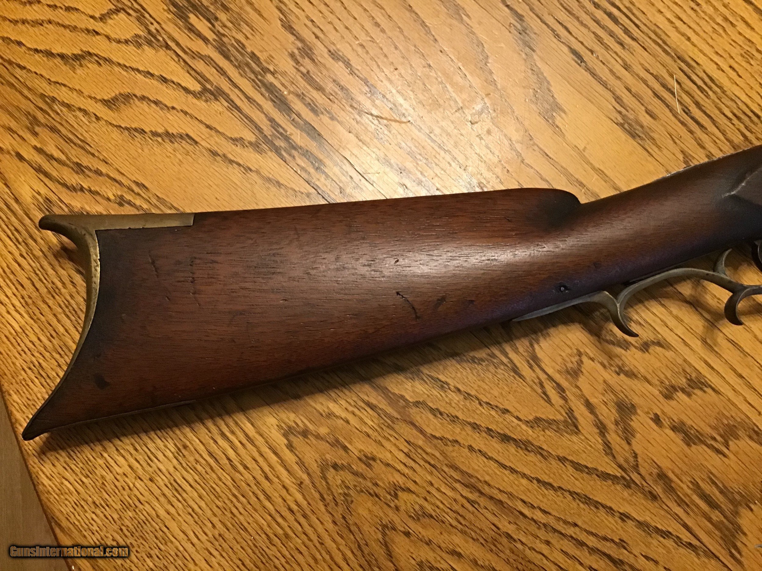 Description: On Hold Sale Pending. Antique circa 1850 Kentucky/Pennsylvania half stock hunting rifle, approximately 40 caliber. The 34" rifled barrel has a dark brown patina with deep rifling which has light pitting. Both front brass blade and buckhorn rear sights are present. The but plate and trigger guard are brass with a light brown patina. The front a lock has a set trigger which functions. The very good walnut has good color and a pewter or German silver nose cap. This old rifle is in very good overall condition. Please feel free to contact me with any questions. Shipping will be actual cost approximately $50.00. SOLD Antique: Yes Manufacturer: J. Craig Barrel Length: 34” |