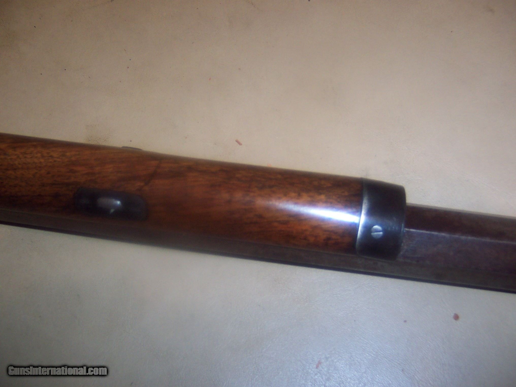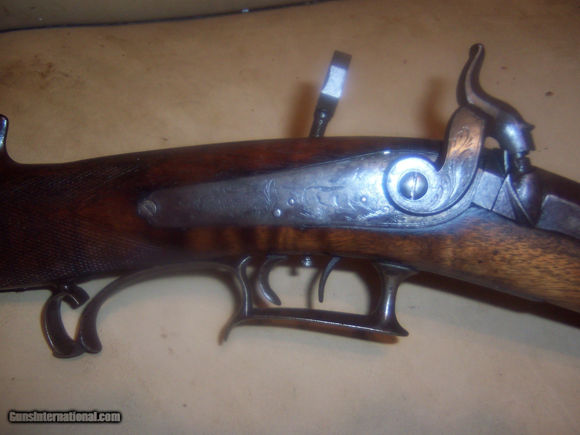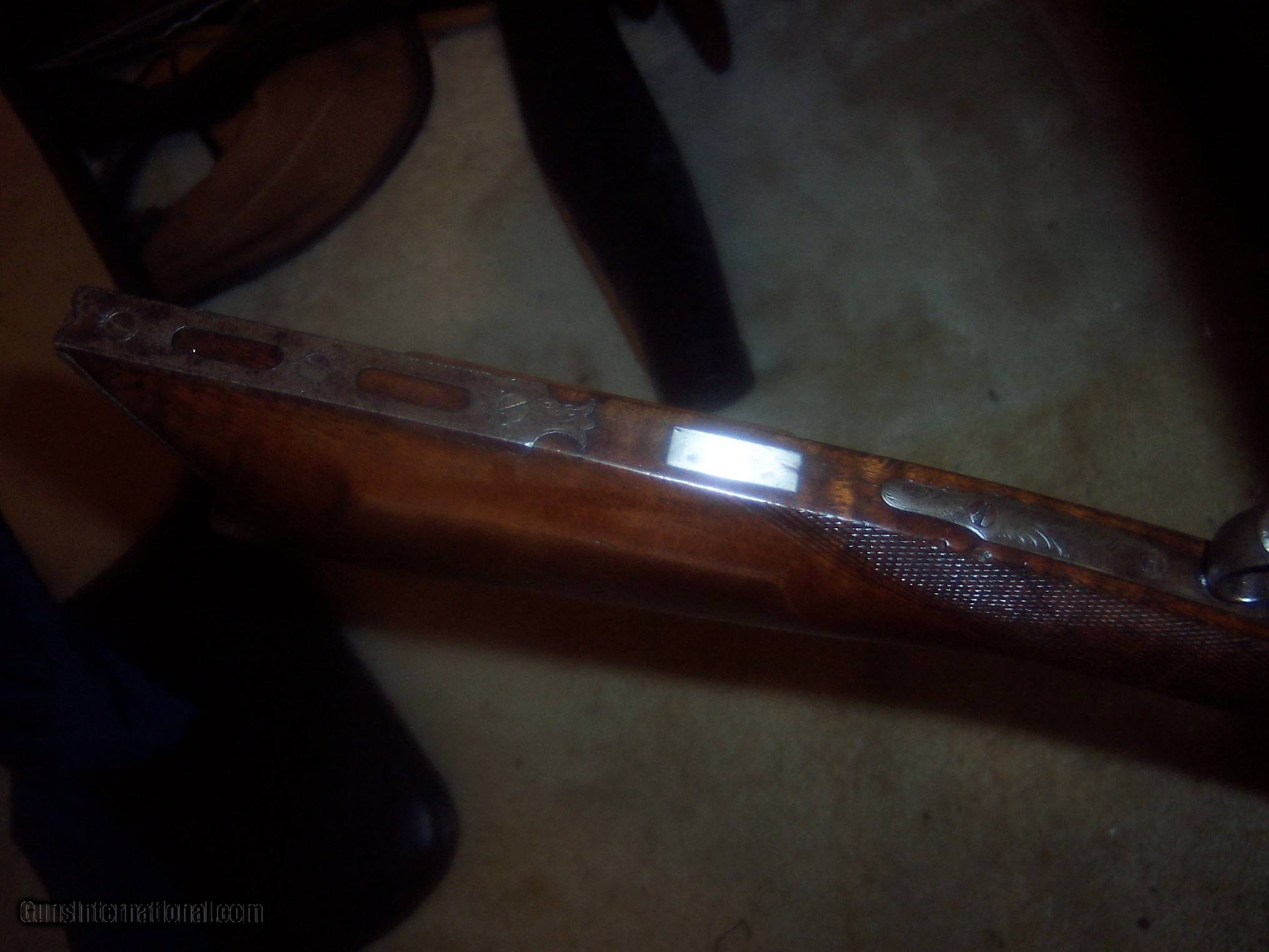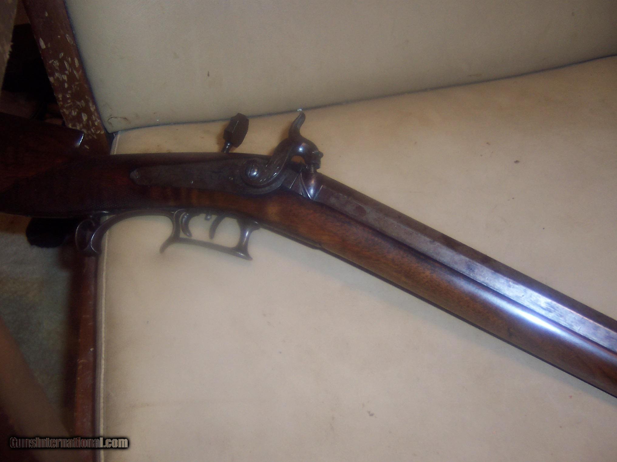 Description: gun has a 33 inch barrel in 45 caliber has pitting but looks shootable / gun in grey natural patina metal finish / wood in nice solid condition no breaks ok cracks//streel forend tip // action and set trigger work strong // first cock hammer then pull rear triggger to set then pull front trigger to fire // lock and barrel marked b s moulton union village ny// lock engraved with a dog some engraving on barrel trigger guard and butt blate // original lolly pop rear sight and original front / 2 small silver color inlays // born 1820 died 1874 his history on computer /// rifle could be called a heavy barrel half stock ky rifle or target rifle etc .. // barrel diameter 1.1 inch at breach to .9 at muzzel / gun in nice solid original condition just normal use for its age//$65 SH CIRCA 1860// probably why gun is in such good condition it was made at the start of the cartridge era // a vg quality rifle / nipple very good SOLD Antique: Yes |