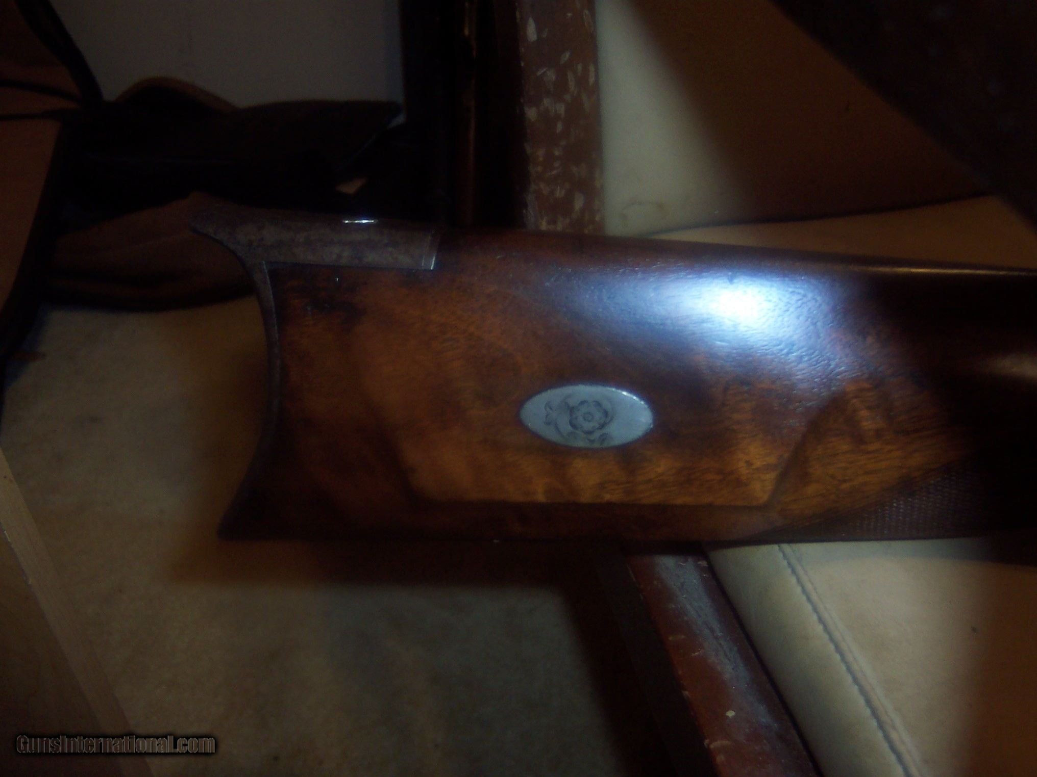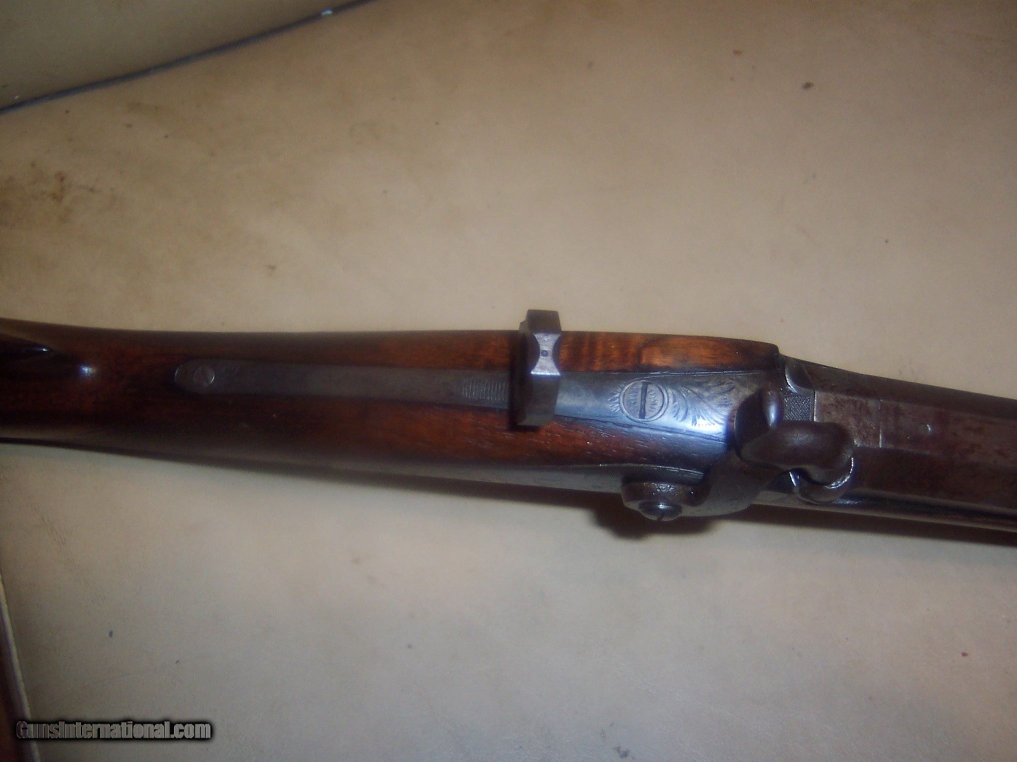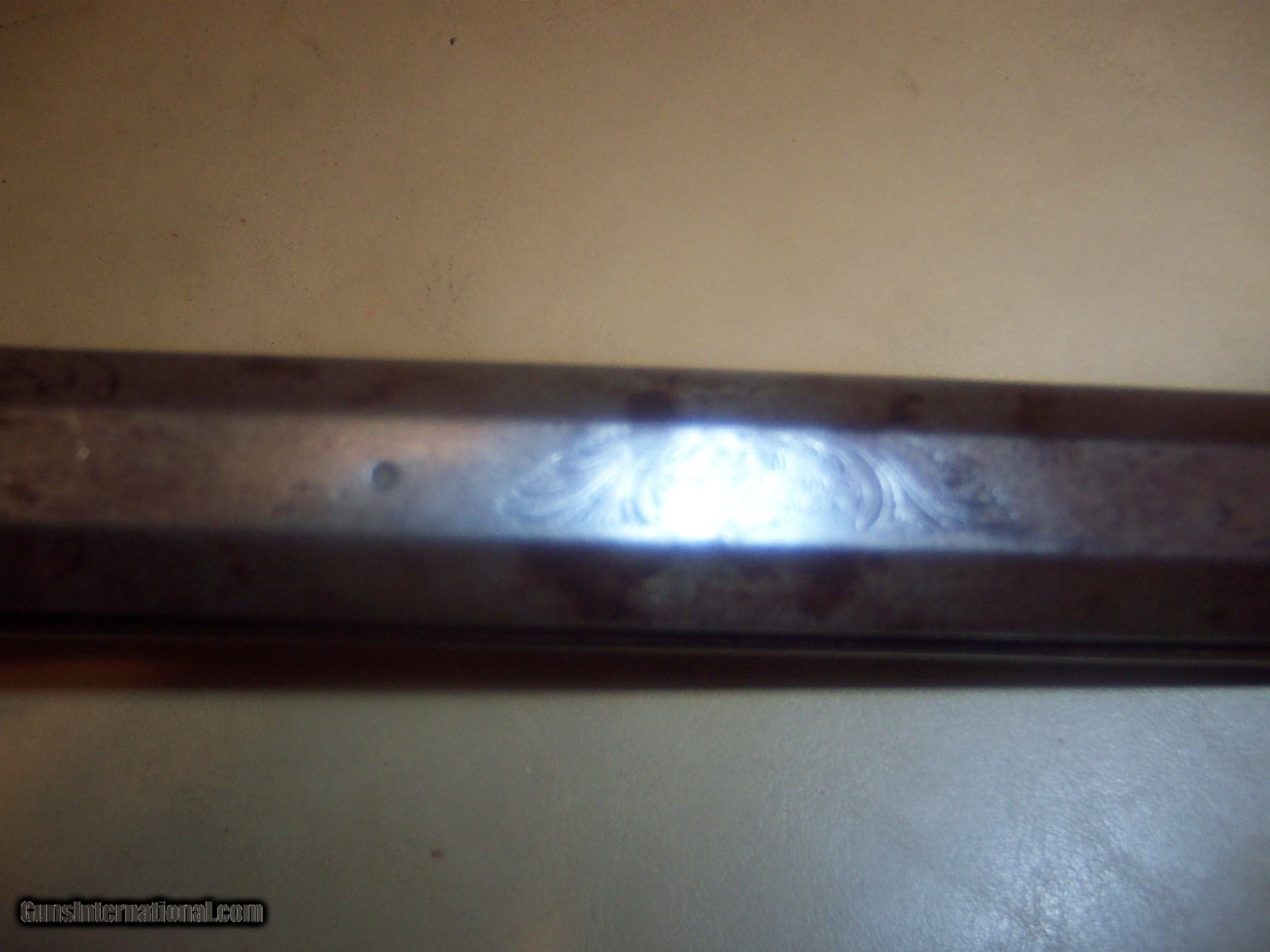 Description: gun has a 33 inch barrel in 45 caliber has pitting but looks shootable / gun in grey natural patina metal finish / wood in nice solid condition no breaks ok cracks//streel forend tip // action and set trigger work strong // first cock hammer then pull rear triggger to set then pull front trigger to fire // lock and barrel marked b s moulton union village ny// lock engraved with a dog some engraving on barrel trigger guard and butt blate // original lolly pop rear sight and original front / 2 small silver color inlays // born 1820 died 1874 his history on computer /// rifle could be called a heavy barrel half stock ky rifle or target rifle etc .. // barrel diameter 1.1 inch at breach to .9 at muzzel / gun in nice solid original condition just normal use for its age//$65 SH CIRCA 1860// probably why gun is in such good condition it was made at the start of the cartridge era // a vg quality rifle / nipple very good SOLD Antique: Yes |