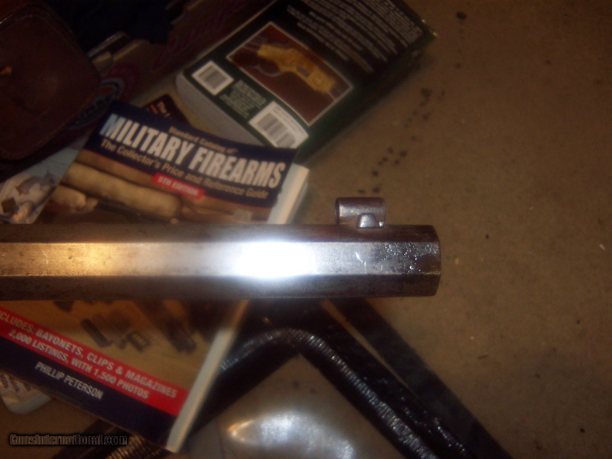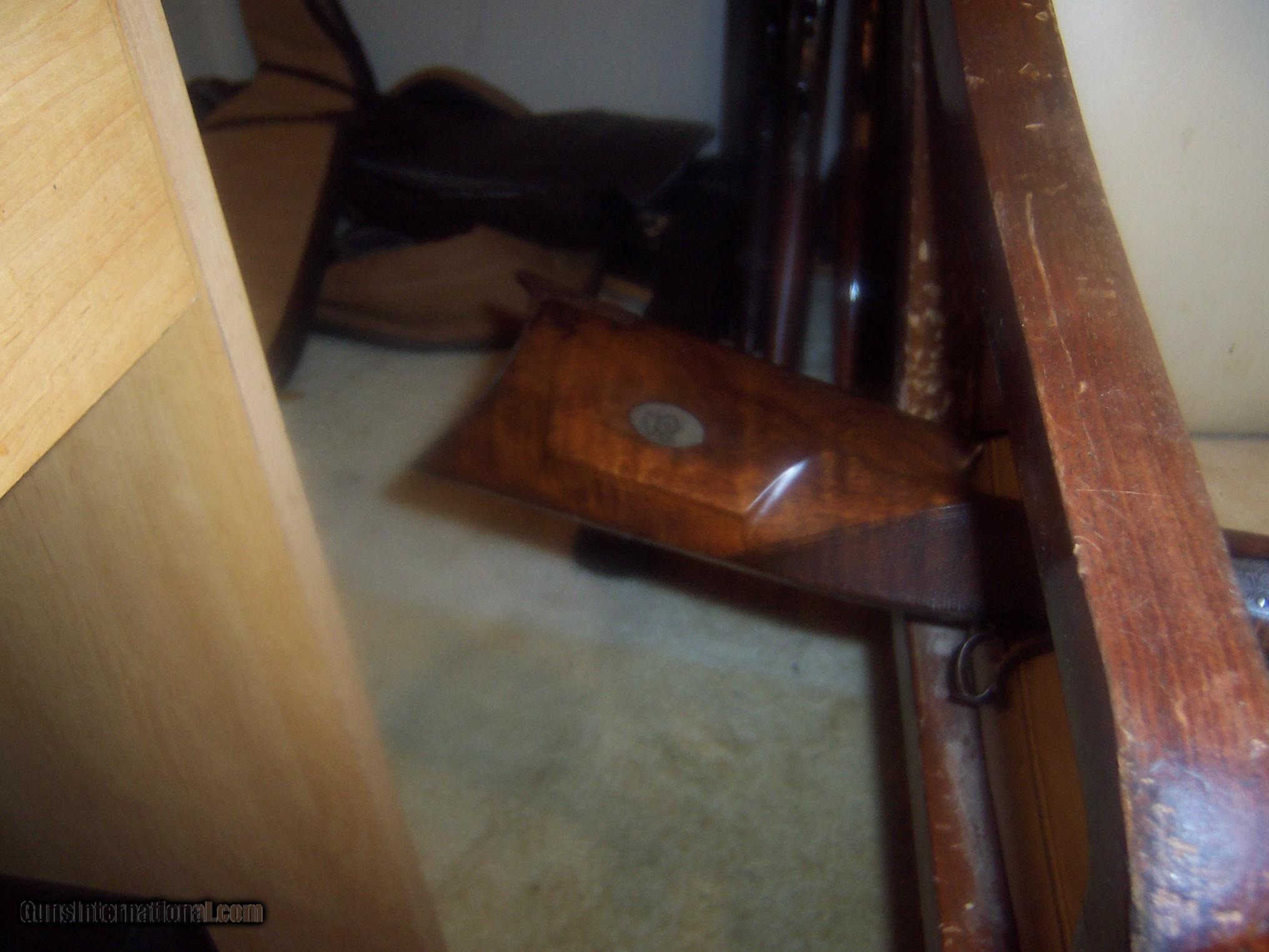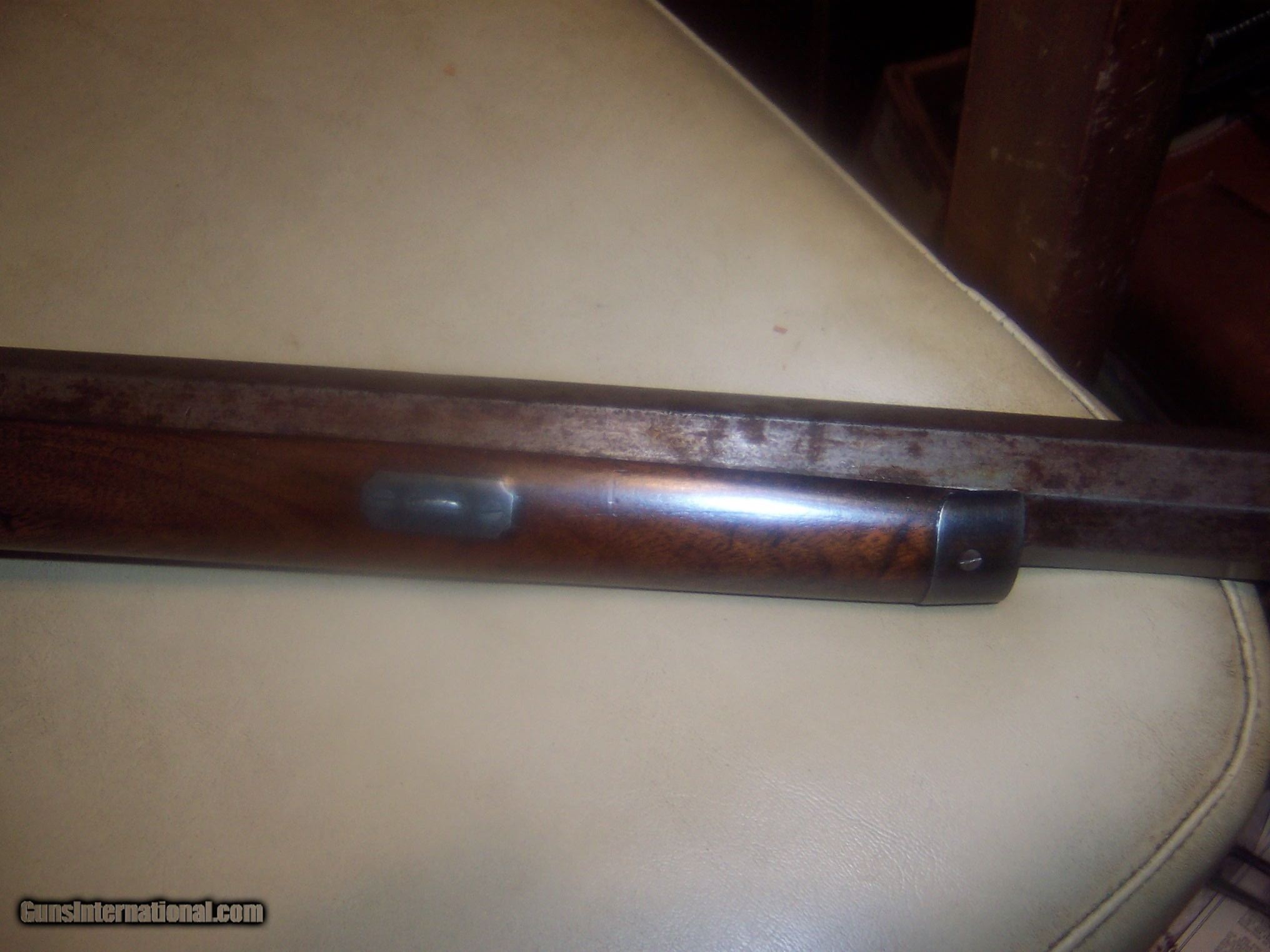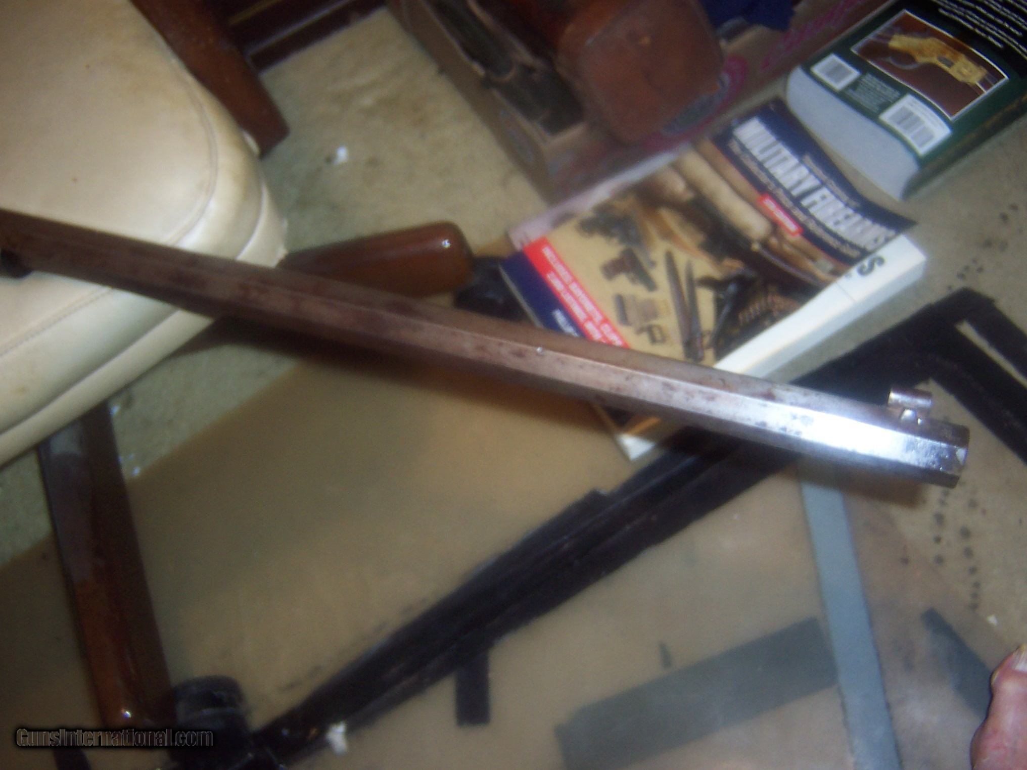 Description: gun has a 33 inch barrel in 45 caliber has pitting but looks shootable / gun in grey natural patina metal finish / wood in nice solid condition no breaks ok cracks//streel forend tip // action and set trigger work strong // first cock hammer then pull rear triggger to set then pull front trigger to fire // lock and barrel marked b s moulton union village ny// lock engraved with a dog some engraving on barrel trigger guard and butt blate // original lolly pop rear sight and original front / 2 small silver color inlays // born 1820 died 1874 his history on computer /// rifle could be called a heavy barrel half stock ky rifle or target rifle etc .. // barrel diameter 1.1 inch at breach to .9 at muzzel / gun in nice solid original condition just normal use for its age//$65 SH CIRCA 1860// probably why gun is in such good condition it was made at the start of the cartridge era // a vg quality rifle / nipple very good SOLD Antique: Yes |