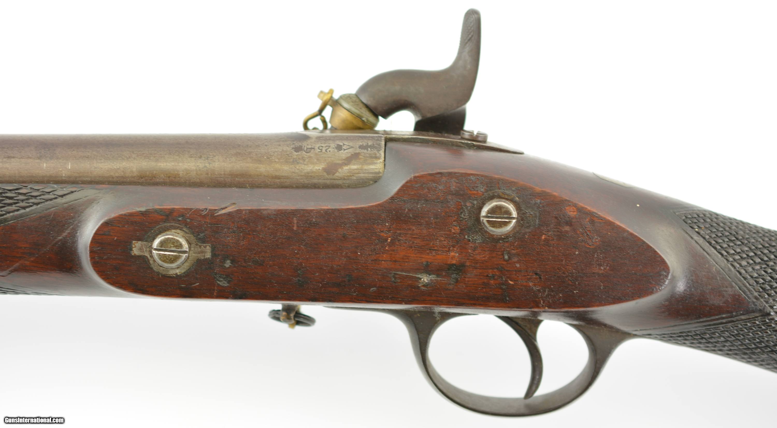 Description: NSN, .577 Caliber, 31 1/2" barrel with an excellent, bright oval bore. This is a Lancaster-made, two-band rifle with bayonet bar on the right side of the muzzle. The barrel has an overall plum-brown patina with some silvering along the edges of the bayonet stud, and at the muzzle. The lock is marked: “C. LANCASTER / PATENT" ahead of the hammer, and, in addition to the crisp London proofs at the breech, is also marked with the address on top of the barrel: “151 NEW BOND ST. LONDON". The nosecap and barrel bands are also a plum-brown color overall, and the trigger guard has a mottled gray-brown appearance. The nearly full length walnut stock has numerous small surface blemishes and bruises under a dark brown, added oil finish that has left the checkering still sharp and crisp. Additionally, there is a small octagonal silver escutcheon on the top of the wrist that has a previous owner's initial engraved: “I"; as well as a vertical repair at the toe. The lock is fully functional and the original nipple-protector is still present. This is an unusual, oval bored, Enfield style short rifle, and is in fine condition overall. Antique SOLD Antique: Yes Manufacturer: Lancaster Model: Carbine Caliber Info: .577 Gauge Info: .577 |