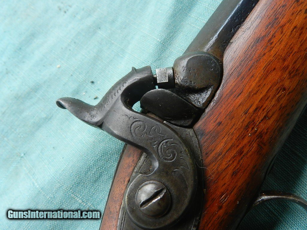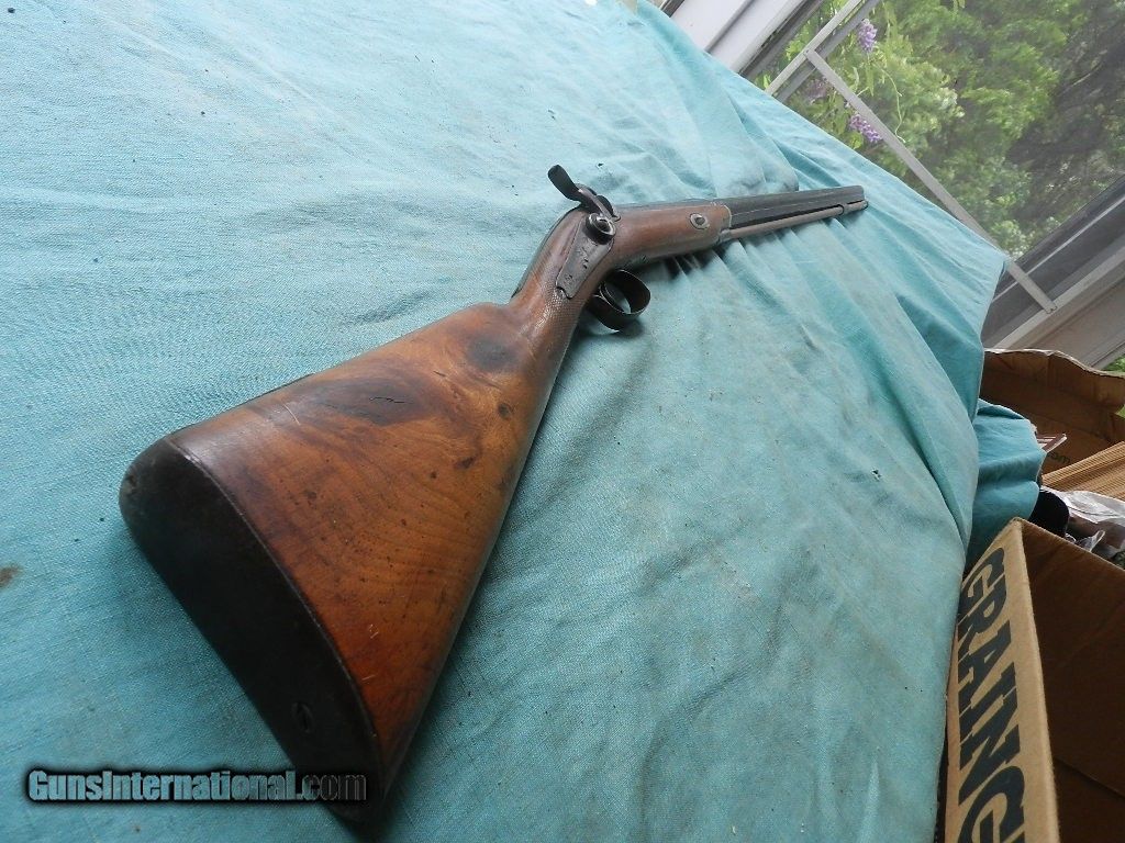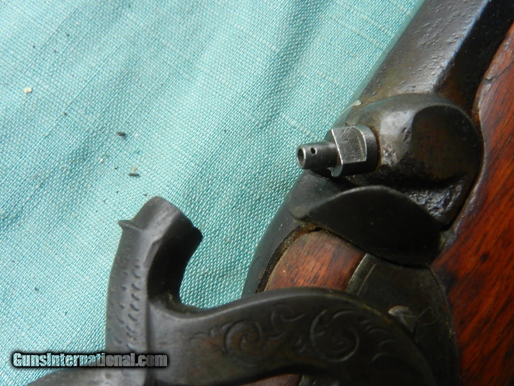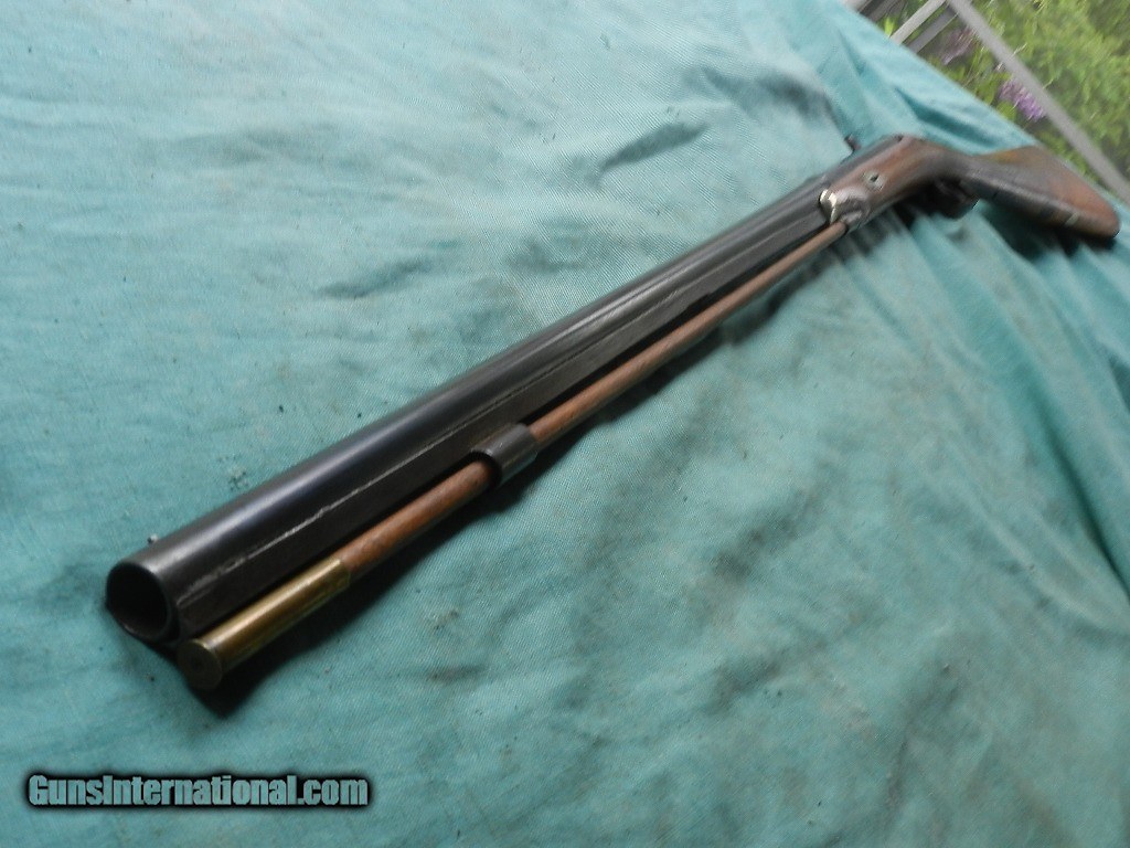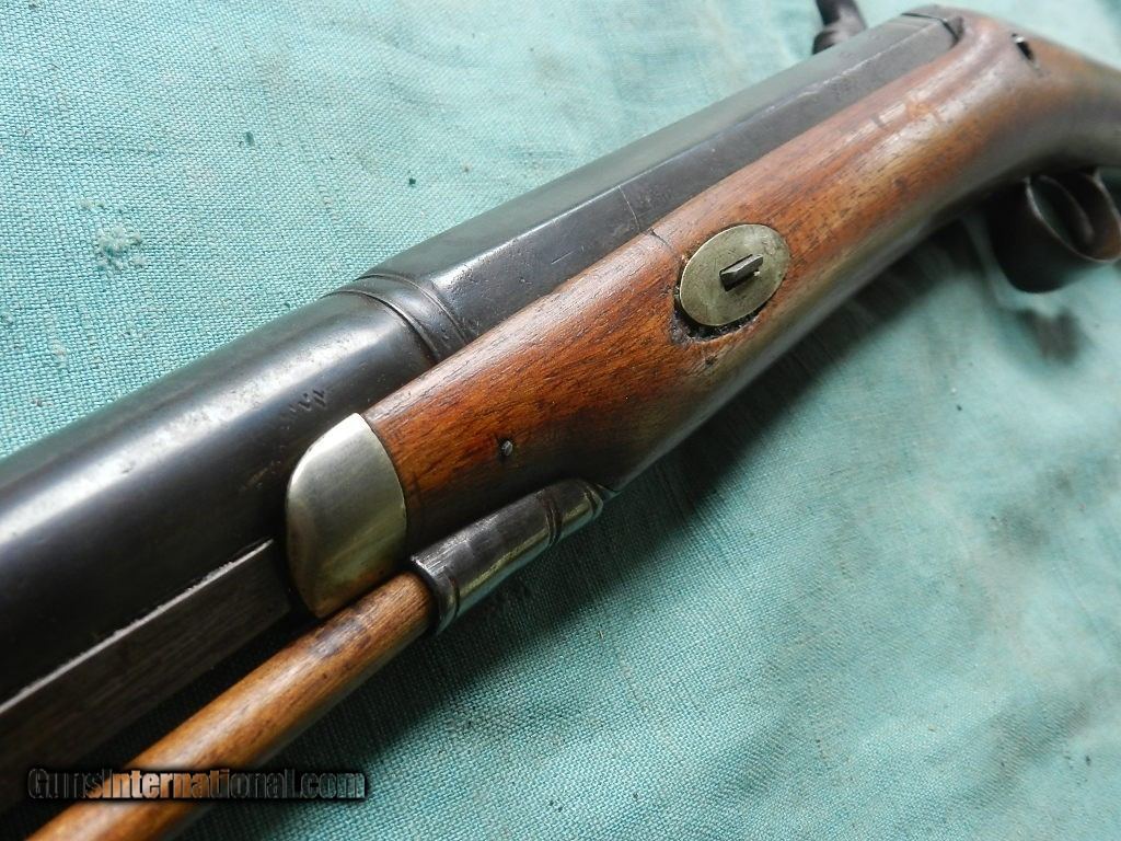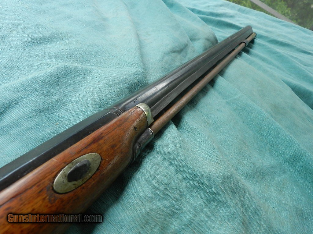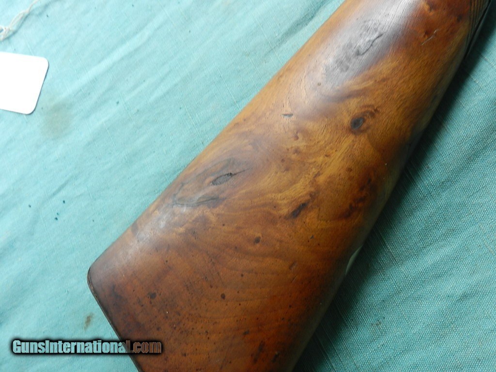 Description: An interesting London marked 16ga fowler with a 31 1/2" barrel and clean bore with roughness in patches. The back action lock, and hammer have chisel engraved designs and a hunt scene on the lock plate. The action works well, and the barrel is a pleasing plum color, with three inlaid silver bands at the breech. Second ram-tod ferrule is not present. Trim is German silver and steel, and comes with a hard-wood ram-tod and brass tip. The stock is in very good condition, and appears to be figural French walnut with agressive grain. LOP is about 15". When buying a gun always have it examined by a competent gunsmith before shooting. To buy a gun from me you must get a direct email for me, with details, and shipping cost. We don’t have a web site .I prefer money orders or a check. Item ships when funds come in. I try to keep guns affordable, which means I make less money than most dealers. You won’t get altitude sickness, or nose bleed, with my prices! I consistently have the best selection of older guns If you attempt to buy, you must still contact us for details . Best to email to buy. Sometimes a local person can stop buy and purchase before the gun is removed. Sometimes not home to get calls. Some guns are required shipment to a gun dealer near you for a transfer to you when it arrives. Otherwise many older or black powder guns ship to your door. With the widest selection of older guns at great prices, We don’t have a store, and sell on the internet only. I’m easy to get along with. Thank You SOLD Antique: Yes |