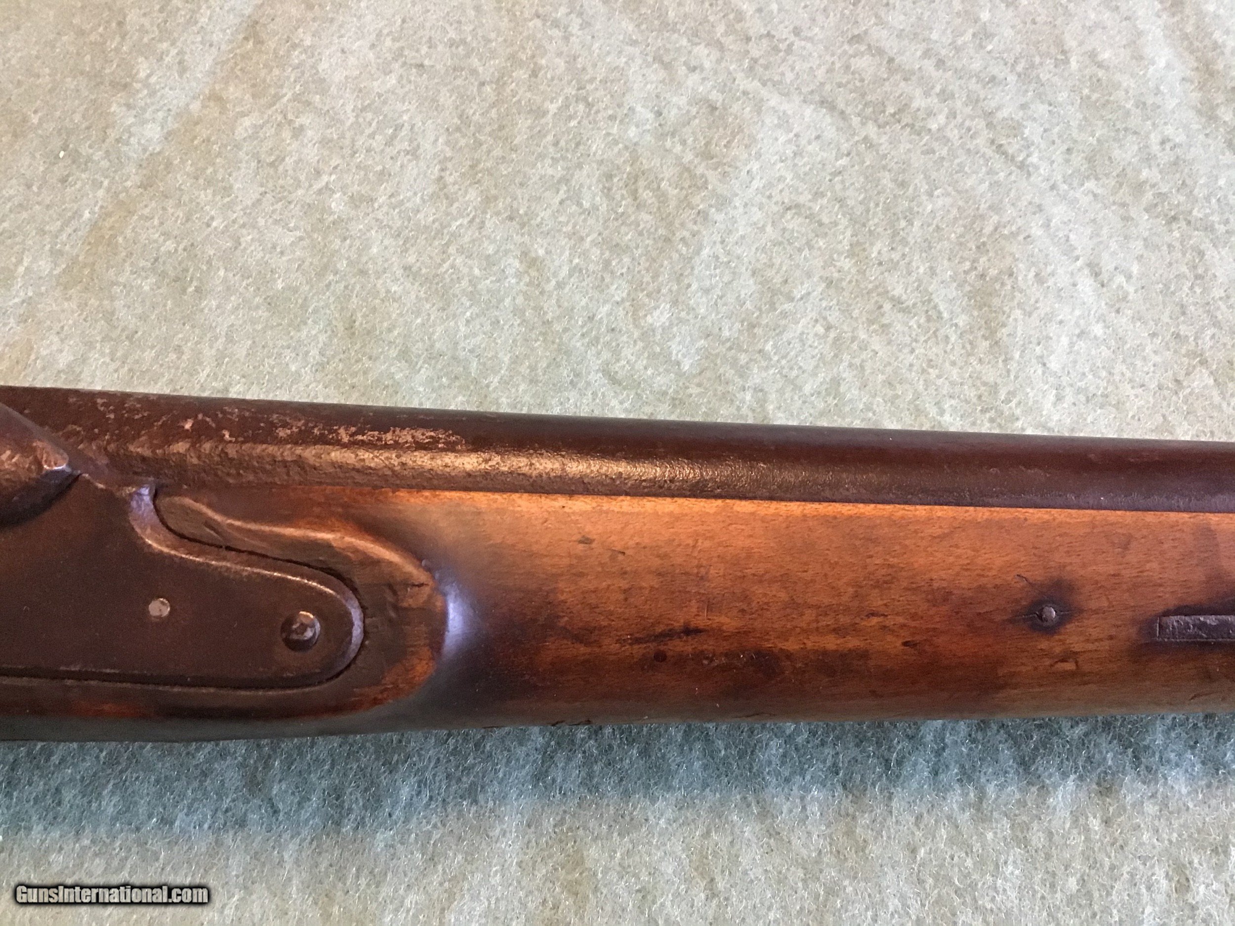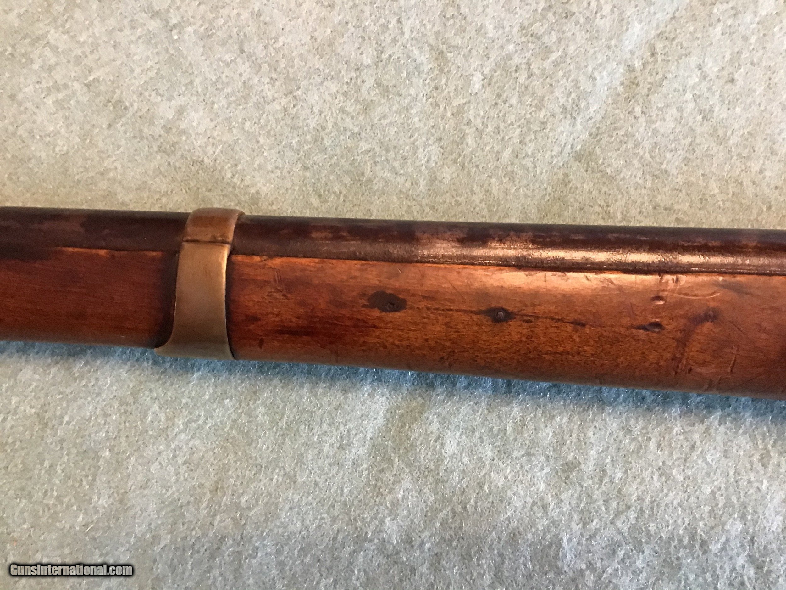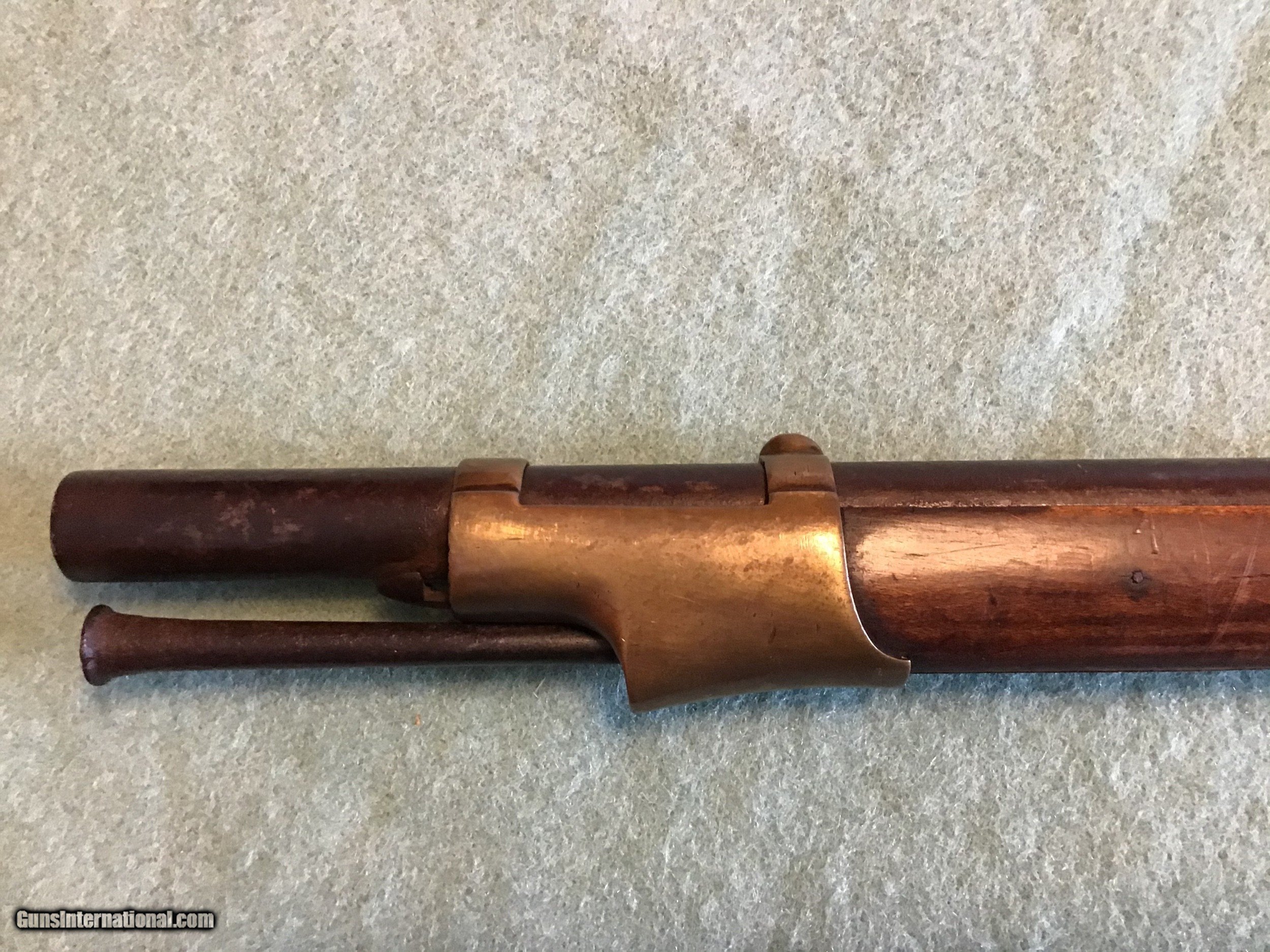 Description: The Prussian model 1809/1839 measures 56.5 inches in length with a 41.25 inch barrel in 72 caliber smooth bore is dated 1826. Originally manufactured as a flintlock and converted to percussion in the 1830's. Thousands of the Prussian muskets were imported during the civil war. The full length original stock has a number of cartouches and stamping along with a M164 which could be unit marking. The lock markings are not readable due to the dark brown patina. The butt plate is stamped 490. There is what I believe to be a musseum tag near the butt plate. The metal parts have a smooth dark brown patina along with some pitting near the nipple. The trigger guard, barrel bands and left side plate are brass with a mellow patina. Both sling swivels and ramrod are present. The lock functions as it should. The historic firearms appears to be in very good original condition. Shipping will be actual cost approximately $50.00. A very good example of a civil war import musket. Feel free to call me with any questions 218-839-9272 or email at chriskobberdahl2gmail. Sale Pending SOLD Antique: Yes Manufacturer: Prussian Model: 1809/1839 Serial Number: NA Caliber Info: 72 Condition: Very good Metal Condition: Good Wood Condition: Very good Bore Condition: Dark |
