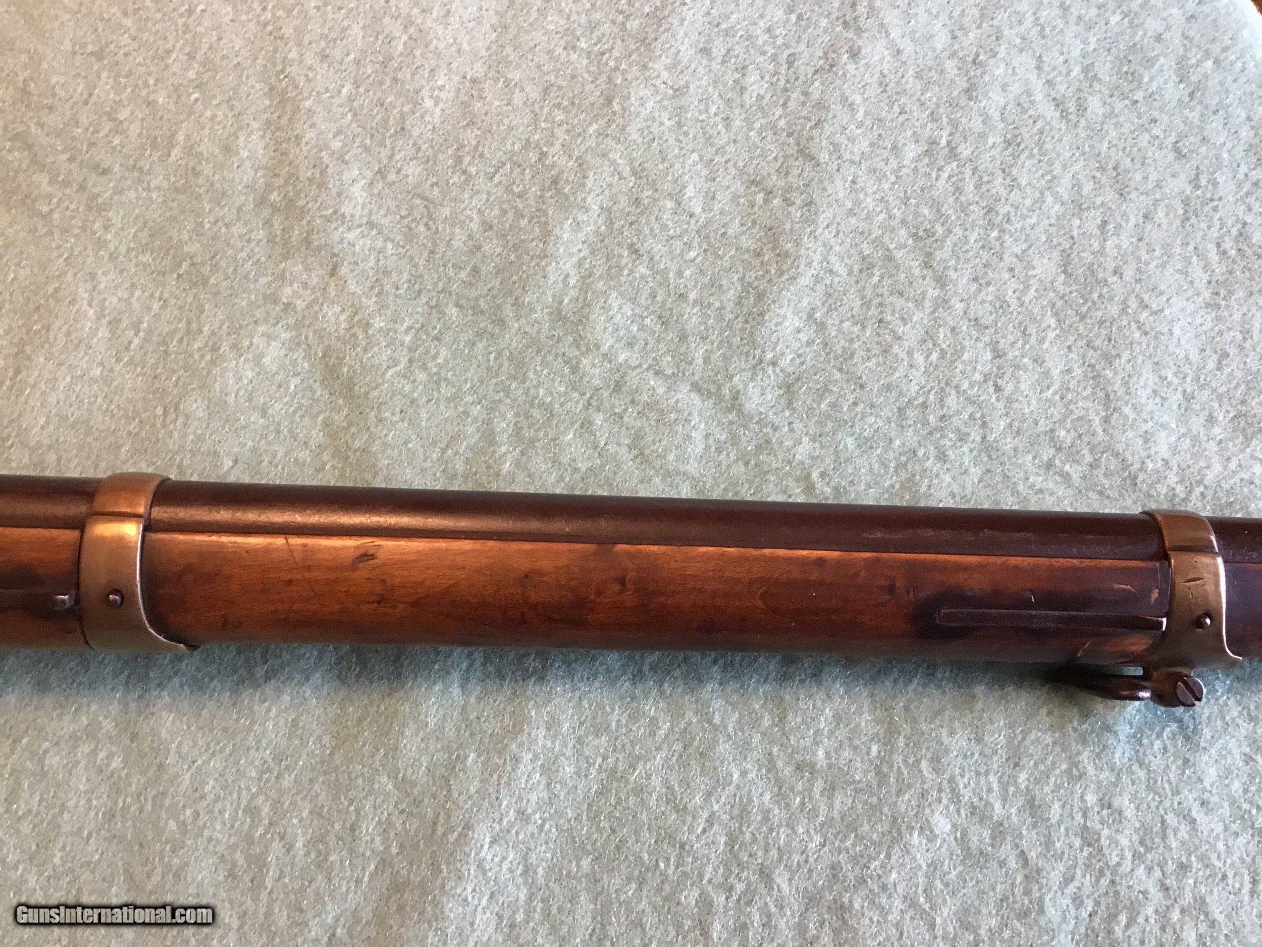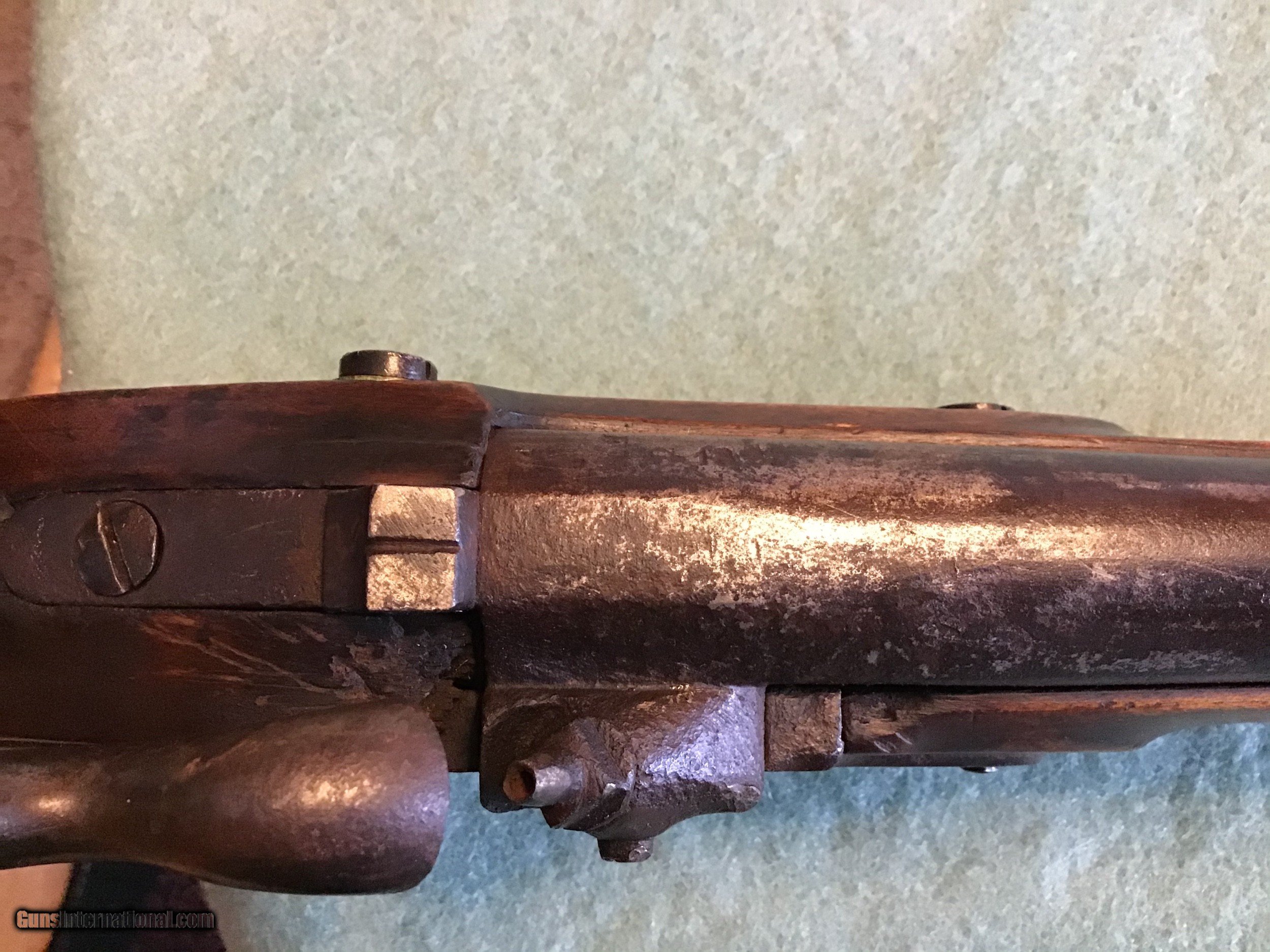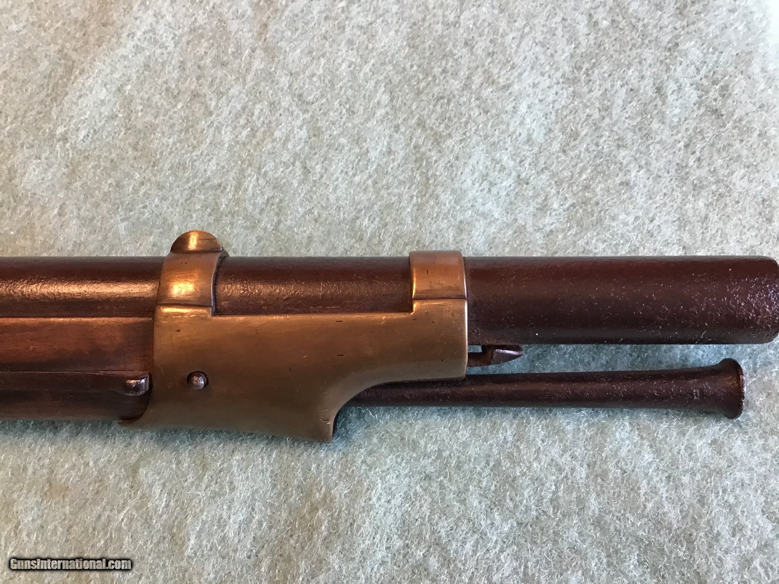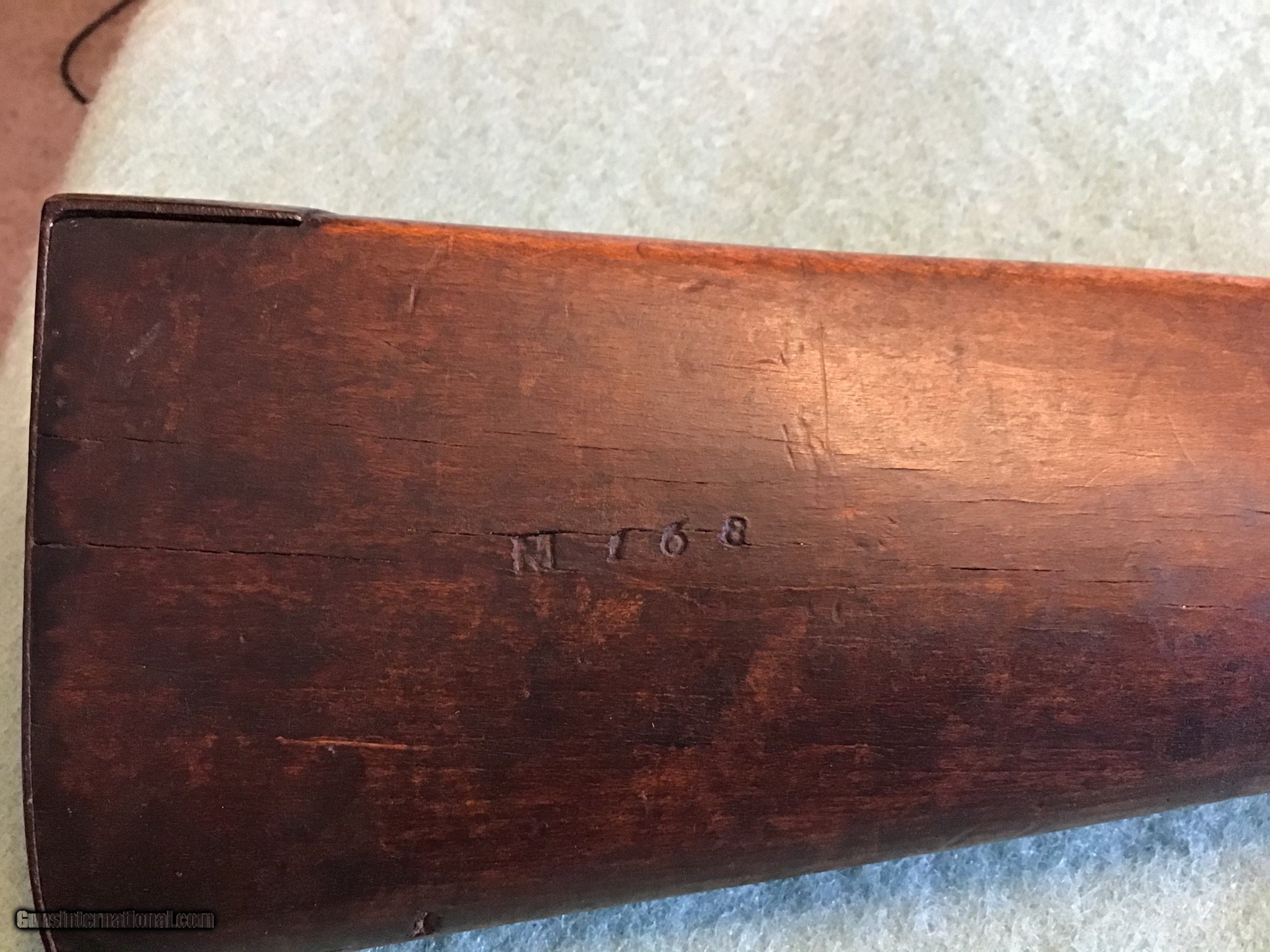 Description: The Prussian model 1809/1839 measures 56.5 inches in length with a 41.25 inch barrel in 72 caliber smooth bore is dated 1826. Originally manufactured as a flintlock and converted to percussion in the 1830's. Thousands of the Prussian muskets were imported during the civil war. The full length original stock has a number of cartouches and stamping along with a M164 which could be unit marking. The lock markings are not readable due to the dark brown patina. The butt plate is stamped 490. There is what I believe to be a musseum tag near the butt plate. The metal parts have a smooth dark brown patina along with some pitting near the nipple. The trigger guard, barrel bands and left side plate are brass with a mellow patina. Both sling swivels and ramrod are present. The lock functions as it should. The historic firearms appears to be in very good original condition. Shipping will be actual cost approximately $50.00. A very good example of a civil war import musket. Feel free to call me with any questions 218-839-9272 or email at chriskobberdahl2gmail. Sale Pending SOLD Antique: Yes Manufacturer: Prussian Model: 1809/1839 Serial Number: NA Caliber Info: 72 Condition: Very good Metal Condition: Good Wood Condition: Very good Bore Condition: Dark |