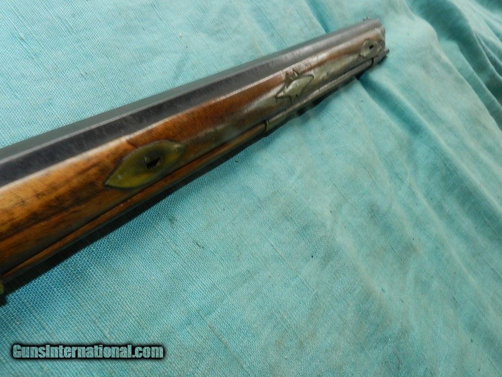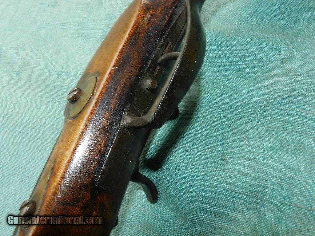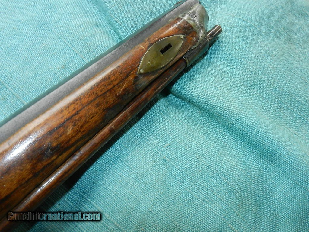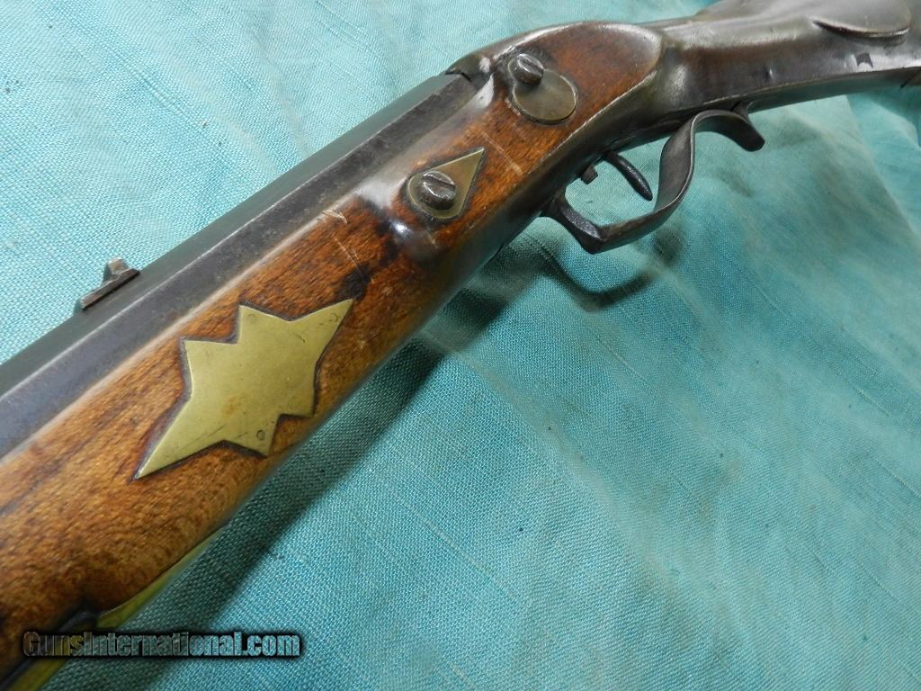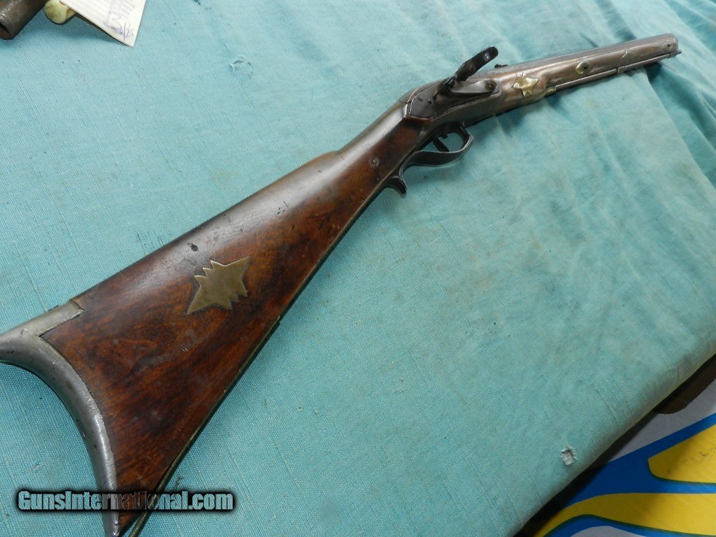 Description: SOLD A 19th century, about .32 cal., 18'' octagon barrel, with an oxidized bore. The barrel is unmarked, has simple dovetail front and rear sights and is an overall brown oxidized patina. The lock plate has an interesting pivoting hammer mounted to a stud at the center of the lock with an external hammer spring and a side-mounted nipple. Comes with a hardwood ram-rod and a brass tip. It is completely unmarked but strong and well made for everday use. The maple stock has a pewter buttplate and scant left-side cheekpiece and rates perhaps good with multiple small cracks, dings and repaired toe. There are four star-shaped brass inlays and four lozenge-shaped wedge escutcheons along the firestick. An interesting rudimentary gunsmith take on the mule ear ignition system. Measuring about 32" overall and good size for placing it under the wagon seat. Most likey New England made. When buying a gun always have it examined by a competent gunsmith before shooting. To buy a gun from me you must get a direct email for me, with details, and shipping cost. We don’t have a web site .I prefer money orders or a check. Item ships when funds come in. I try to keep guns affordable, which means I make less money than most dealers. You won’t get altitude sickness, or nose bleed, with my prices! I consistently have the best selection of older guns If you attempt to buy, you must still contact us for details . Best to email to buy. Sometimes a local person can stop buy and purchase before the gun is removed. Sometimes not home to get calls. Some guns are required shipment to a gun dealer near you for a transfer to you when it arrives. Otherwise many older or black powder guns ship to your door. With the widest selection of older guns at great prices, We don’t have a store, and sell on the internet only. I’m easy to get along with. Thank You SOLD Antique: Yes |