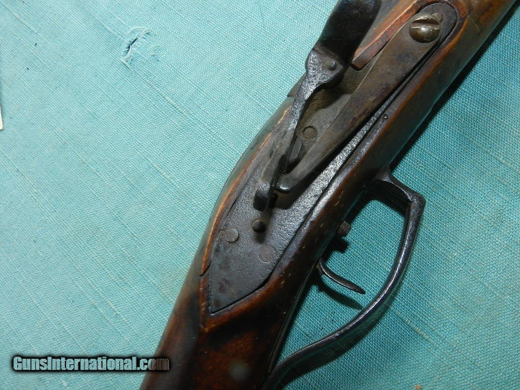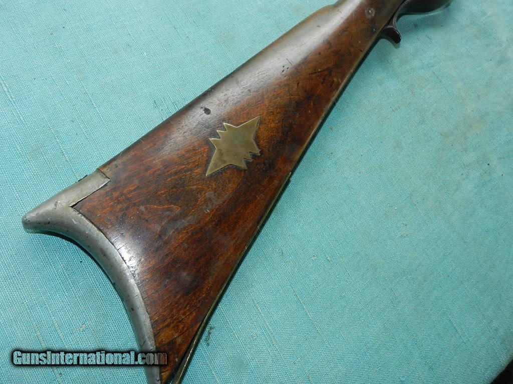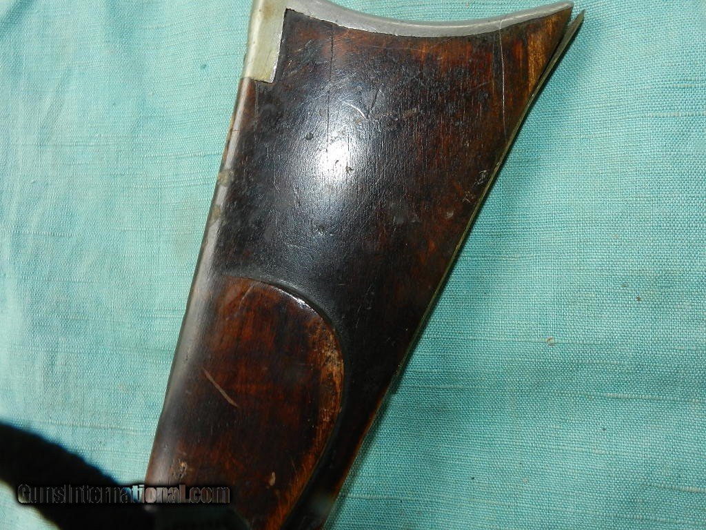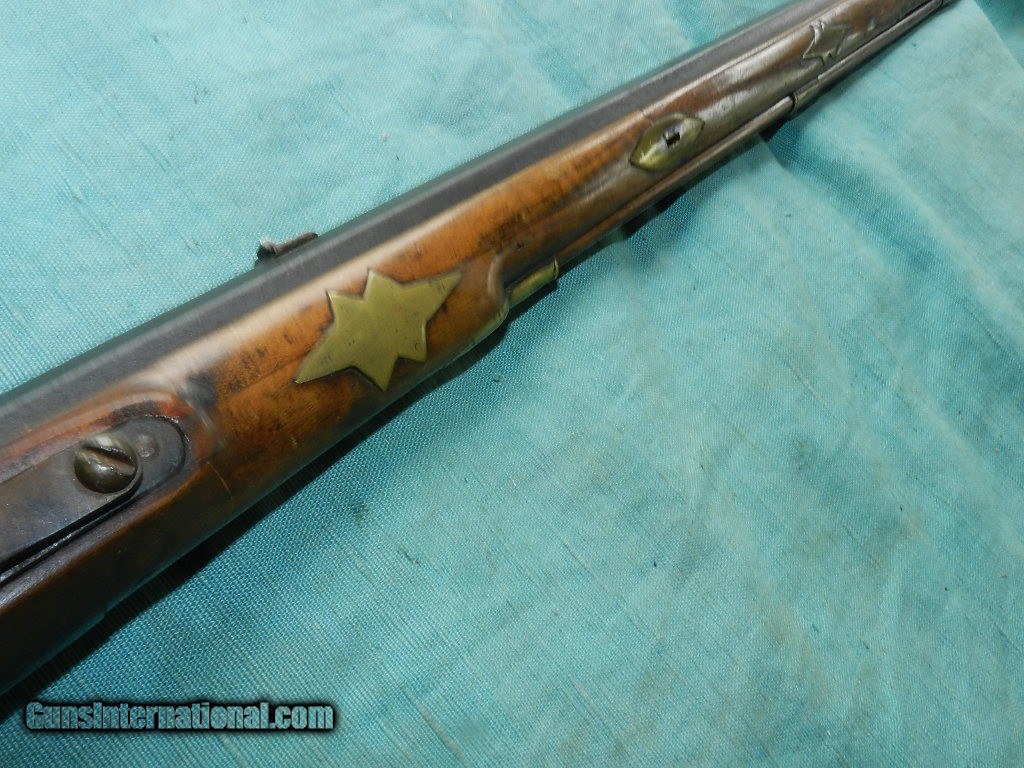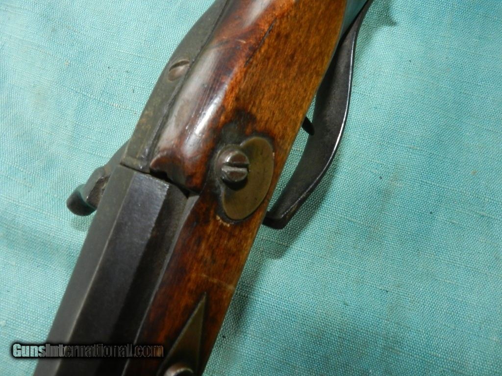 Description: SOLD A 19th century, about .32 cal., 18'' octagon barrel, with an oxidized bore. The barrel is unmarked, has simple dovetail front and rear sights and is an overall brown oxidized patina. The lock plate has an interesting pivoting hammer mounted to a stud at the center of the lock with an external hammer spring and a side-mounted nipple. Comes with a hardwood ram-rod and a brass tip. It is completely unmarked but strong and well made for everday use. The maple stock has a pewter buttplate and scant left-side cheekpiece and rates perhaps good with multiple small cracks, dings and repaired toe. There are four star-shaped brass inlays and four lozenge-shaped wedge escutcheons along the firestick. An interesting rudimentary gunsmith take on the mule ear ignition system. Measuring about 32" overall and good size for placing it under the wagon seat. Most likey New England made. When buying a gun always have it examined by a competent gunsmith before shooting. To buy a gun from me you must get a direct email for me, with details, and shipping cost. We don’t have a web site .I prefer money orders or a check. Item ships when funds come in. I try to keep guns affordable, which means I make less money than most dealers. You won’t get altitude sickness, or nose bleed, with my prices! I consistently have the best selection of older guns If you attempt to buy, you must still contact us for details . Best to email to buy. Sometimes a local person can stop buy and purchase before the gun is removed. Sometimes not home to get calls. Some guns are required shipment to a gun dealer near you for a transfer to you when it arrives. Otherwise many older or black powder guns ship to your door. With the widest selection of older guns at great prices, We don’t have a store, and sell on the internet only. I’m easy to get along with. Thank You SOLD Antique: Yes |