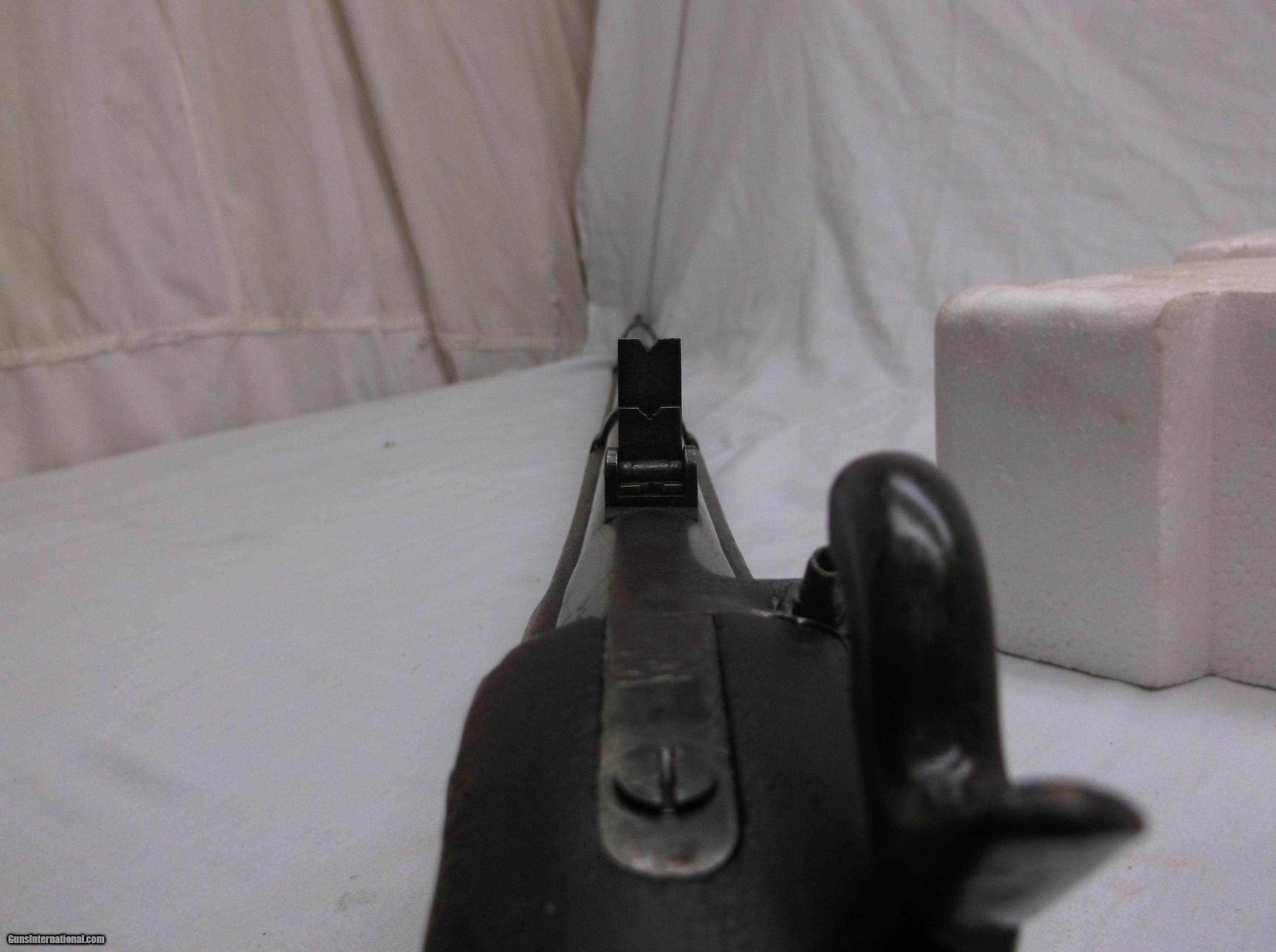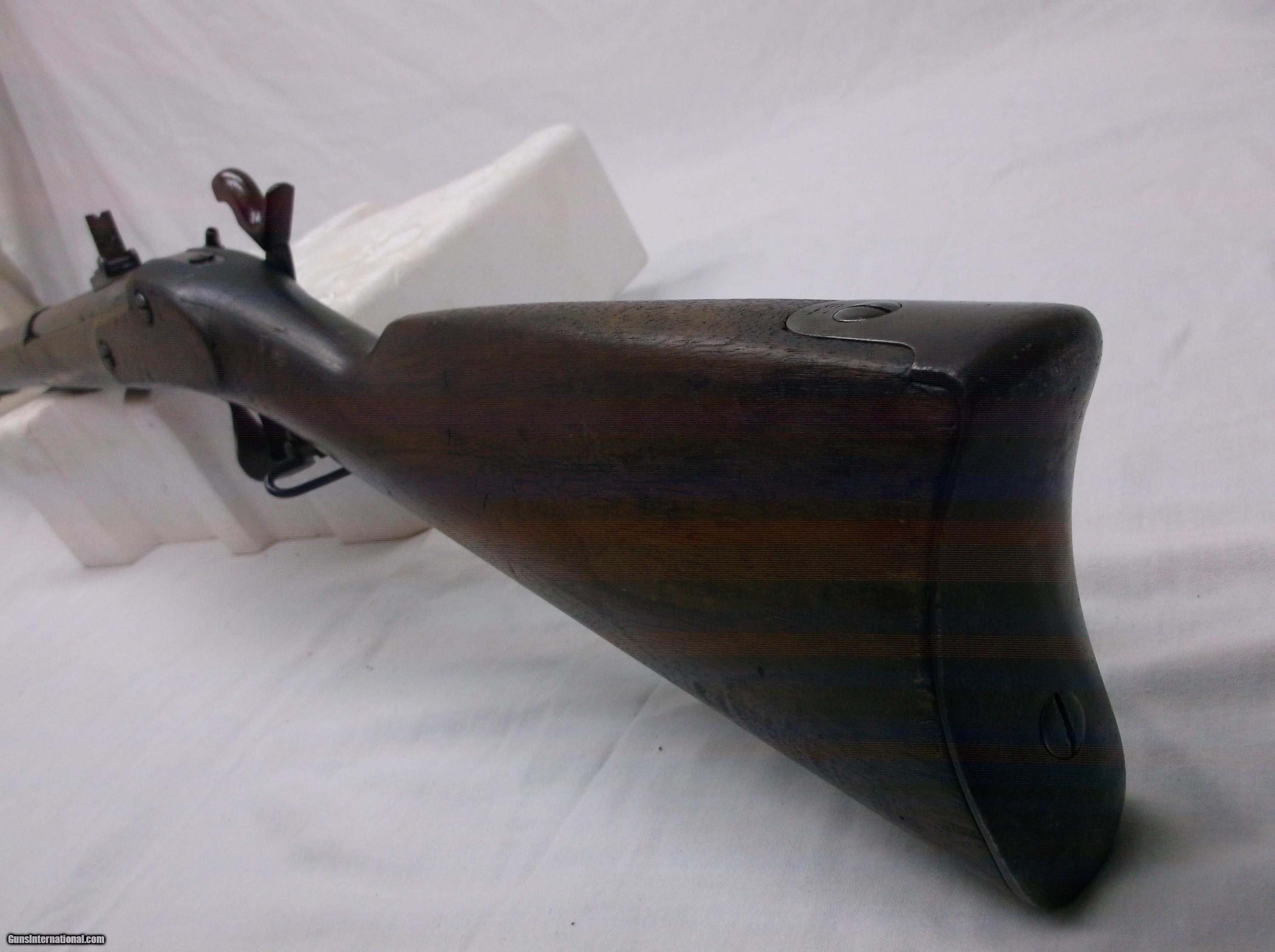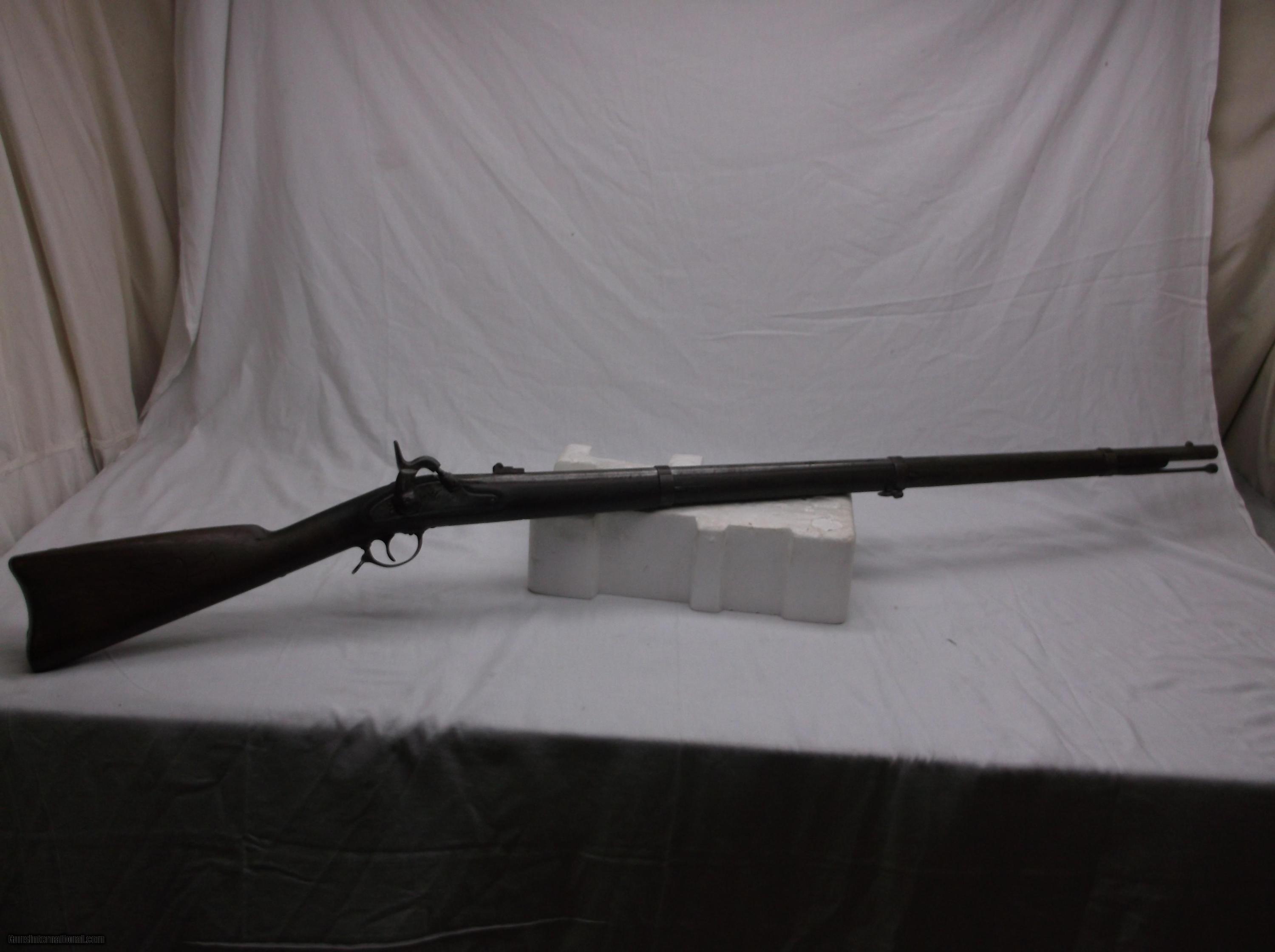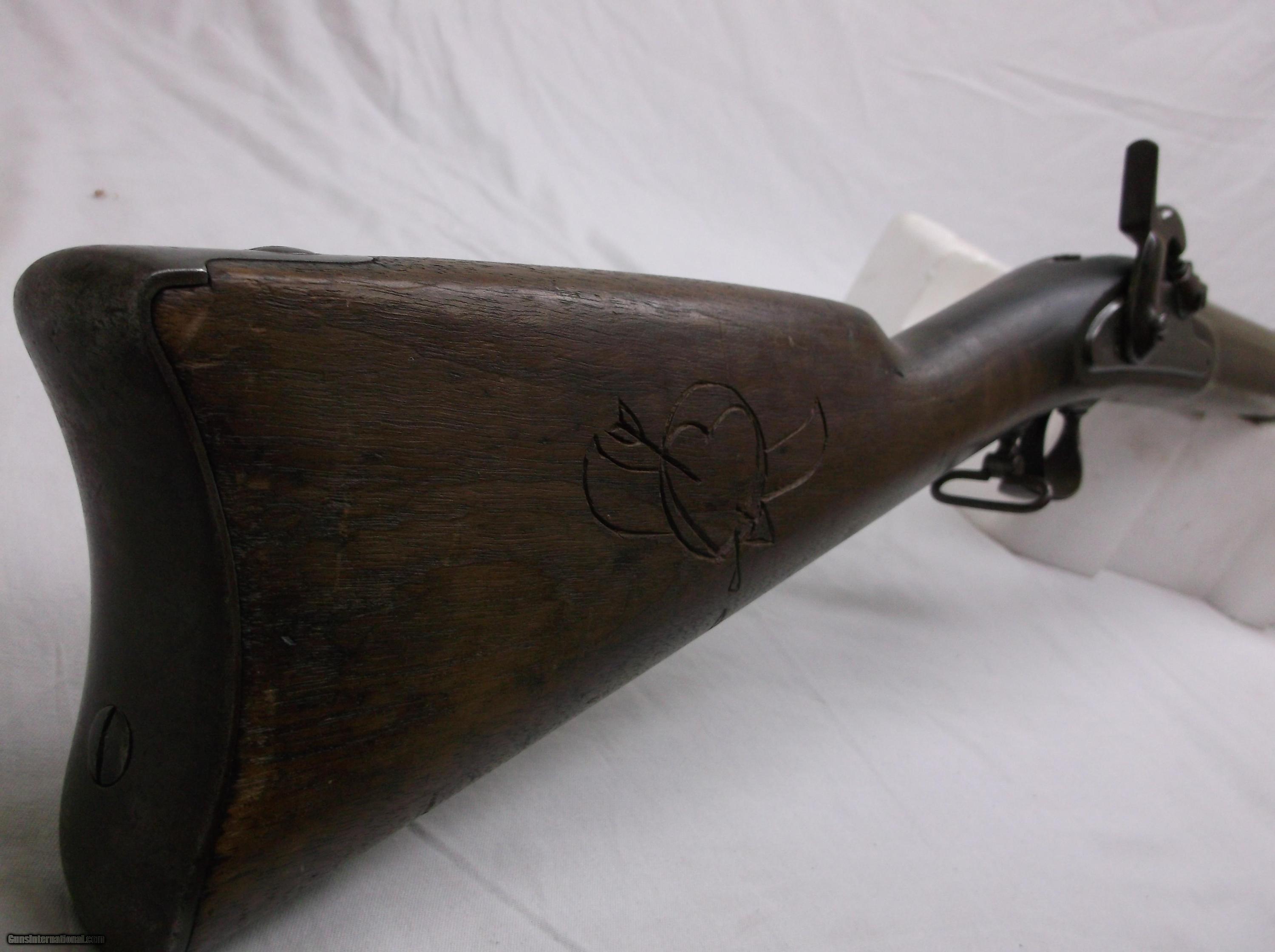 Description: This .58 caliber Original - Model 1862 Springfield 3 Band - Musket has a tapered round 1-1/18" to 3/4" x 40" rifled barrel with a good bore and fitted with an adjustable folding 2 leaf rear sight. Stamped in the breech end of the barrel is 1862. The P grade Walnut stock is fitted with iron furniture, including the metal ramrod. The large military percussion lock with US Springfield 1862 and a spread eagle stamped on the lock plate, is activated by a single trigger.Please Note: The stock is sound except for wood carving in the butt by a previous owner. Light metal pitting on most of the metal parts with some deep pitting on the mid section of the barrel and middle barrel band. Length of pull is 13-1/2". Good wood to metal fit - made by the Springfield Armory. Condition: Good. This items stock number is P-24-27, please use this number when referencing this item. SOLD Manufacturer: Springfiels Armory Caliber Info: .58 cal Chambers: 1 Condition: Good Metal Condition: Good Wood Condition: Good Bore Condition: Good Barrels: 1 |