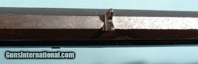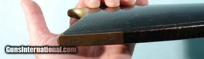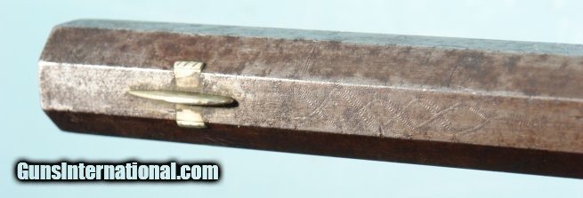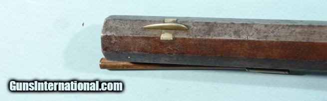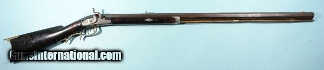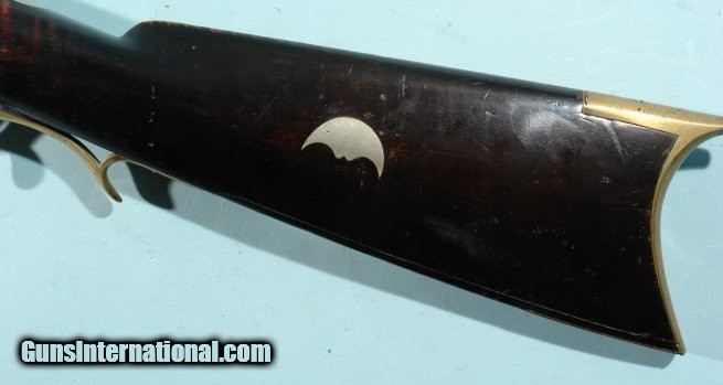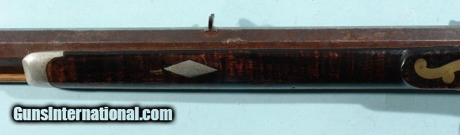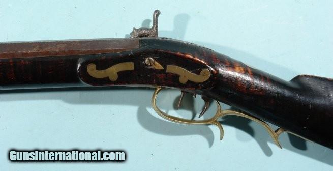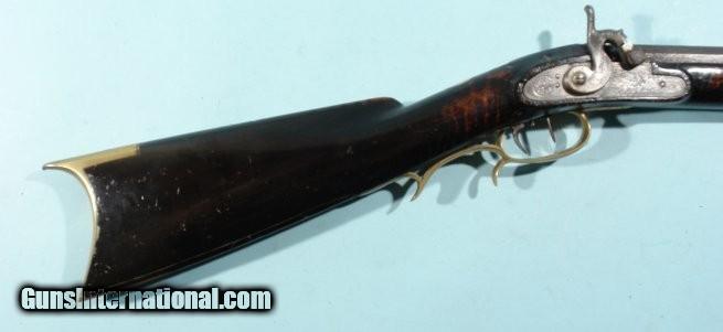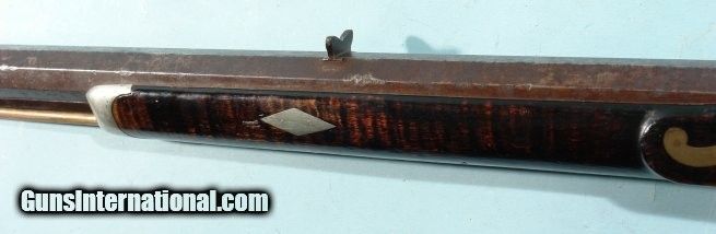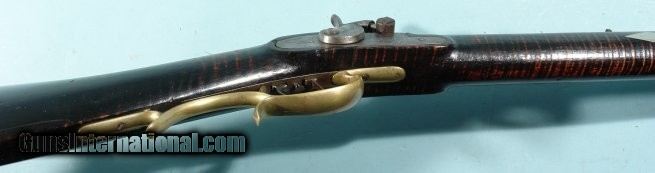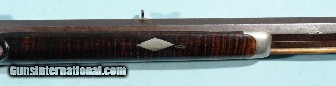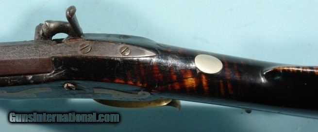 Description: NEW YORK STATE PERCUSSION HALF STOCK PLAINS RIFLE SIGNED REMINGTON CIRCA 1840’S. 34 ½” octagon .36 caliber rifled barrel stamped “REMINGTON” on underside. Tiger maple stock with silver inlaid half-moon face on left butt and silver diamond inlays on forend. Pewter forend cap. Distinctive two-piece brass scroll side plate. Brass mounts and double set triggers. Goulcher signed lock. All original including ramrod. Original brown mixed with patina on metal. Original finish on stock. Small old barely noticeable hairline repair behind barrel tang. Working order and very good bore. SOLD Antique: Yes |