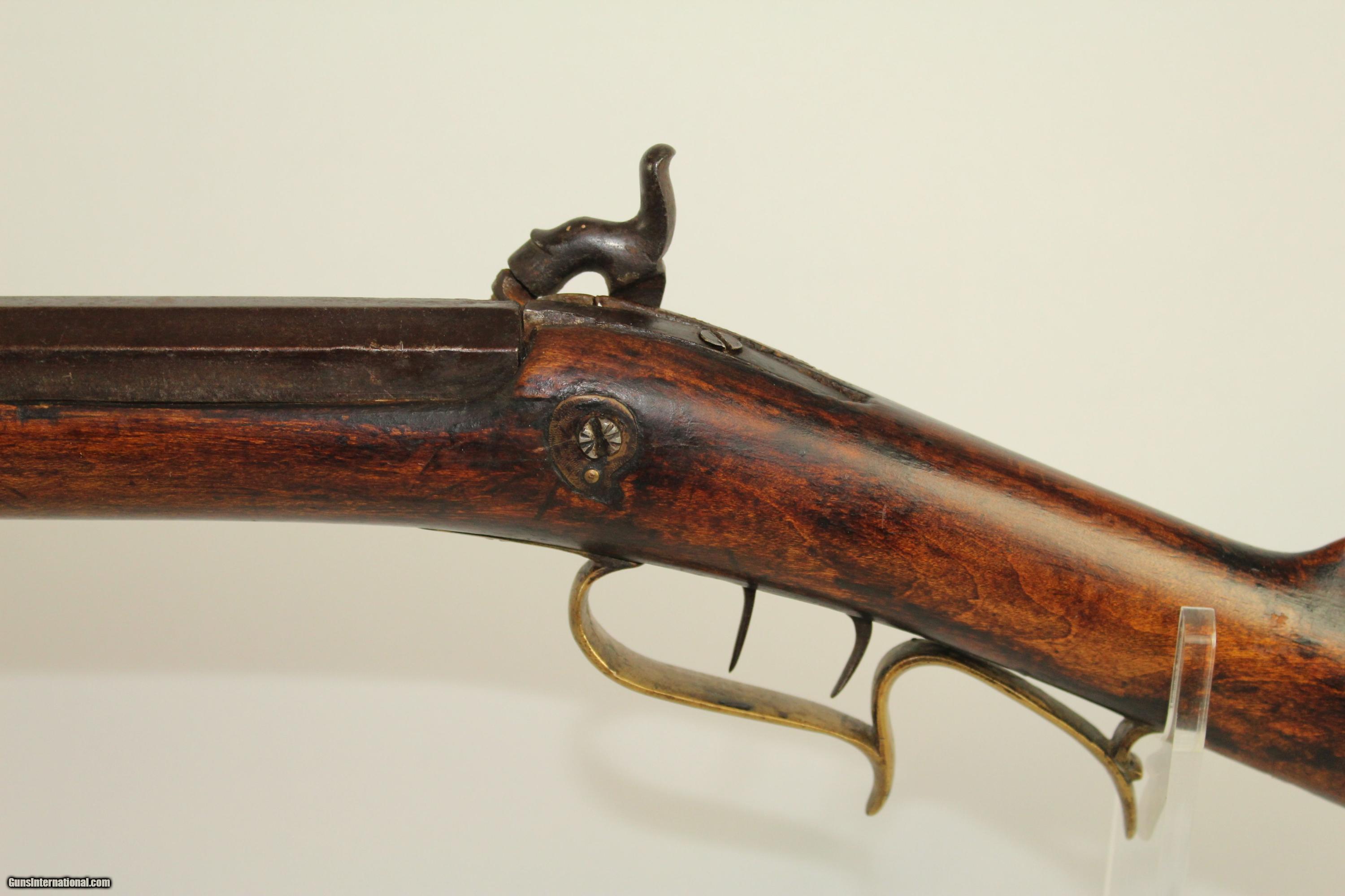 Description: Nice Antique MAKER MARKED Half Stock Plains Rifle Quintessential Pioneer Rifle in .36 Caliber Here we present an antique Half Stock Percussion Rifle, made circa 1840. The American Longrifle, more commonly, but less correctly, known as the 'Kentucky rifle', was described by Captain John G. W. Dillin in the dedication to his seminal 1924 book, The Kentucky Rifle: “From a flat bar of soft iron, hand forged into a gun barrel; laboriously bored and rifled with crude tools; fitted with a stock hewn from a maple tree in the neighboring forest; and supplied with a lock hammered to shape on the anvil; an unknown smith, in a shop long since silent, fashioned a rifle which changed the whole course of world history; made possible the settlement of a continent; and ultimately freed our country of foreign domination. Light in weight; graceful in line; economical in consumption of powder and lead; fatally precise; distinctly American; it sprang into immediate popularity; and for a hundred years was a model often slightly varied but never radically changed.” This .36 caliber rifle features a “JESSE PANNEBECKER” marked barrel. Jesse Pannebecker, which is also found spelled Pannabecker, was a gun maker in Elizabeth Township in Lancaster County, Pennsylvania, during the first half of the 19th Century. The lock is marked “T. __VIDSON & Co./CINCINNATI”, which is almost certainly the work of Tyler Davidson & Co. of Cincinnati, Ohio. The front sight is a brass blade. The rear sight is a semi-buckhorn. Triggers are double set for ultimate accuracy. The overall condition is good. The iron surfaces have a dark, aged patina. The stock is fair, with a metallic addition to the front of the lock. Bore is distinctly rifled and in good condition. The action is functional, with the set trigger having to be pressed to hold cock. Own the original! This is a legitimate antique and not a reproduction. Barrel is 37 inches in length. Caliber: .36 Overall condition as seen in photos. Very Fast. Very Safe. FREE SHIPPING WORLDWIDE. Delivered directly to your door by express mail! Guaranteed AUTHENTIC & Includes CERTIFICATE OF AUTHENTICITY. ancestryguns $1600 #10450 SOLD Antique: Yes |