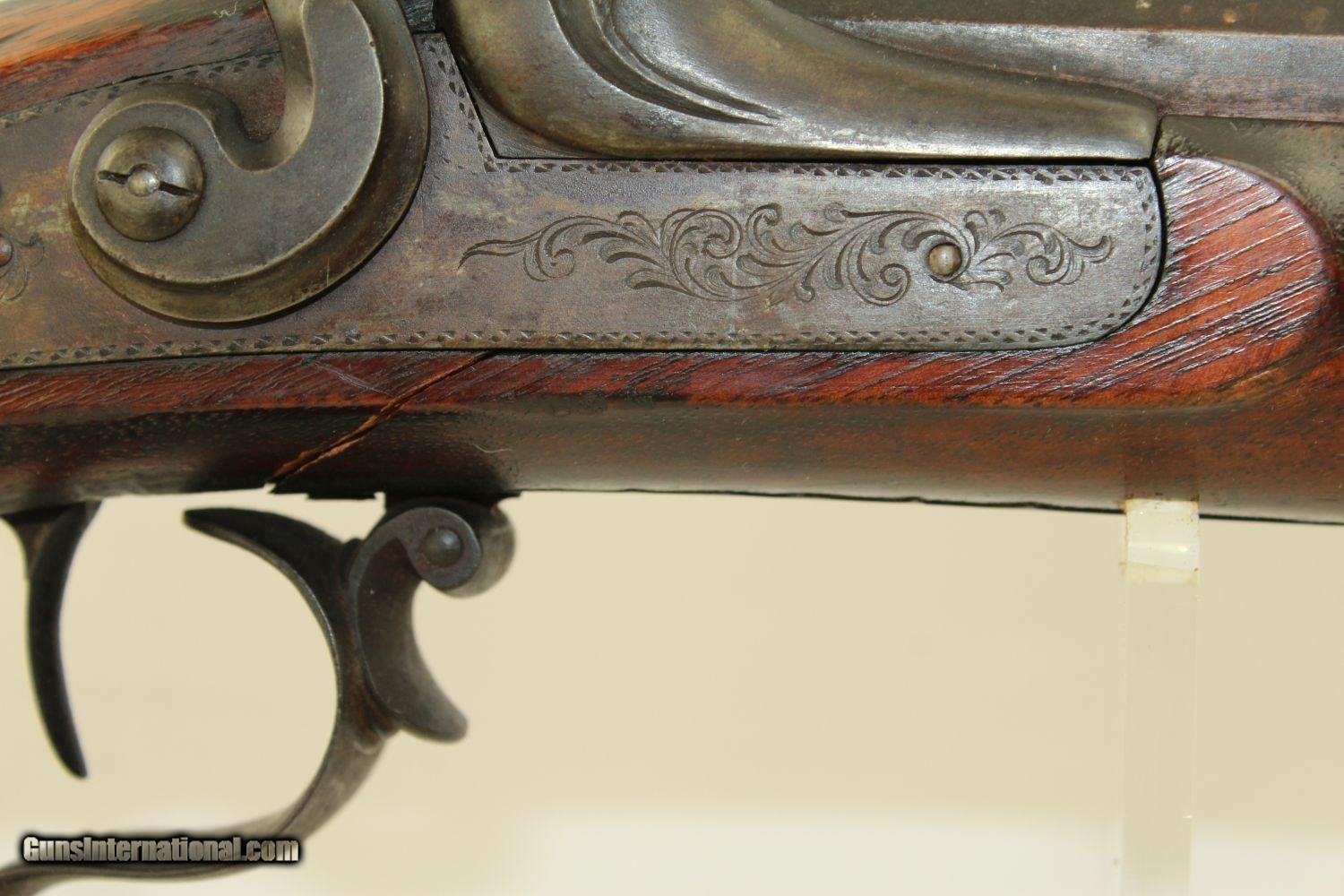 Description: Nice ENGRAVED Schuetzen Percussion TARGET RIFLE 19th Century Long Range Competition Style Rifle Here we present an antique Schuetzen Percussion Target Rifle, made circa 1870 in Switzerland. This rifle features a distinctive butt stock with a generous cheek piece and a Swiss butt plate. Both the grip and the fore grip are sharply checkered. The trigger guard is large and is designed to be used as a pistol grip. This rifle features double set triggers that provide an extremely light and crisp break. The lock is nicely engraved. The barrel is 37-inches long and octagonal with a rifled .48 caliber bore. The front sight is a fine blade with a two-leaf rear adjustable sight behind. This is a fantastic set up for shooting long range and promises to be a lot of fun today. The overall condition is good. The stock has been cracked around the lock as seen in the photos. The bore is clean with strong rifling. The action is excellent, strong and crisp. Own the original! This is a legitimate antique and not a reproduction. Barrel is 37 inches. Caliber: .48 Overall condition as seen in photos. Very Fast. Very Safe. FREE SHIPPING WORLDWIDE. Delivered directly to your door by express mail! Guaranteed AUTHENTIC & Includes CERTIFICATE OF AUTHENTICITY. ancestryguns $1950 #8059 SOLD Antique: Yes |