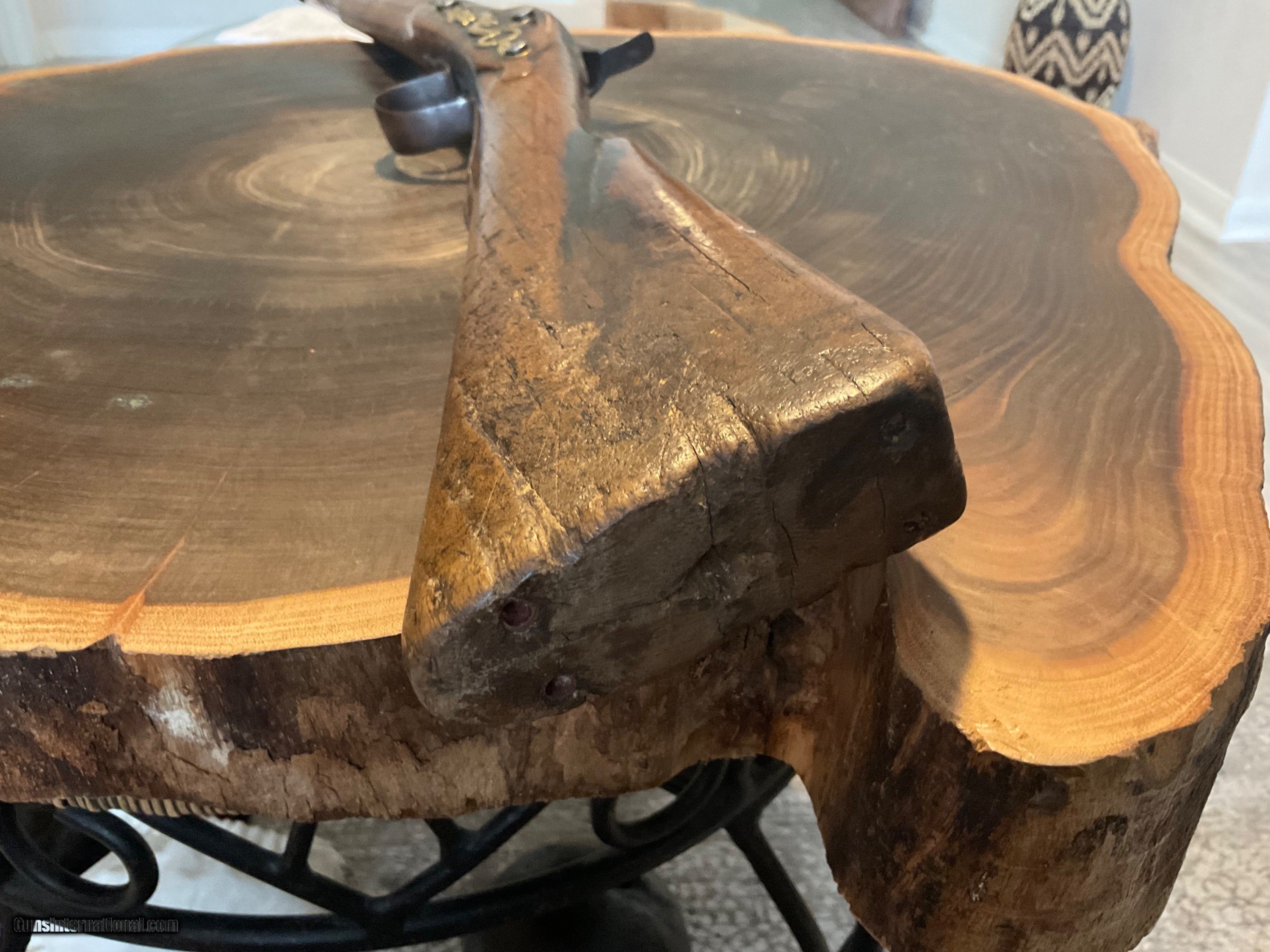 Description: Manufactured between 1861-1900 Northwest Passage Percussion Indian Trade Gun. Many trade guns were shortened like this one when their barrels were damaged or to make them more agile on horseback or in the woods. They were used from the colonial era and into the early 20th century and were the main firearms used by Native Americans through much of American history, including during the American Revolution, Custer's Last Stand, and during the late 19th century Indian Wars. This example has a Enfield style percussion lock and bolster, but otherwise remains mostly like the trade guns built for decades. No front site post, three-stage barrel with no barrel bands and British proofs, "I. HOLLIS & SONS" at the center of the lock and faint "MAKERS TO HER MAJESTY'S/WAR DEPARTMENT" around the "IHS" monogram logo on the tail of the lock, tear drop flats on the sides and breech, large trigger guard, classic Northwest gun serpent side plate, and brass ram rod guide and wooden ram rod. 25 marked on top of barrel with British proof marks. Functions in full and half cock. MIA rear brass plate. Probably used as a hide scraper. Rating Definition: Fair overall as period shortened to approximately 41 inches with a mix of gray and brown patina, mild pitting concentrate around the breech, minor cracks at the lock mortise and throughout the stock, flash wear above the hammer, and percussion cap. Very cool piece overall with lots of use! SOLD Antique: Yes |