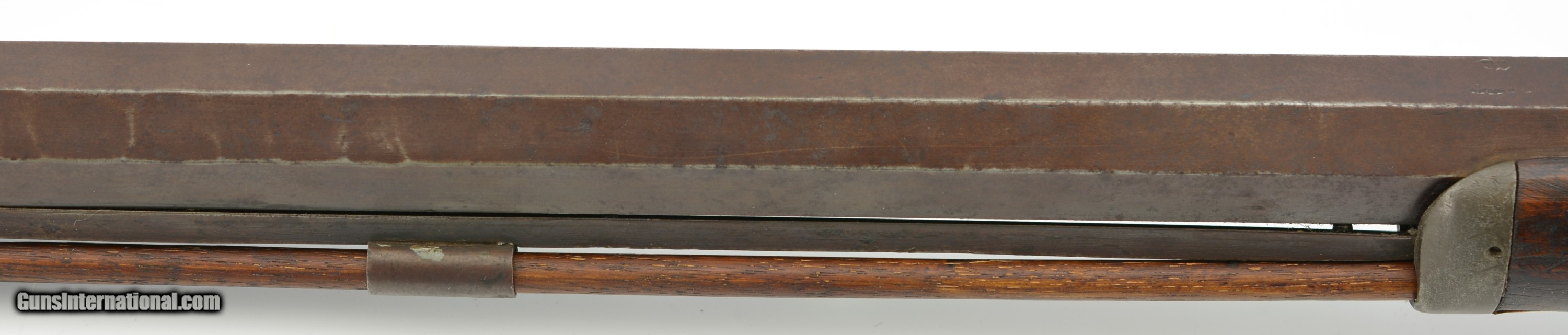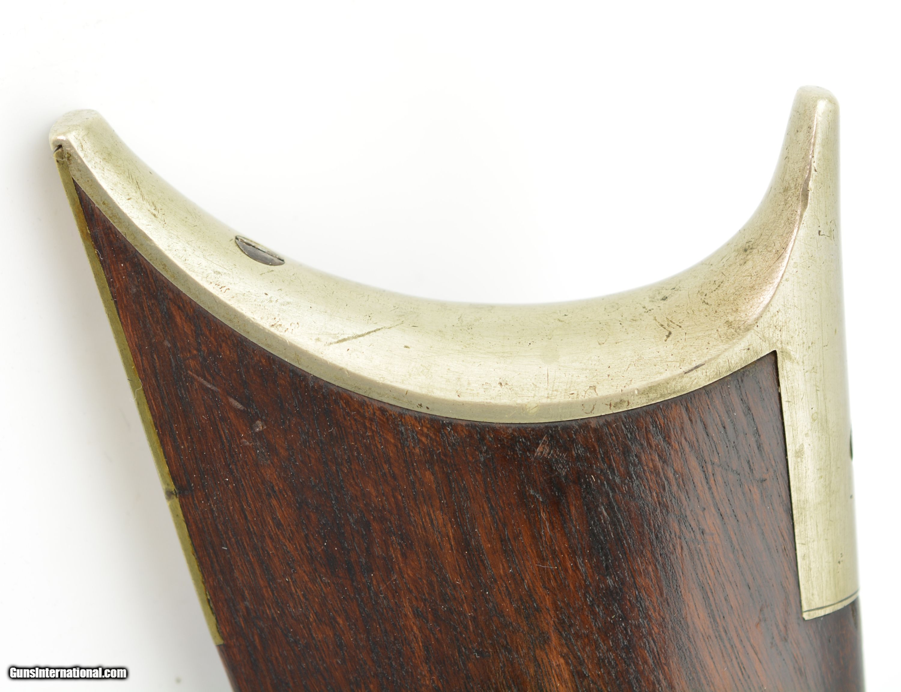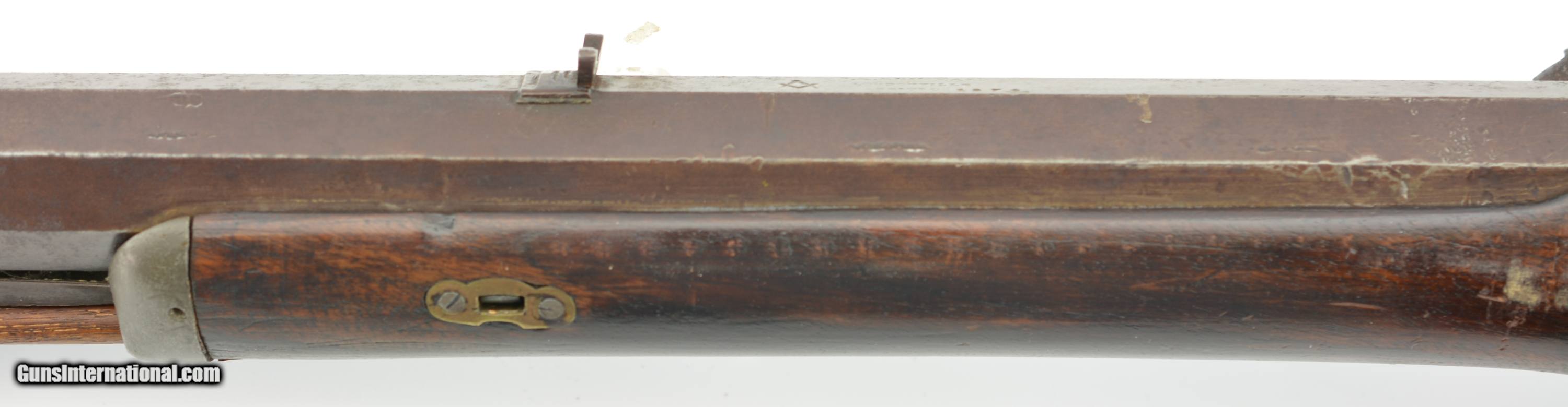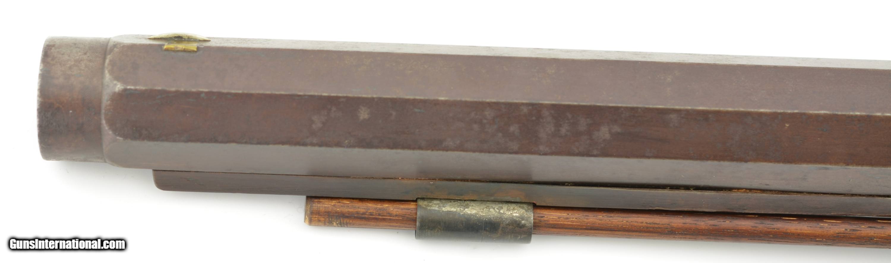 Description: NSN, approximately .48 cal., 31 1/2" heavy octagon barrel with a fair, dark bore. This is an imposing rifle that has an overall mottled plum-brown patina on the barrel, with some trace silvering along the flats. The barrel is turned for a bullet-starter (not included), and fitted with simple iron sights. The tang has a plate for mounting an aperture sight on the wrist tang, but no sight is present. The top flat is maker marked: "(Masonic square and compass) / P.A. REINHARD / LOUDONVILLE / ASH. CO. O. / 1874" (Peter Albert Reinhard was active in Loudonville, Ohio from 1848-1890, before moving to Dayton). The simple back-action lock has an overall pewter gray patina, and the rifle is fitted with double-set triggers, a single spur German silver trigger guard, crescent buttplate, and a brass toeplate. The wedge-fastened walnut stock has a pewter forend tip, and has numerous small handling marks and blemishes marring the refinished wood. Additionally, there are some small, with-the-grain drying cracks scattered about as well. A wooden ramrod is included, and the rifle rates good-near very good overall. Antique SOLD Antique: Yes Manufacturer: Reinhard Model: Spoirting Rifle Caliber Info: .48 Gauge Info: .48 |