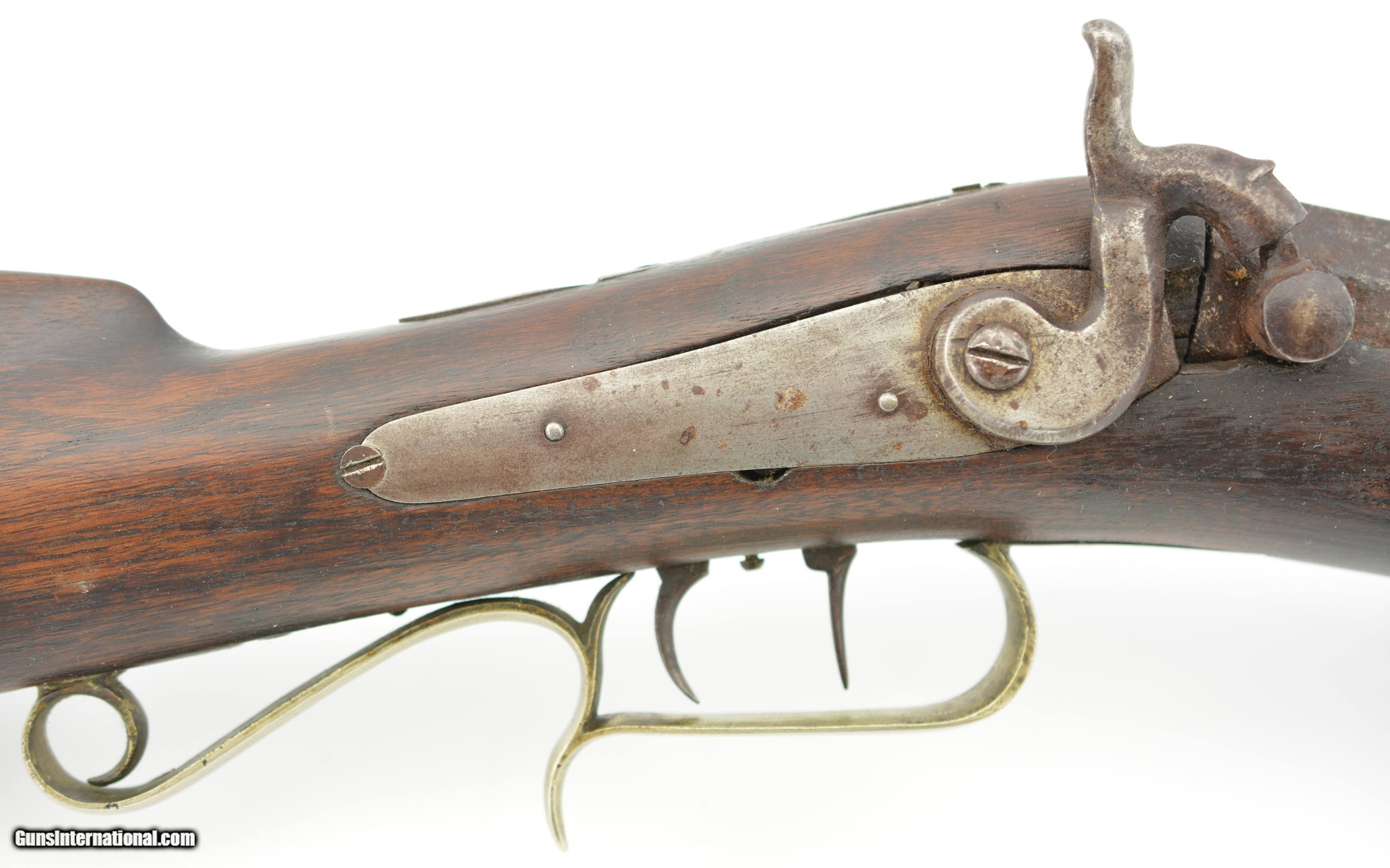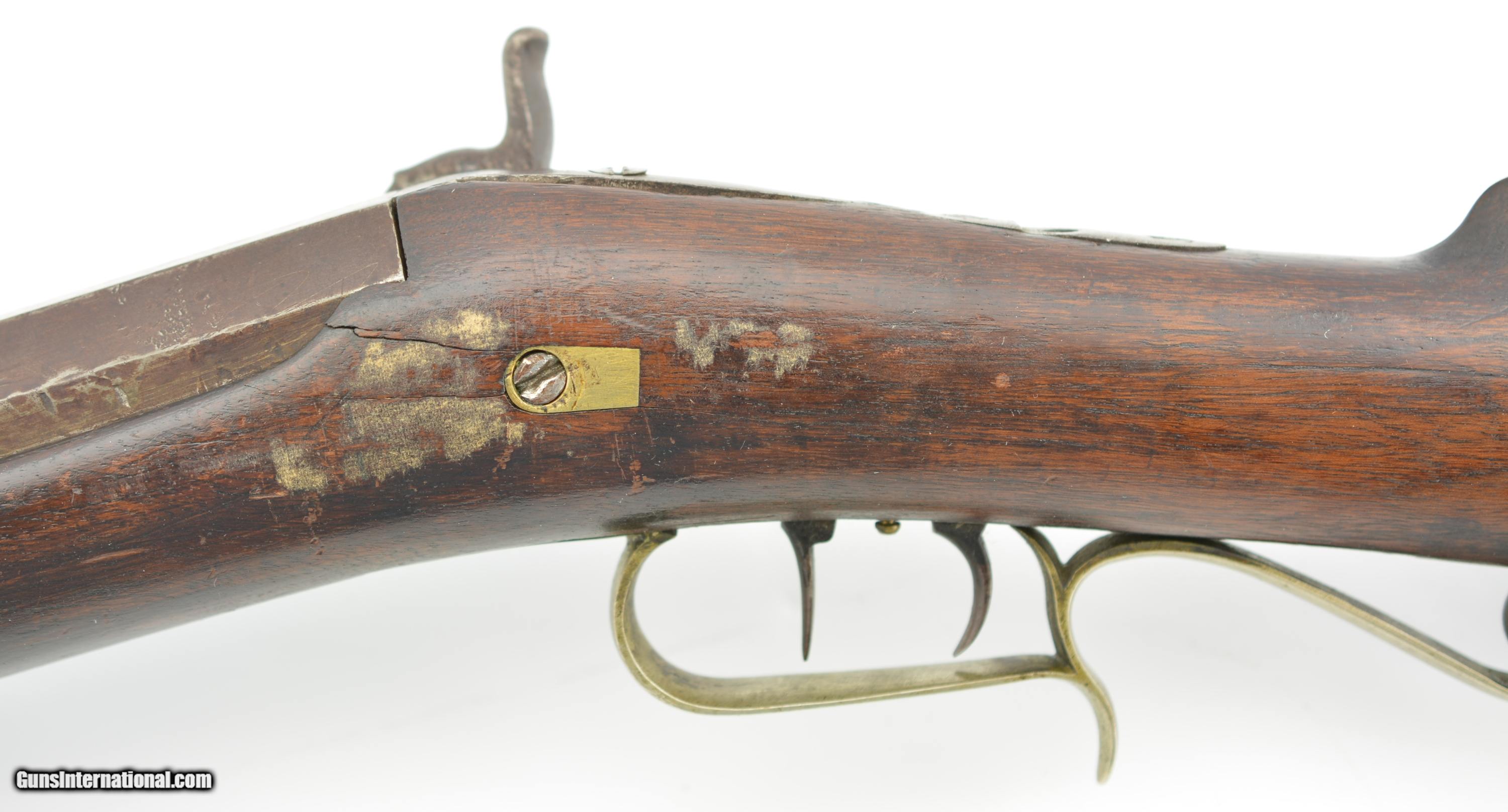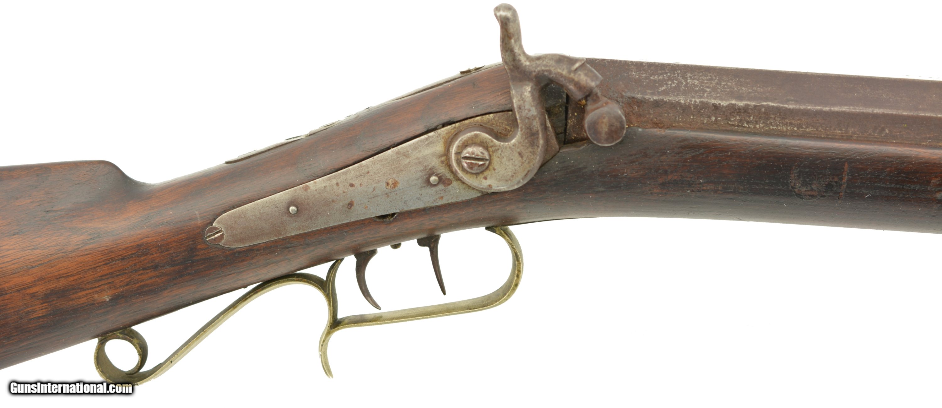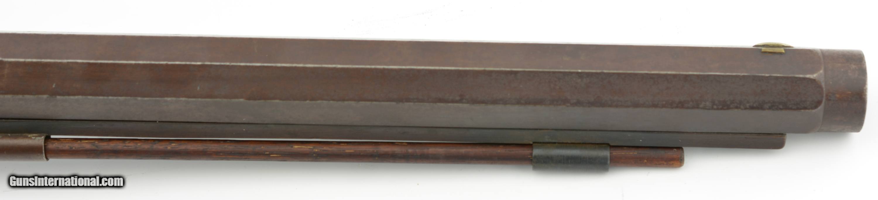 Description: NSN, approximately .48 cal., 31 1/2" heavy octagon barrel with a fair, dark bore. This is an imposing rifle that has an overall mottled plum-brown patina on the barrel, with some trace silvering along the flats. The barrel is turned for a bullet-starter (not included), and fitted with simple iron sights. The tang has a plate for mounting an aperture sight on the wrist tang, but no sight is present. The top flat is maker marked: "(Masonic square and compass) / P.A. REINHARD / LOUDONVILLE / ASH. CO. O. / 1874" (Peter Albert Reinhard was active in Loudonville, Ohio from 1848-1890, before moving to Dayton). The simple back-action lock has an overall pewter gray patina, and the rifle is fitted with double-set triggers, a single spur German silver trigger guard, crescent buttplate, and a brass toeplate. The wedge-fastened walnut stock has a pewter forend tip, and has numerous small handling marks and blemishes marring the refinished wood. Additionally, there are some small, with-the-grain drying cracks scattered about as well. A wooden ramrod is included, and the rifle rates good-near very good overall. Antique SOLD Antique: Yes Manufacturer: Reinhard Model: Spoirting Rifle Caliber Info: .48 Gauge Info: .48 |