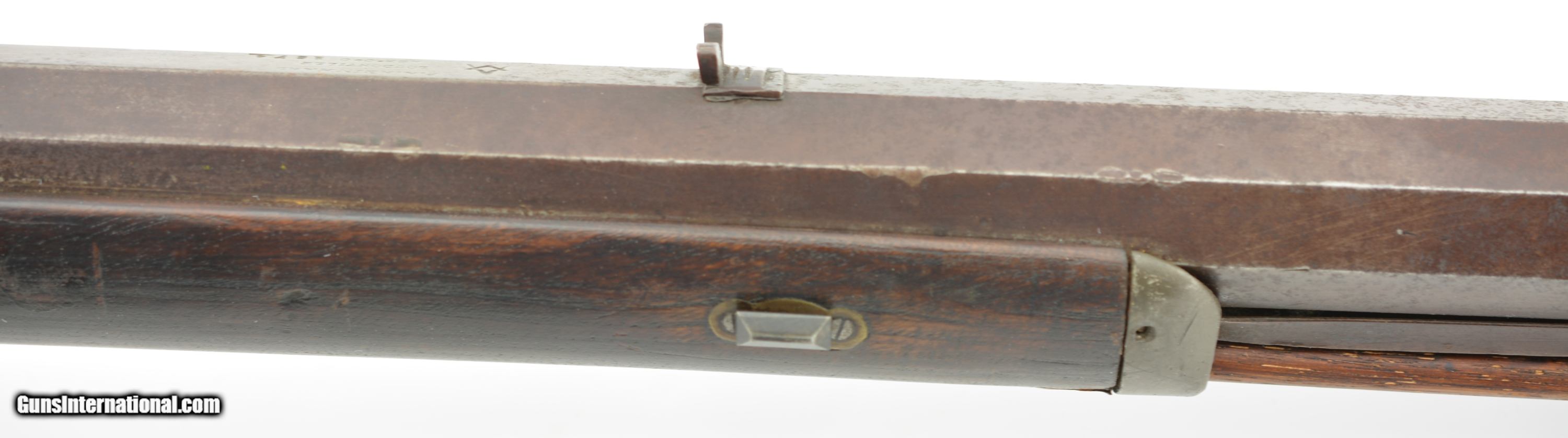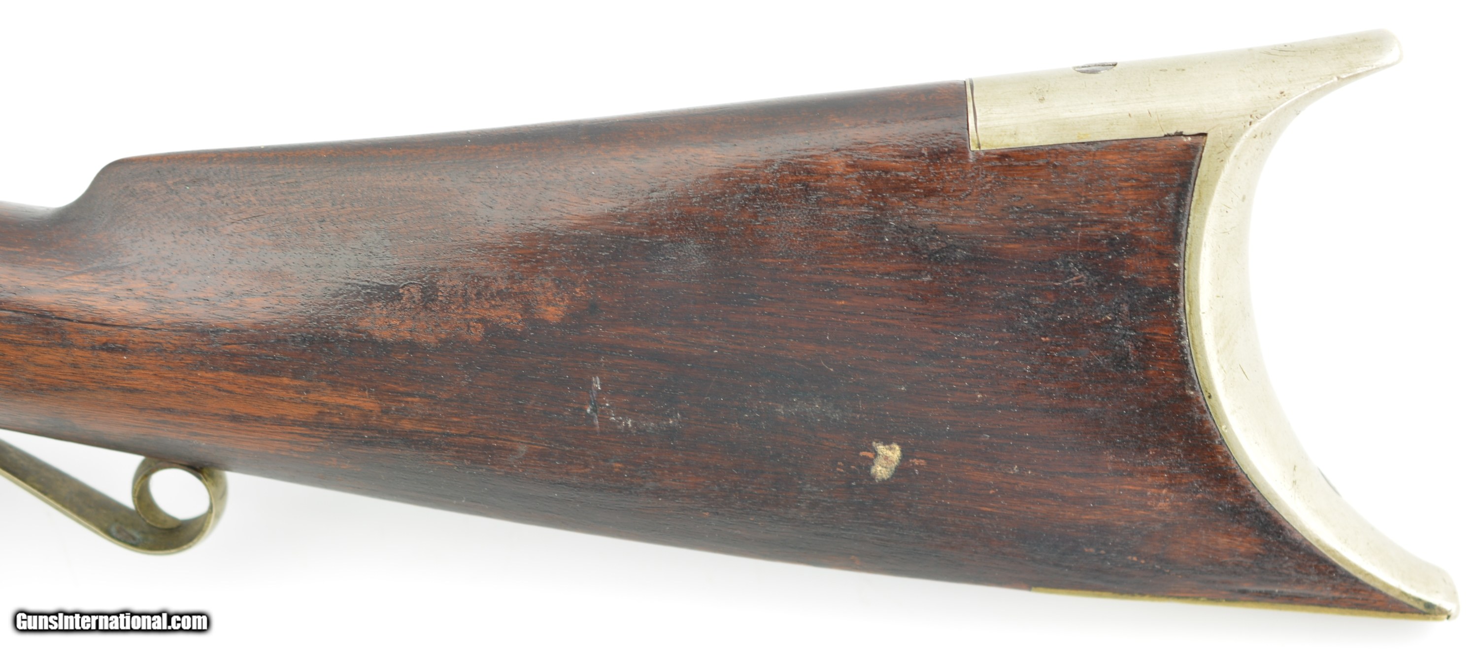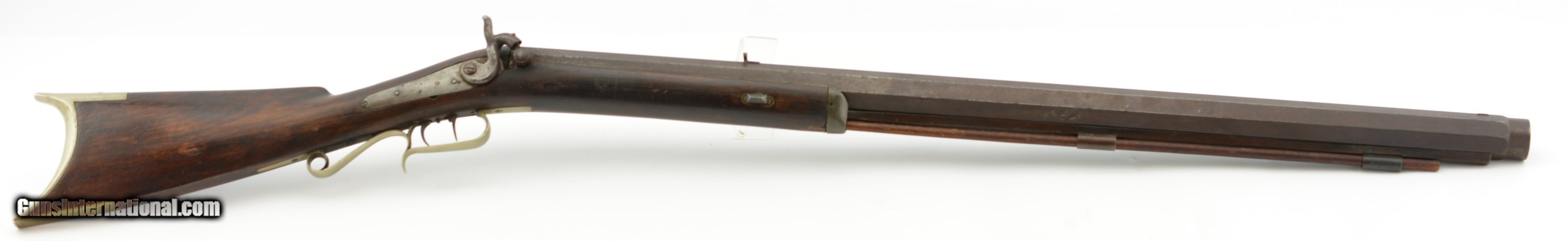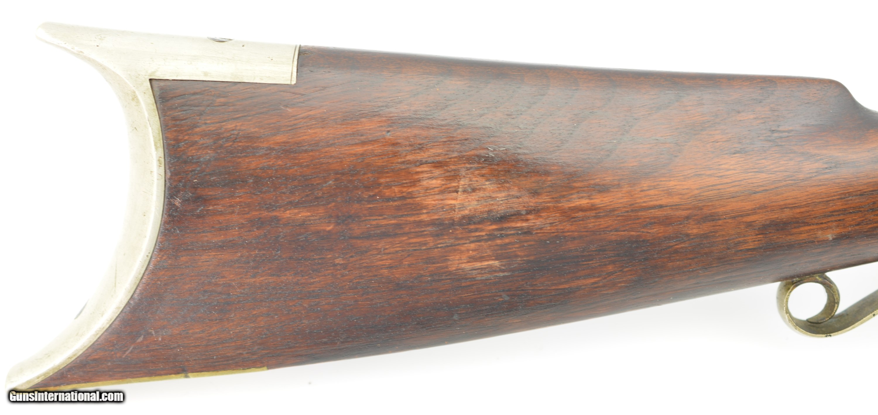 Description: NSN, approximately .48 cal., 31 1/2" heavy octagon barrel with a fair, dark bore. This is an imposing rifle that has an overall mottled plum-brown patina on the barrel, with some trace silvering along the flats. The barrel is turned for a bullet-starter (not included), and fitted with simple iron sights. The tang has a plate for mounting an aperture sight on the wrist tang, but no sight is present. The top flat is maker marked: "(Masonic square and compass) / P.A. REINHARD / LOUDONVILLE / ASH. CO. O. / 1874" (Peter Albert Reinhard was active in Loudonville, Ohio from 1848-1890, before moving to Dayton). The simple back-action lock has an overall pewter gray patina, and the rifle is fitted with double-set triggers, a single spur German silver trigger guard, crescent buttplate, and a brass toeplate. The wedge-fastened walnut stock has a pewter forend tip, and has numerous small handling marks and blemishes marring the refinished wood. Additionally, there are some small, with-the-grain drying cracks scattered about as well. A wooden ramrod is included, and the rifle rates good-near very good overall. Antique SOLD Antique: Yes Manufacturer: Reinhard Model: Spoirting Rifle Caliber Info: .48 Gauge Info: .48 |
