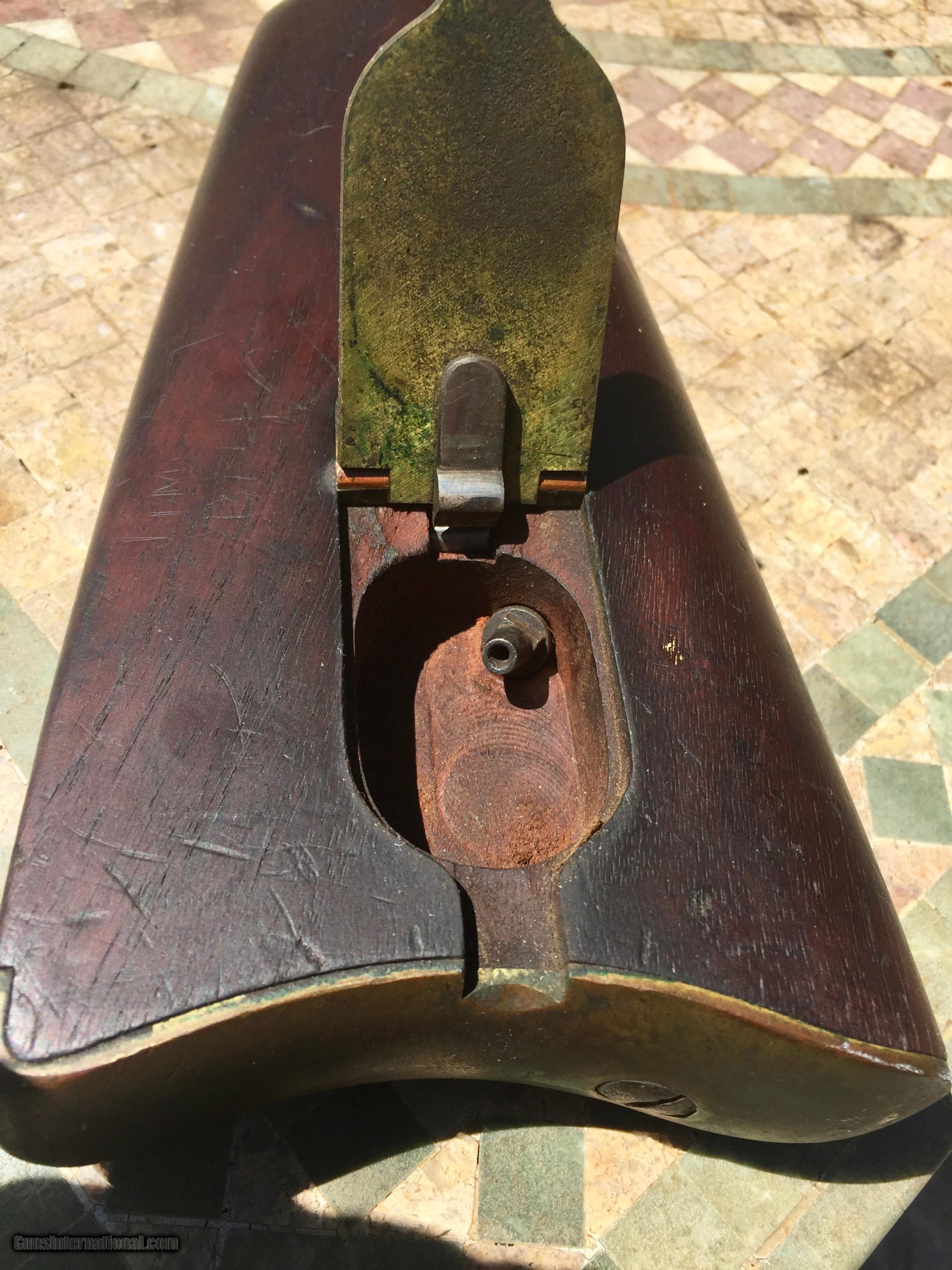 Description: Original 1863 Remington Zouave rifle: This Civil War rifle is in “as found” condition with blue brown barrel, taffy color untouched brass mounts, and dull brown lock with good markings. There is light to medium pitting near the breech on the left side. Bore is good but needs cleaning. The stock is full dimension with sharp edges and visible inspector’s marks. Hammer has been polished. Action is crisp. Nipple still inside of patchbox. Original ramrod. An example of the most attractive Civil War period rifles and priced far under market at 1050 dollars. SOLD Antique: Yes Manufacturer: Remington Model: Zouave Serial Number: NSN |
