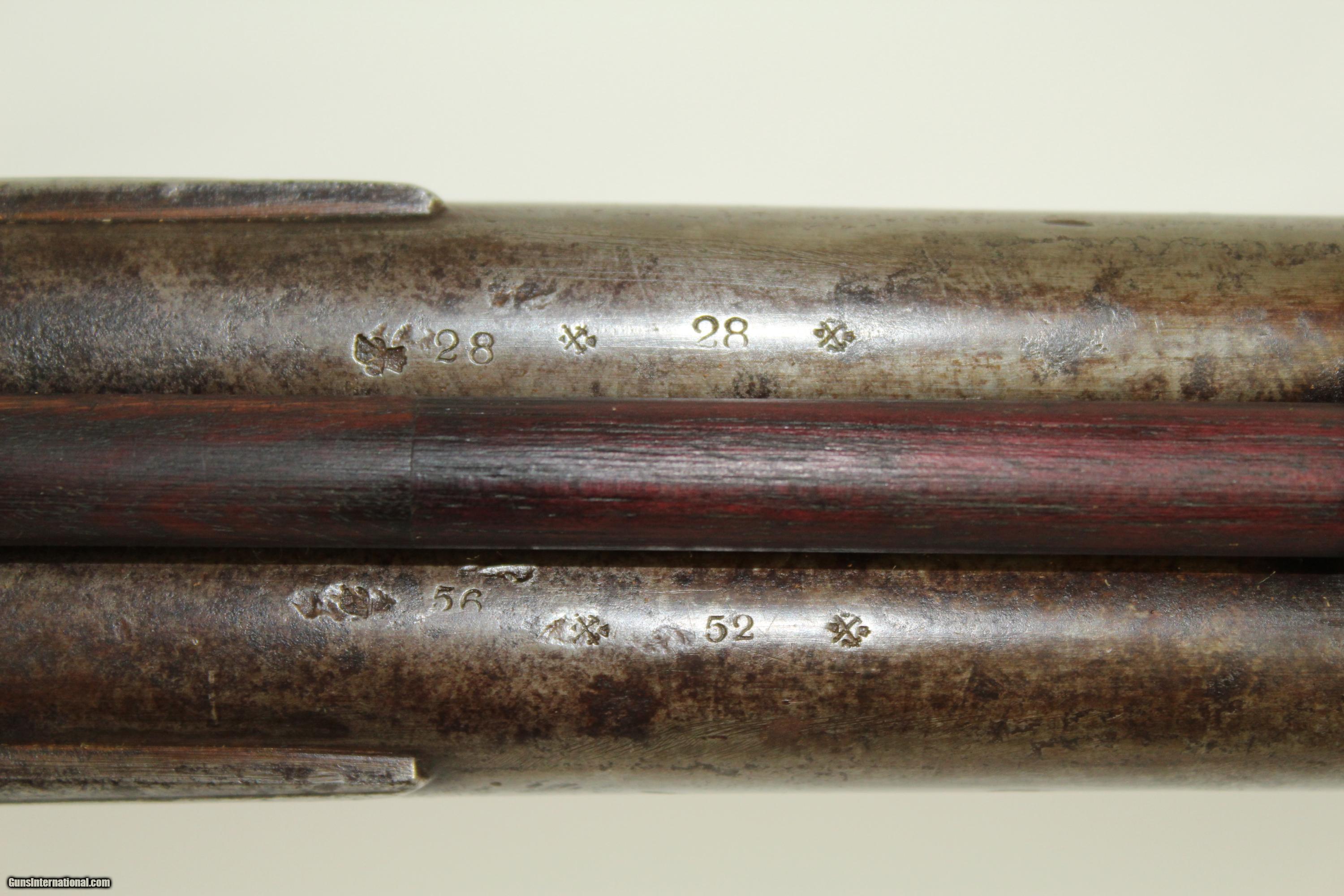 Description: Antique English William Powell & Son Percussion Combination Gun Cased & with Full Array of Accoutrements Here we present an antique William Powell & Son Percussion Combination Gun, shipped to the buyer from the Powell shop in Birmingham, England on January 31st, 1866. The Powell business of fine arms manufacture began in 1802, and the business lives on today. A clue to our buyer is on both the gun and the ledger that comes with it: “Gro de Klerk” is the name engraved on the escutcheon on the left side of the stock, and the name also appears in the ledger with the matching serial number to this gun. This is a Dutch name, which comes as no surprise when you consider that such guns were made for safari and were popular in South Africa. The Dutch, of course, colonized South Africa in the 1650s and were at the head of its government until the late 20th century. In fact, the 7th and last state president of South Africa was F.W. de Klerk, who came from a long line of de Klerks. This takedown gun is a side by side combination of a rifled bore and a smooth bore, ideal for hunting multiple quarry when one can only take one firearm. The left barrel has two groove rifling and is .50 caliber, while the right barrel is smooth and 29 bore. It has two triggers, the left of which is a “hair” trigger or a set trigger. The primary sights are a rear notch and front post, but there is also a ladder sight that goes out to 400 yards, a series of flip-up leaf sights, and then graduations on the barrel itself up to 17. The removable ladder sight simply slips over the muzzle and onto a track that ends just ahead of the foremost leaf sight. The ladder sight can be moved toward the breech or muzzle using the marks on the barrel rib for very long shots. The attached article features a similar rifle by Joseph Bourne of London, and explains the misconceptions and the actual use of such a system. The ladder sight has its own special compartment, just ahead of the patch box in the right side of the stock. Trigger guard comes back to form a pistol grip under the straight wrist. This specimen is very beautifully finished and engraved. The maker, William Powell & Son, is marked on both sides of the frame and the top of the barrel rib. The rib is one inch in width. The frame, hammers, patch box and sight box, as well as all other metal parts are masterfully engraved with intricate scroll work. Case colors are still vibrant on the inside of the sight box door. Flip-up leaf sights maintain their gold center line, with one exception. Includes a sling mount on the barrel and one under the stock. Barrels show Birmingham proofs underneath. Condition is overall very good. This has been very well kept for the last 150 years. The stock has nice figure and is in fine condition with the exception of a hairline crack at the wrist. This is most visually noticeable on the right view of the gun, but is not noticeable when holding the gun. It does not move and I would have no qualms shooting the gun. Checkering is excellent and sharp. Oiled finish. Patch box, sight box, lock and barrel all share the same gray patina and are intricately engraved. Bores are in fine condition. Action is excellent. Set trigger is functional. Removable ladder sight, barrels, stock and bullet mold bear all matching numbers. This double gun comes with the original wooden case with the William Powell & Son label bearing their High Street, Birmingham address. It is green felt lined. Comes with a bullet mold for both round ball and conical ball that is numbered to the gun. Several examples of the mold’s products are also included. Also includes an oiler, patch and cap containers, bullet starter, key to the case and a large Dixon & Sons adjustable measure powder flask. Finally, this fine piece comes with two pages out of the ledger William Powell that lists this gun among several others custom ordered by Short, Short & Co. It lists the serial number, inscription and the gun’s features. Here is a very beautiful gun with a distinguished beginning, notable features, and an interesting background. Own the original! This is a legitimate antique and not a reproduction. Nothing else quite like it found worldwide. Barrel is 31.5 inches in length (from hooks to muzzle). Caliber: left bore has 2 grooves and is .50; right bore is smooth and 29 bore Bores are in fine condition and the firing mechanism is excellent. Overall condition as seen in photos. Here is a very refined percussion gun custom-made for Africa. Very Fast. Very Safe. FREE SHIPPING WORLDWIDE. Delivered directly to your door by express mail! Guaranteed AUTHENTIC & Includes CERTIFICATE OF AUTHENTICITY. ancestryguns $7000 #10310 SOLD Antique: Yes |