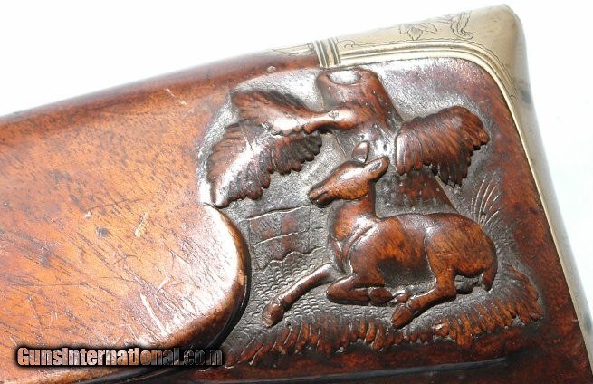 Description: ORNATE GERMAN SILVER MOUNTED PERCUSSION DOUBLE RIFLE SIGNED MORGENROTH IN GERNRODE CA. 1830. 45” o/a with 29 ½” double octagon .60 cal. smoothbore barrels inlaid with the maker’s name and town in silver. Ornate German silver mounts with game scene engraving. Walnut stock with game scene and floral relief carving and a sliding wood patch box. Sterling silver engraved wrist plate with script monogram (JM). Engraved locks and hammers and rotatinhg nipple guards one of which is lost. Barrels silver inlaid and with hand applied stippled and floral matting. Original early percussion era and may date to the late 1820’s. Very good and all original. Original metal patina and stock finish. Working order and good bores. Original ramrod. High quality and very handsome. The Morganroth family of gun makers spanned several generations in Gernrode, Anhalt, Germany. SOLD Antique: Yes |