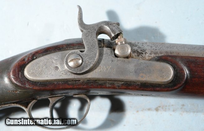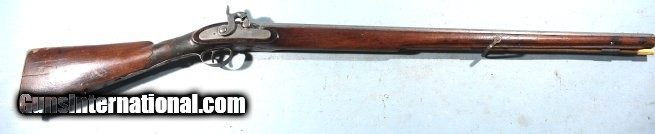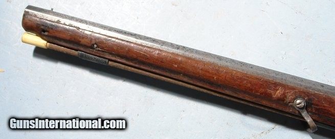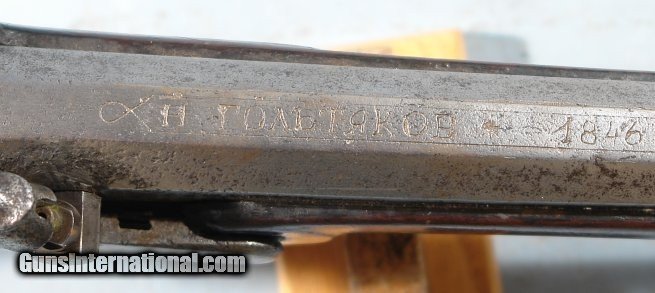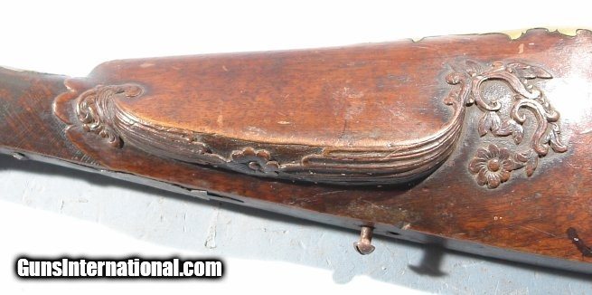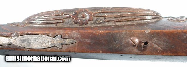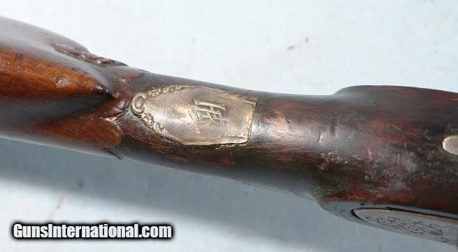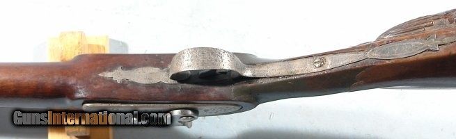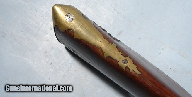 Description: RUSSIAN PERCUSSION .65 CALIBER SMOOTHBORE SP0RTING GUN SIGNED BY THE MAKER AND DATED 1847. 45” o/a with 29” octagon barrel signed n Cyrillic on the top flat with the maker’s name and dated 1847. Lock plate dated 1846 and lightly floral engraved. Full length walnut stock in the German manner with ornate brass butt plate and fancy cheek rest with complimentary floral raised carving. Silver wrist escutcheon with entwined monogram. Very good overall with grey metal and stock with the original old finish. Has old well done repair at the wrist-very hard to see. Old bone tipped wood rod. Working order with a dark bore. We seldom see antique Russian sporting arms. SOLD Antique: Yes |