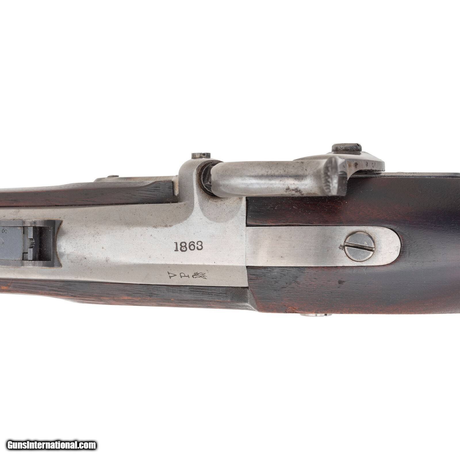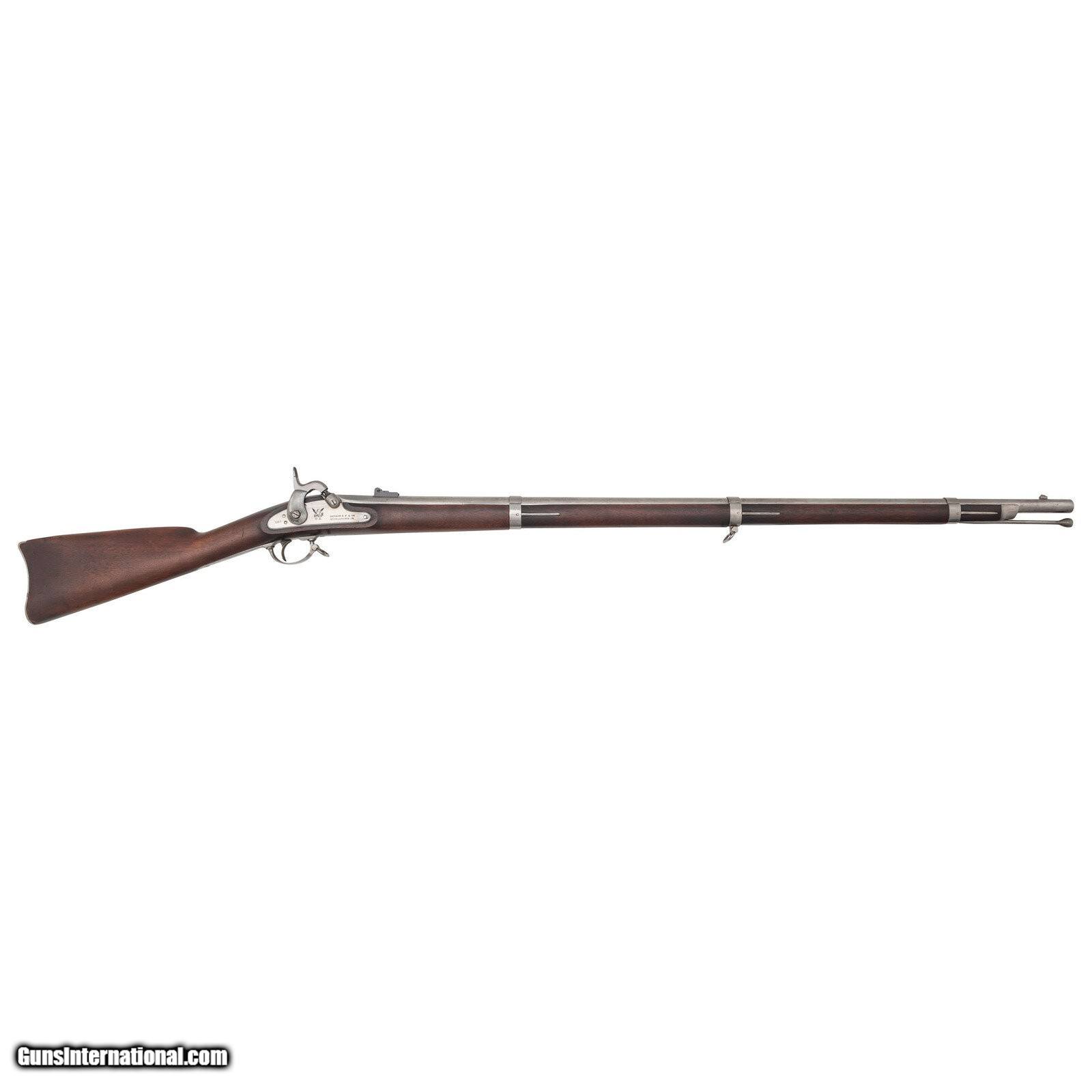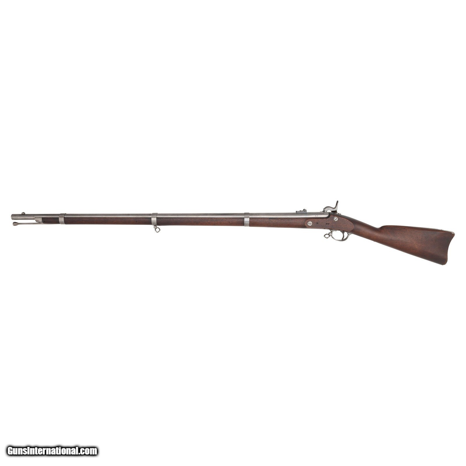 Description: EXCELLENT, LIKELY UNISSUED!... .58 caliber. 40" barrel secured by three flat, spring retained bands. NSN. Bright finish, iron furniture, full-length walnut musket stock. Single shot percussion muzzleloading rifle musket with M1861 three leaf rear sight, Barleycorn combination front sight and socket bayonet lug, sling swivels and swelled shank tulip head ramrod. Lock marked with a {Spread Winged Eagle}/U.S. and in two lines SAVAGE R.F.A. Co./MIDDLETOWN, Ct. forward of the hammer. Dated 1863 at tail of lock and 1863 on top of breech. Standard V/P/{Eagle Head} proofs on breech. The left barrel flat is stamped NJ and the counterpane has a deep block NJ mark as well, both indicating State of New Jersey purchase and ownership. Near Fine. Bore fine and bright with crisp rifling and light oxidation. Metal lightly cleaned with some scattered freckles of oxidation and age discoloration. Some small areas of scattered pitting are present, mostly on the reverse of the hammer. Markings remain clear and crisp. Mechanically functional lock. Wood crisp with sharp edges and some lightly scattered bumps, dings and mars. CONDITION: UNISSUED?.... Bore very fine and bright with crisp rifling and light oxidation. Metal lightly cleaned with some scattered freckles of oxidation and age discoloration. Markings remain clear and crisp.Strong functional lock. Wood crisp with sharp edges and some old scratches to left of lockplate. Otherwise, excellent wood. ...2nd firearm ships FREE, with this one!....S/H $65..Thanks, 422-26 INSURANCE IS EXTRA...I AM NOT RESPONSIBLE FOR LOST or DAMAGED PACKAGES....Thanks Greg , Antique: Yes Manufacturer: Savage Model: 1861 Price: $2,299.00 Buy Now Contact Seller |