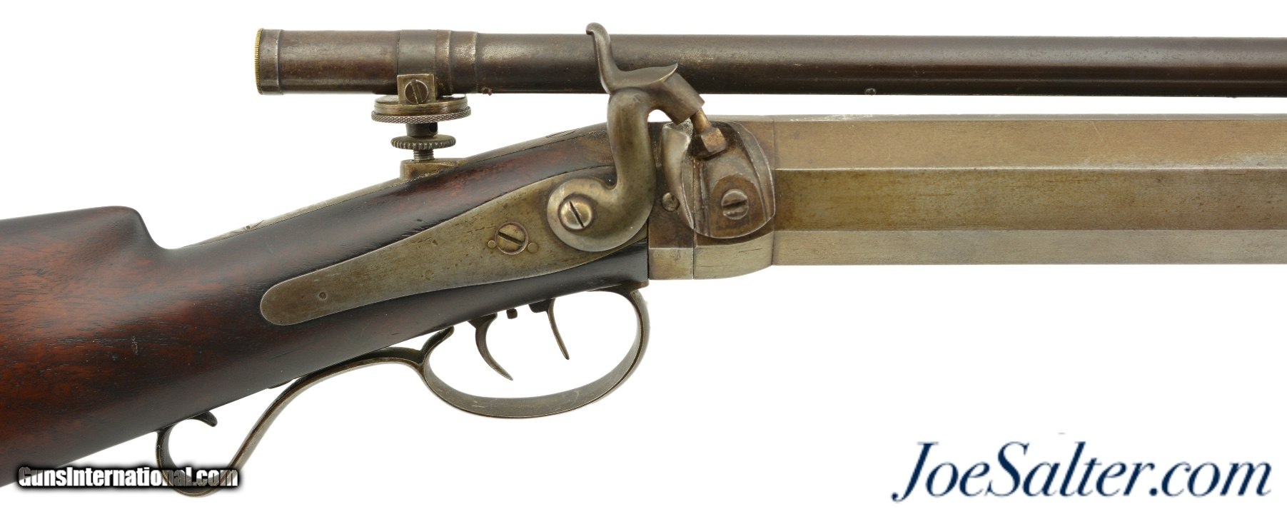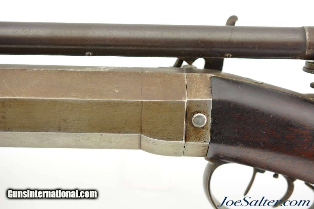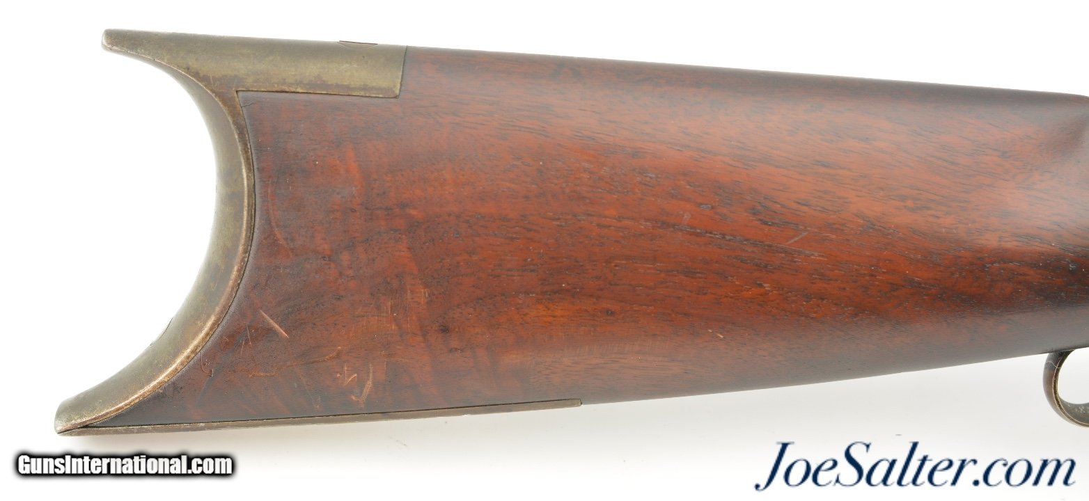 Description: NSN, .52 Caliber, 30" heavy octagon barrel with gain-twist rifling and an excellent, bright bore. This is a splendid, New Hampshire-made target rifle that has mottled gray-brown patina along the "W.W. WETMORE / LEBANON, N.H." marked barrel, and a more plum-brown patina on the false muzzle, which is recessed for use with either a linen or paper cross patch (he is referred to in "The Muzzle-Loading Cap Lock Rifle" by Ned Roberts {1958} as, along with George Schalk, being one of the few American gunmakers who made rifles adapted in that manner). The robust back-action lock and trigger guard have a matching gray-brown patina as well. Some mild surface oxidation is present on and around the nipple and bolster. The rifle has a drilled and tapped hole on the underside for mounting a no longer present barrel rest, and is equipped with an unmarked period telescopic sight that has good, if slightly dim optics, and an intact crosshair reticle. No provision for iron sights are present. The walnut buttstock is in fine shape with few handling marks in the original oil finish, and there is a dark brown patina on the steel buttplate. The action is fully functional with a smooth light pull on the double-set trigger, and weighs 22 lbs. 13 oz. without the false muzzle installed. W.W. Wetmore (or Whetmore, as his name is sometimes spelled) operated from approximately 1870 & 1895, first in Lebanon, NH, and then in Windsor, VT. He was well-known for making precision gain-twist rifles, and this example is in fine overall condition. Antique SOLD Antique: Yes |