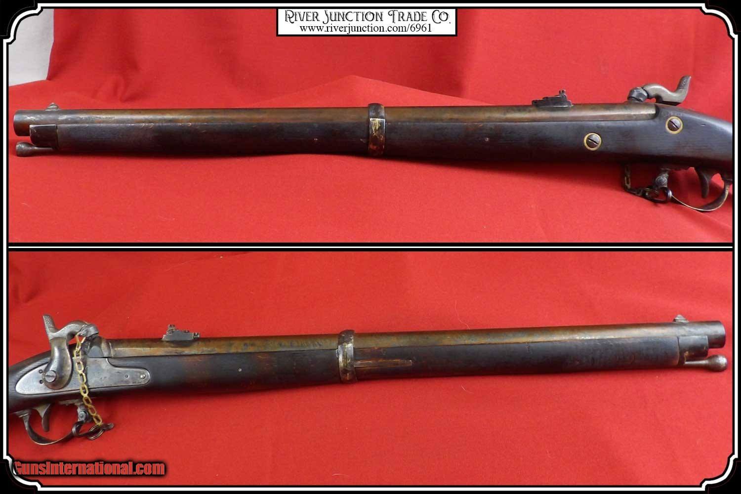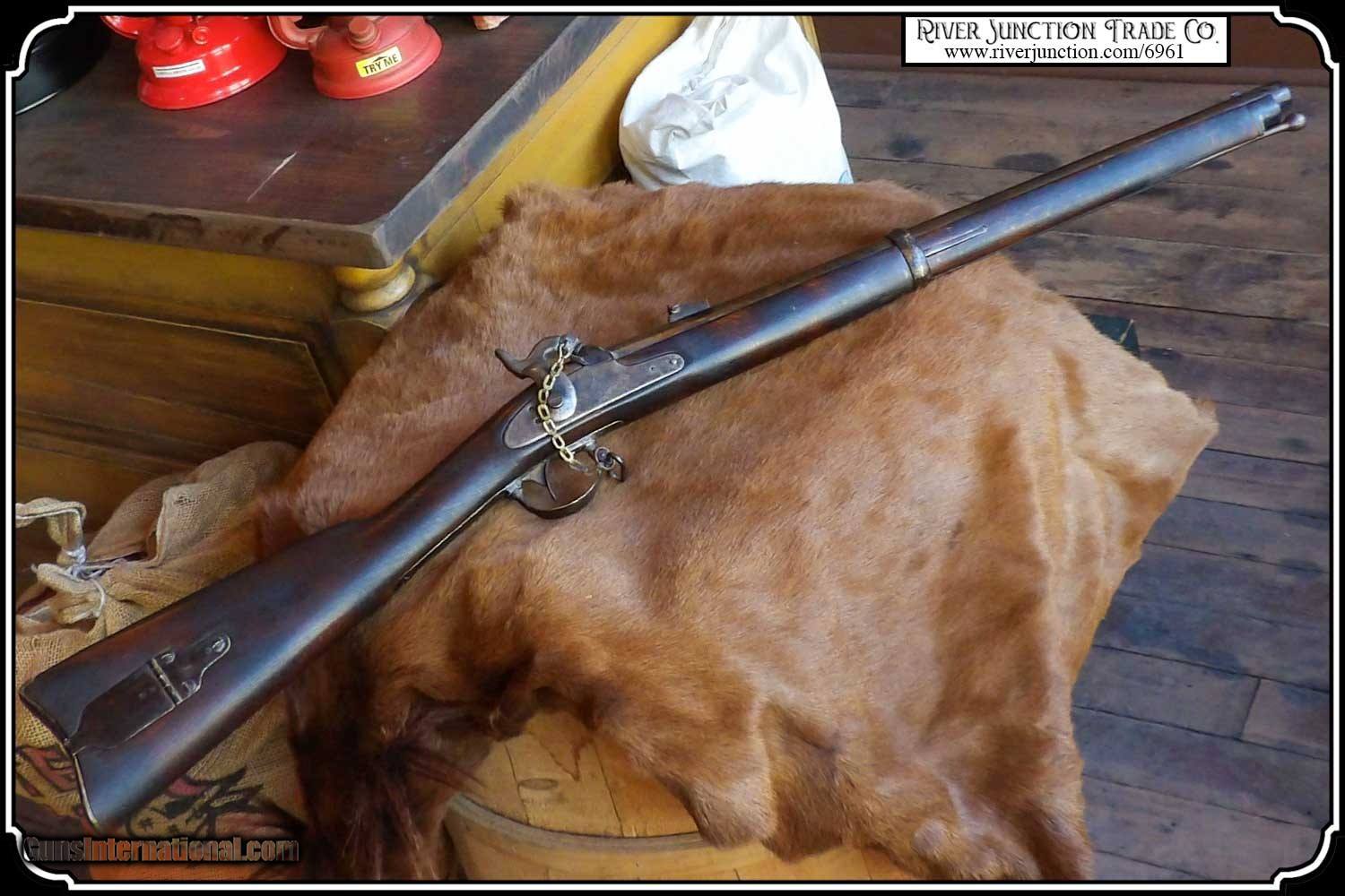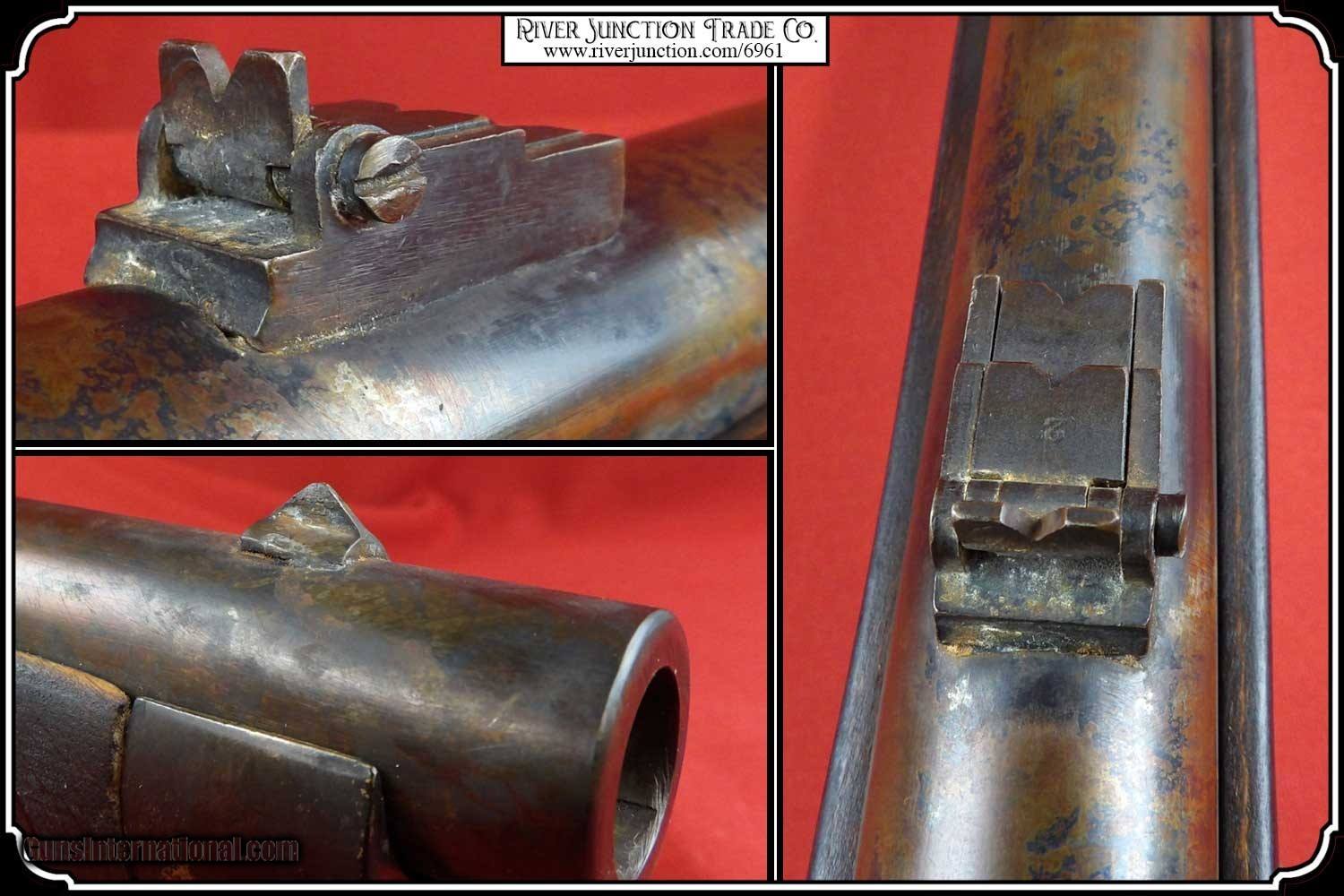 Description: Weapons such as this were often used by the plains Indian’s and could be found on both sides of the reservation boundaries in the late 19th century. This was a .58 cal. rifled-musket, sawed off to a 21 inch barrel. It has an overall length of 33 inches. The ramrod is 21 3/4 inches long. The wood has no breaks or cracks and no nicks and dings otherwise. The lock is marked with the US Eagle. It has a a mottled grey/brown patina, which is smooth and uncleaned. The lock, hammer, trigger guard, butt, tang, are all in perfect condition and ready for daily use. It is a good sound horseback or canoe gun. It sure is interesting. Other items are not included. This is a percussion rifled musket and can be shipped directly to you. (adult signature required) this is a good sound shooter. We will ship outside the U.S.A. SOLD |