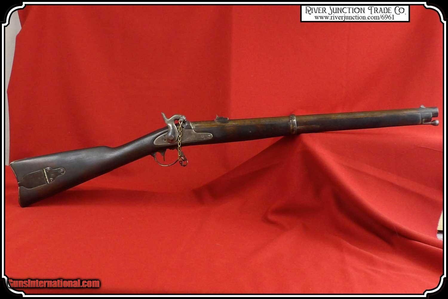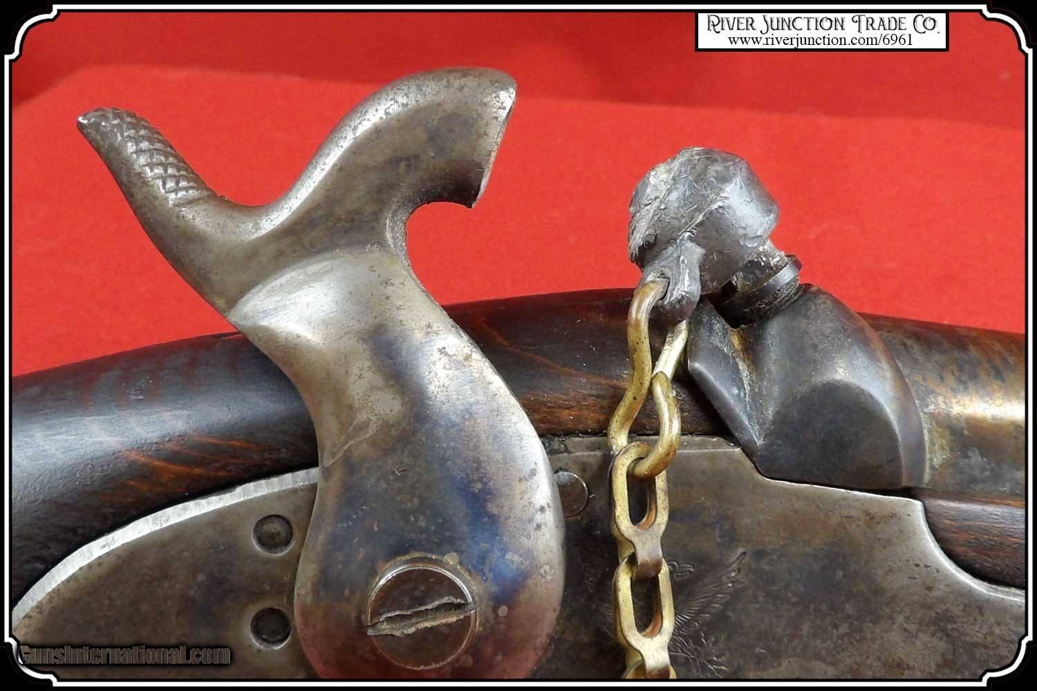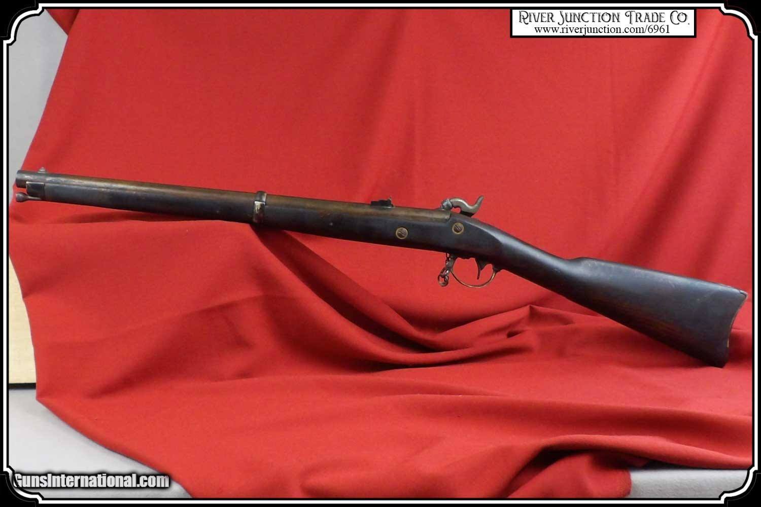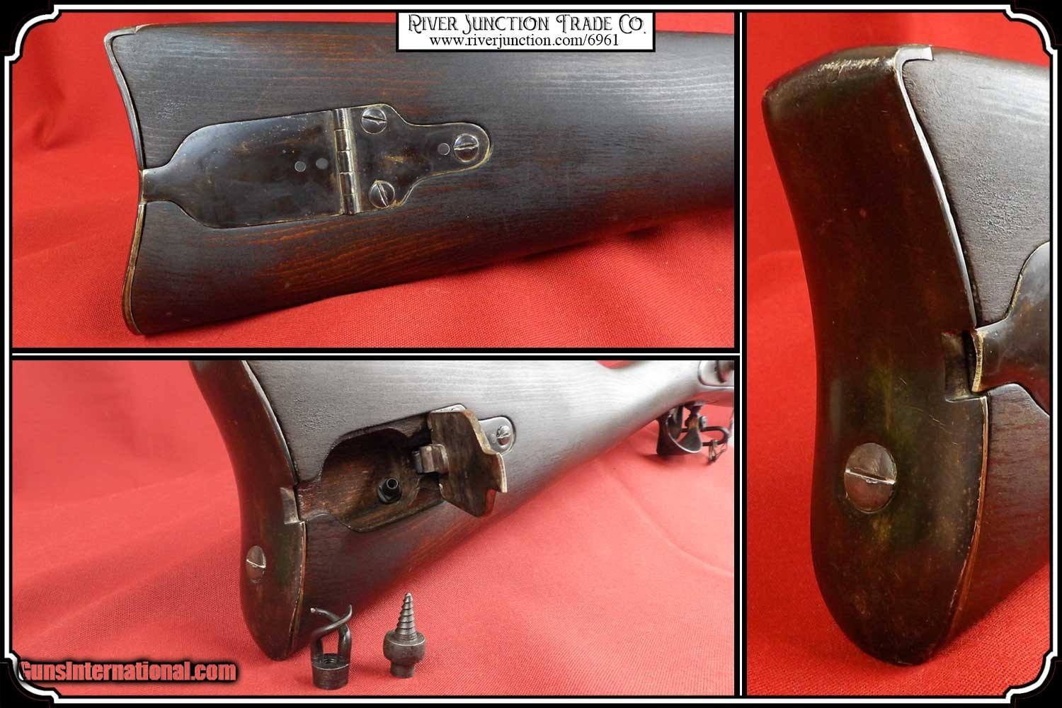 Description: Weapons such as this were often used by the plains Indian’s and could be found on both sides of the reservation boundaries in the late 19th century. This was a .58 cal. rifled-musket, sawed off to a 21 inch barrel. It has an overall length of 33 inches. The ramrod is 21 3/4 inches long. The wood has no breaks or cracks and no nicks and dings otherwise. The lock is marked with the US Eagle. It has a a mottled grey/brown patina, which is smooth and uncleaned. The lock, hammer, trigger guard, butt, tang, are all in perfect condition and ready for daily use. It is a good sound horseback or canoe gun. It sure is interesting. Other items are not included. This is a percussion rifled musket and can be shipped directly to you. (adult signature required) this is a good sound shooter. We will ship outside the U.S.A. SOLD |