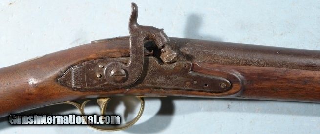 Description: SILAS ALLEN PERCUSSION CONVERSION MASSACHUSETTS MILITIA FUSIL CIRCA 1820’S. 58” o/a with 42” round smoothbore .69 cal. barrel stamped at the breech with Massachusetts proof “P M” and Silas Allen’s “S A” above. Silas Allen of Shrewsbury, Mass. was a well known gunmaker who produced both civilian guns and contracted with the State of Massachusetts for the production of military muskets in the late 18th and early 19th Centuries. Original lock plate stamped “LONDON/WARRENTED”. Brass trigger guard and mounts. All original as converted to percussion from flintlock Very good overall with original dark metal patina and original walnut stock very good or better. Original metal ramrod. Lock in working order. Nice looking original militia musket. SOLD Antique: Yes |