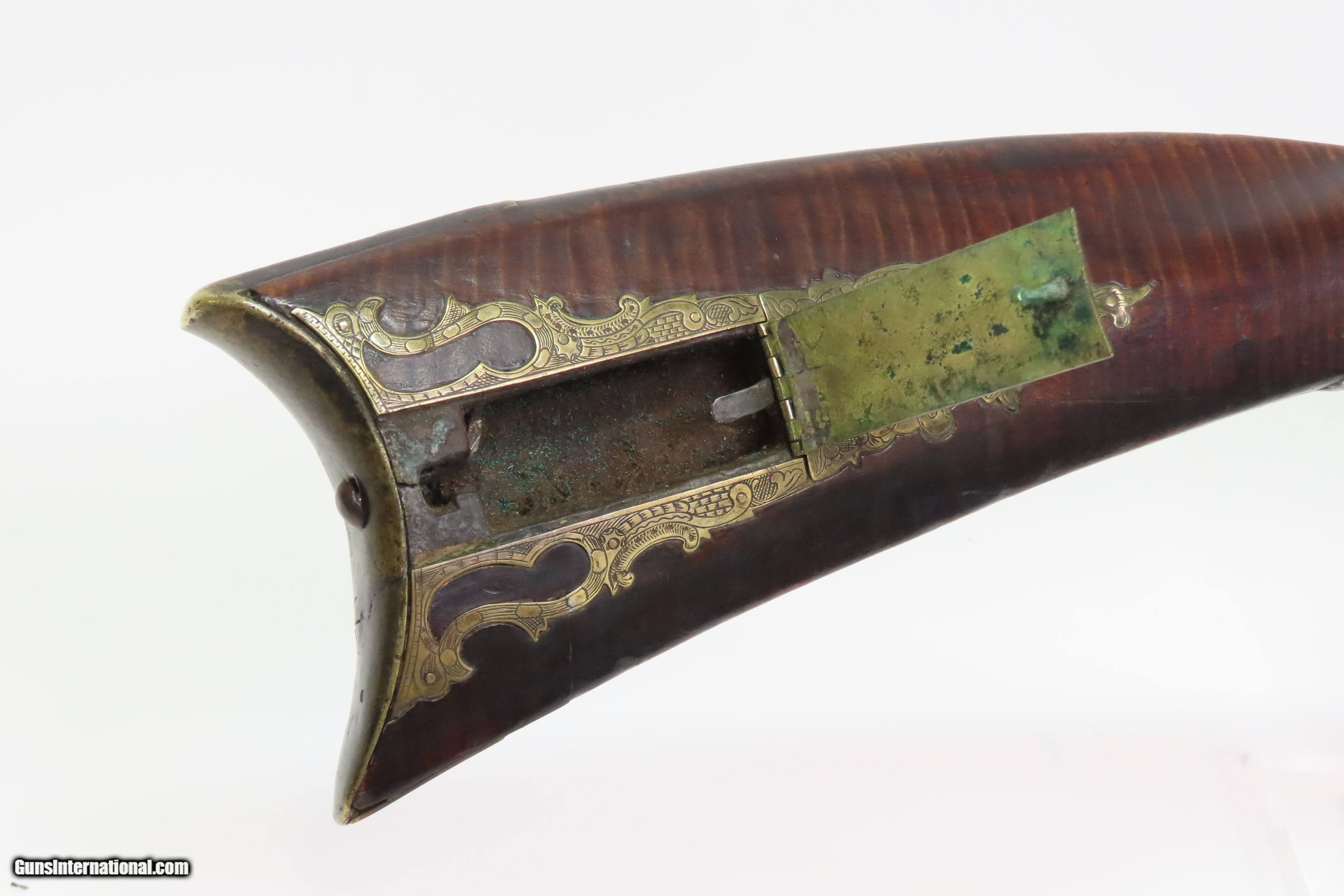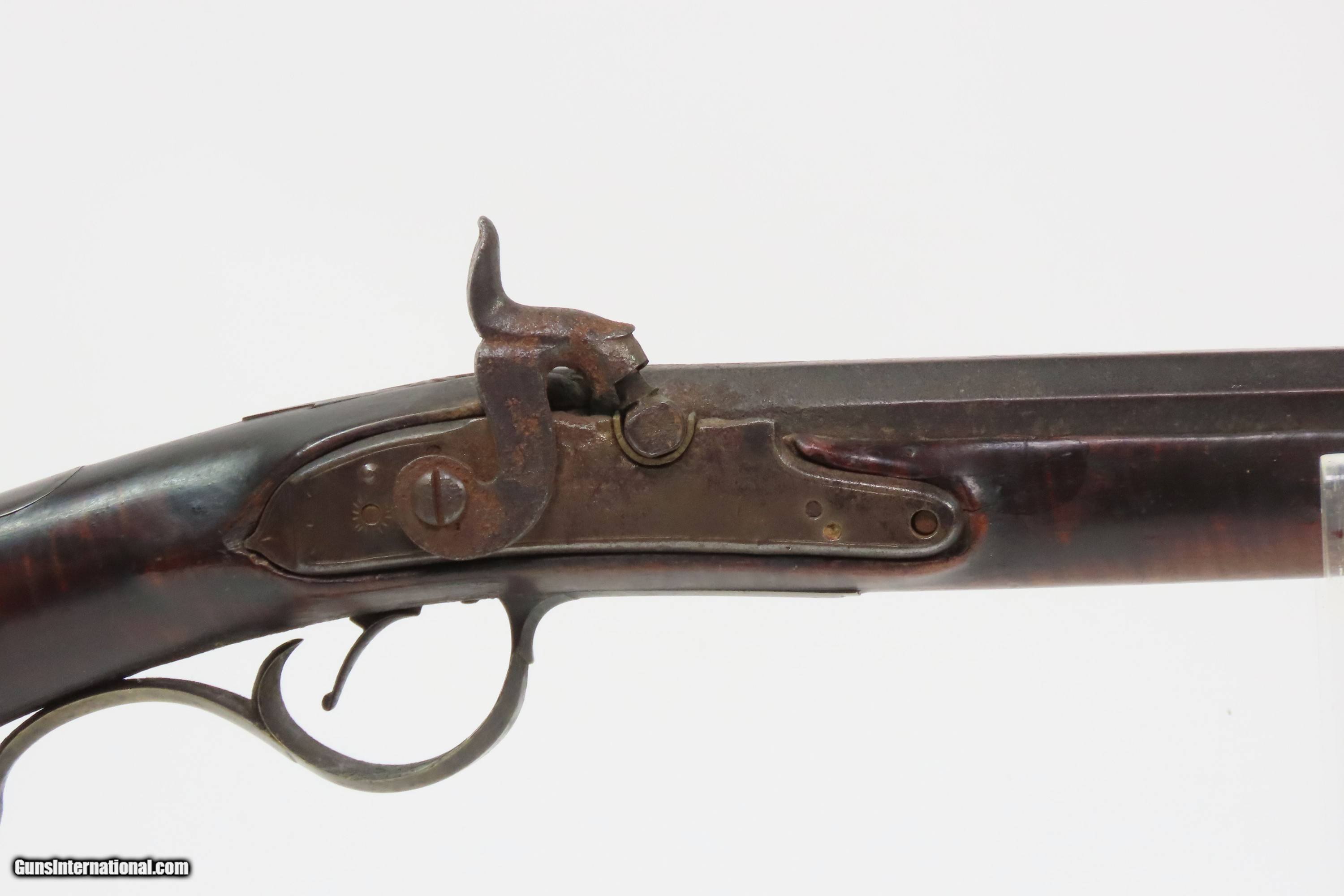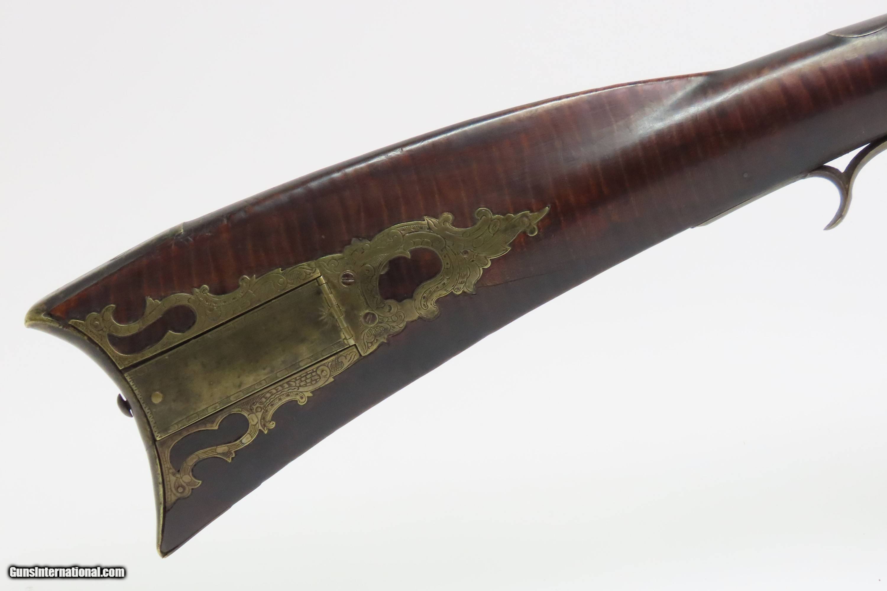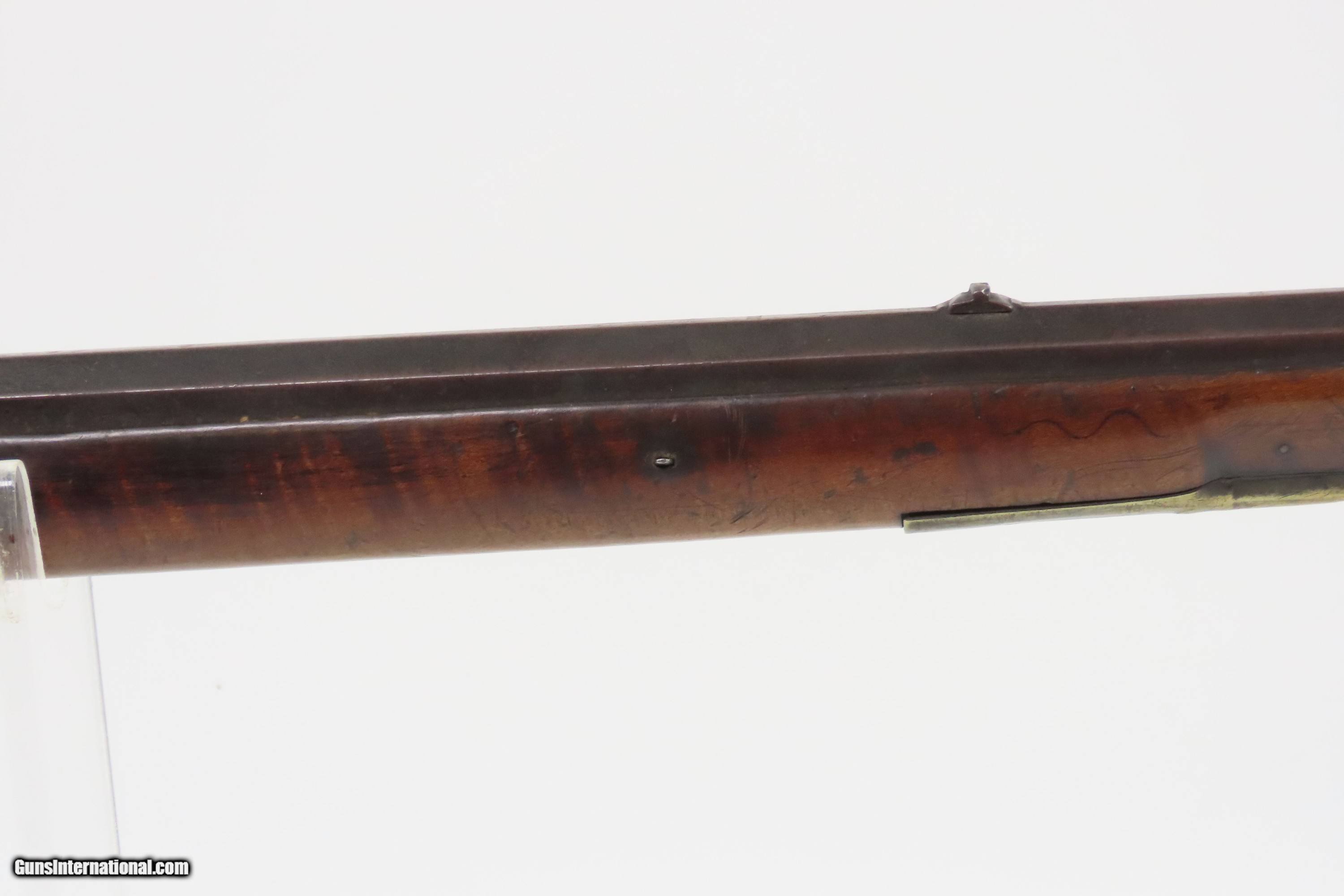 Description: SILVER INLAY Engraved JACOB DEEMER Antique Percussion Conversion LONG RIFLE “J.D.” SIGNED Kentucky Style HOMESTEAD Long Rifle Here we present an antique Silver Inlaid and Engraved Jacob Deemer Full Stock Percussion Conversion Long Rifle, made circa the early-1800s. This rifle likely began its life as a flintlock, later converted to a percussion firing system after that technology was introduced. Crafted in the Easton area of Northampton County, Pennsylvania, it is attributed to Jacob Deemer. Born in Bucks County on May 4, 1806, Deemer lived until April 27, 1870, passing away in Durham, Bucks County. It's believed that he apprenticed under Nicholas Hawk from Gilbert, Pennsylvania. This rifle shares several similarities with Hawk’s work, especially in its decorative engravings on the brass fittings and the distinctive design of its gunstock. The stock is made from curly maple with dark diagonal stripes set against a lighter brown background, complemented by silver inlays that add to its elegance. A main feature that draws the eye sturdy is an octagonal barrel chambered in .44 caliber—powerful enough for small to medium game or for defending the homestead. During the mid to late 1800s, rifle manufacturing was transitioning rapidly. Many guns were still crafted by individual artisans across the United States and frontier regions, but the rise of large factories with assembly lines was beginning to change the industry. Unfortunately, over time, many of the makers' names—especially those of the so-called Kentucky long rifles—have been lost to history. This piece stands as a fine example of that bygone era. The overall condition is good. The action functions, but the trigger spring is weak. Traces of silver finish remain on the cheek rest emblem. Brown and dark patinas intermixed on the barrel. The maple stock is solid, being refinished, with stable cracks under the muzzle. Good, darkened bore. The stock is repaired just ahead of the lock and has a small crack north of the left sideplate. Most markings are legible, but some are partially obfuscated. The barrel is signed “J.D.” Own the original! This is a legitimate antique and not a reproduction. Barrel is 43-3/4 inches. Caliber: .44 Percussion Overall condition as seen in photos. Very Fast. Very Safe. FREE SHIPPING WORLDWIDE. Delivered directly to your door by express mail! Guaranteed AUTHENTIC & Includes CERTIFICATE OF AUTHENTICITY. ancestryguns $2400 #250353 SOLD Antique: Yes |