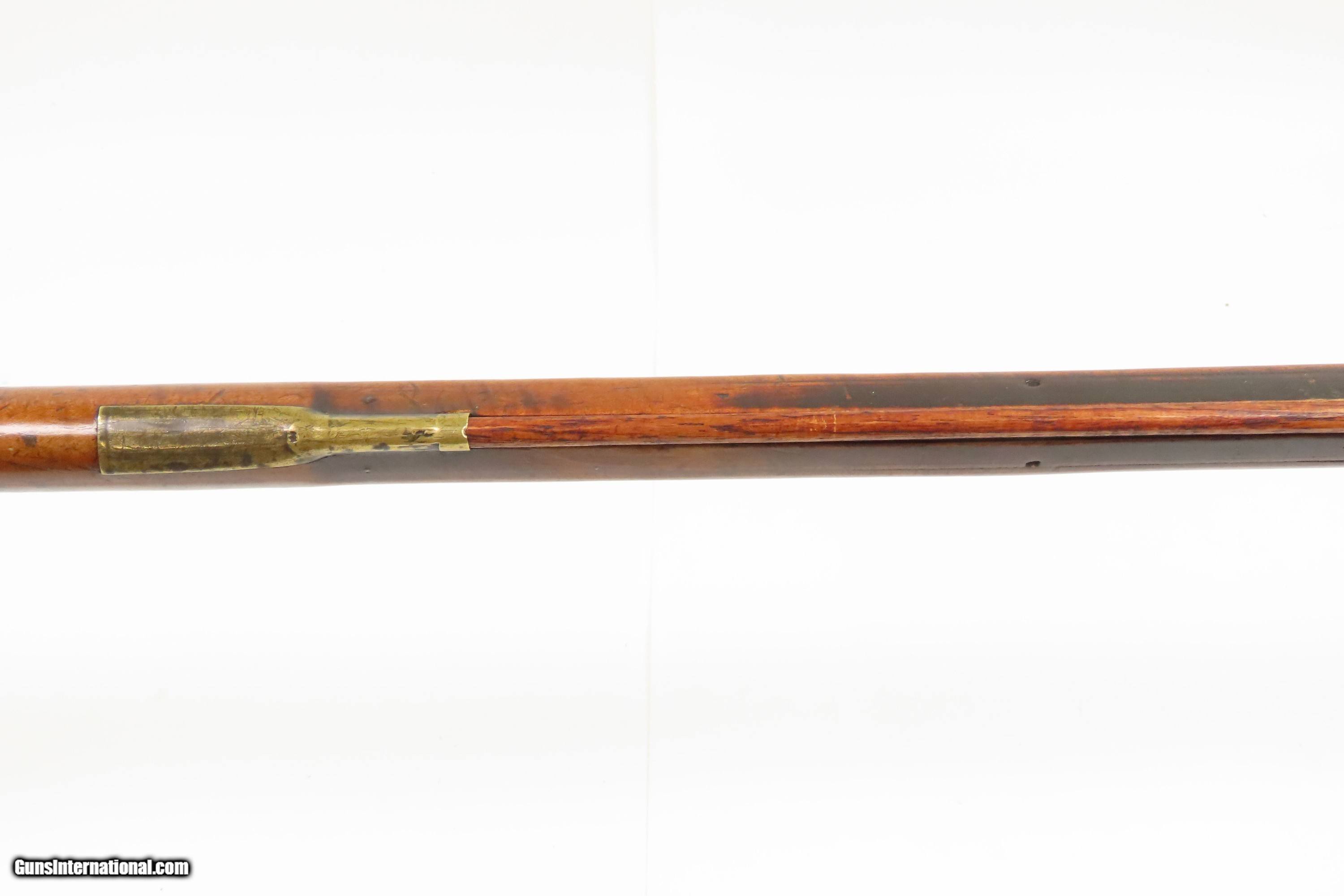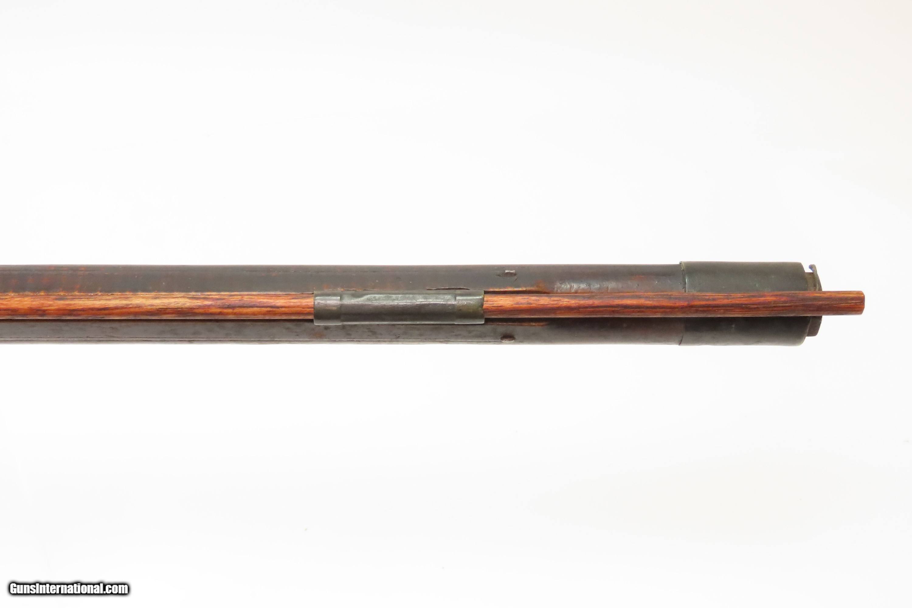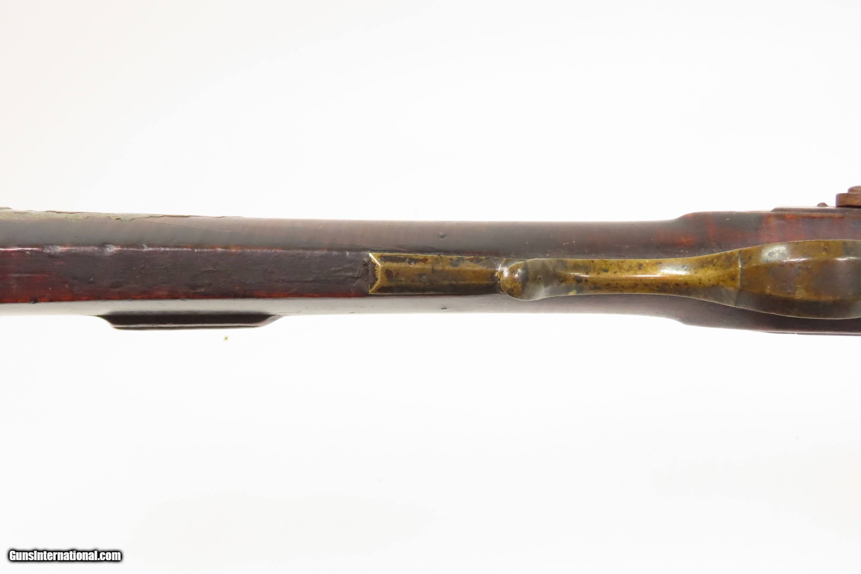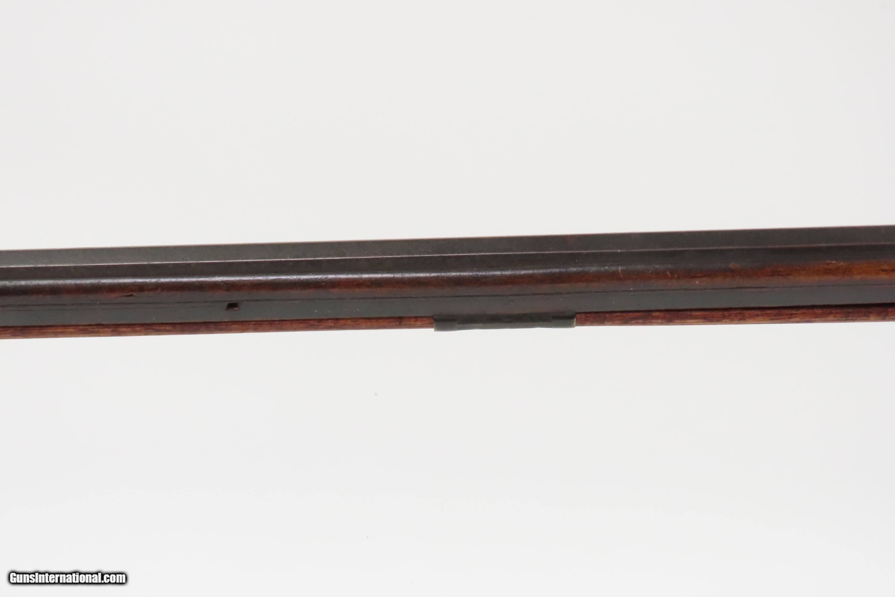 Description: SILVER INLAY Engraved JACOB DEEMER Antique Percussion Conversion LONG RIFLE “J.D.” SIGNED Kentucky Style HOMESTEAD Long Rifle Here we present an antique Silver Inlaid and Engraved Jacob Deemer Full Stock Percussion Conversion Long Rifle, made circa the early-1800s. This rifle likely began its life as a flintlock, later converted to a percussion firing system after that technology was introduced. Crafted in the Easton area of Northampton County, Pennsylvania, it is attributed to Jacob Deemer. Born in Bucks County on May 4, 1806, Deemer lived until April 27, 1870, passing away in Durham, Bucks County. It's believed that he apprenticed under Nicholas Hawk from Gilbert, Pennsylvania. This rifle shares several similarities with Hawk’s work, especially in its decorative engravings on the brass fittings and the distinctive design of its gunstock. The stock is made from curly maple with dark diagonal stripes set against a lighter brown background, complemented by silver inlays that add to its elegance. A main feature that draws the eye sturdy is an octagonal barrel chambered in .44 caliber—powerful enough for small to medium game or for defending the homestead. During the mid to late 1800s, rifle manufacturing was transitioning rapidly. Many guns were still crafted by individual artisans across the United States and frontier regions, but the rise of large factories with assembly lines was beginning to change the industry. Unfortunately, over time, many of the makers' names—especially those of the so-called Kentucky long rifles—have been lost to history. This piece stands as a fine example of that bygone era. The overall condition is good. The action functions, but the trigger spring is weak. Traces of silver finish remain on the cheek rest emblem. Brown and dark patinas intermixed on the barrel. The maple stock is solid, being refinished, with stable cracks under the muzzle. Good, darkened bore. The stock is repaired just ahead of the lock and has a small crack north of the left sideplate. Most markings are legible, but some are partially obfuscated. The barrel is signed “J.D.” Own the original! This is a legitimate antique and not a reproduction. Barrel is 43-3/4 inches. Caliber: .44 Percussion Overall condition as seen in photos. Very Fast. Very Safe. FREE SHIPPING WORLDWIDE. Delivered directly to your door by express mail! Guaranteed AUTHENTIC & Includes CERTIFICATE OF AUTHENTICITY. ancestryguns $2400 #250353 SOLD Antique: Yes |