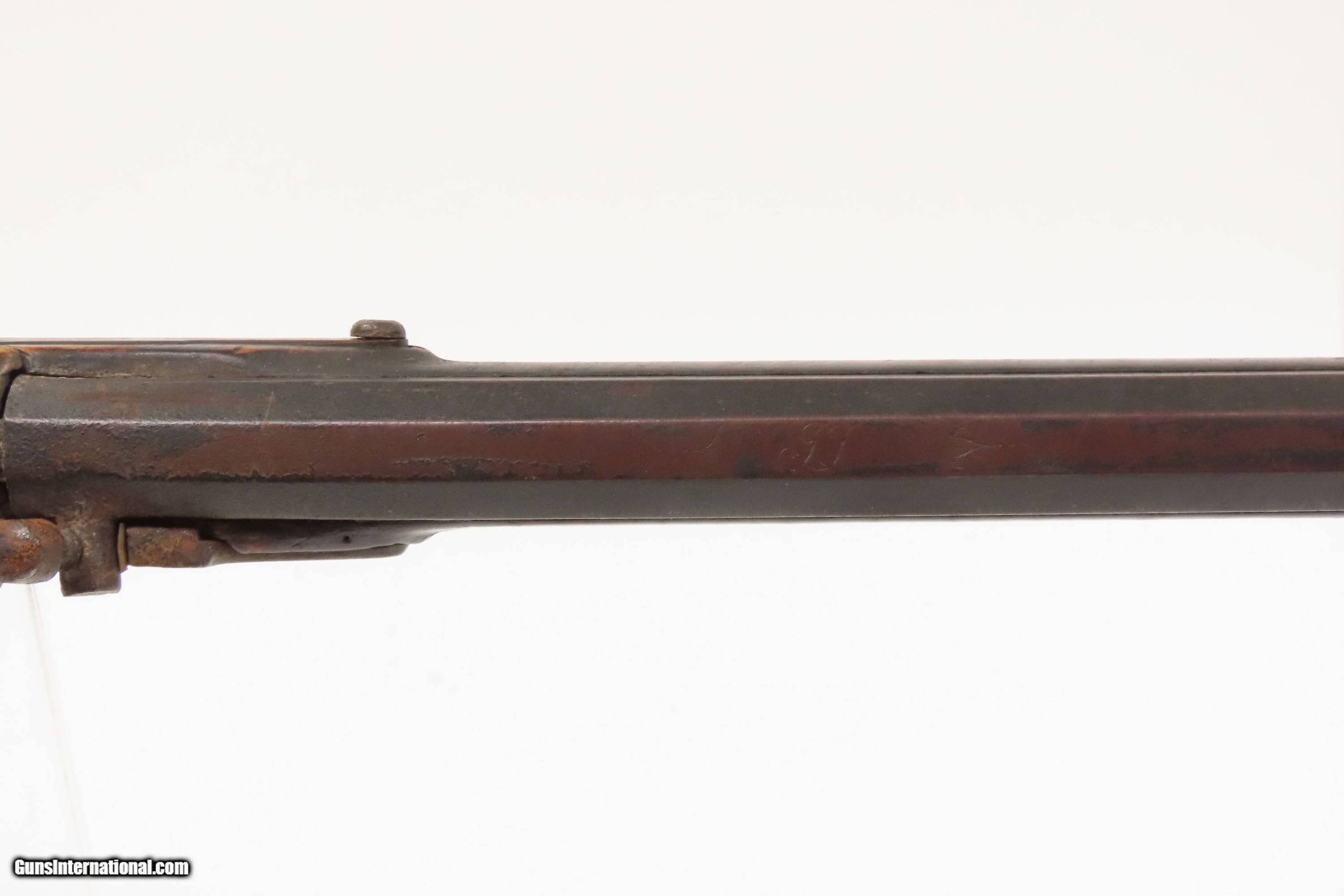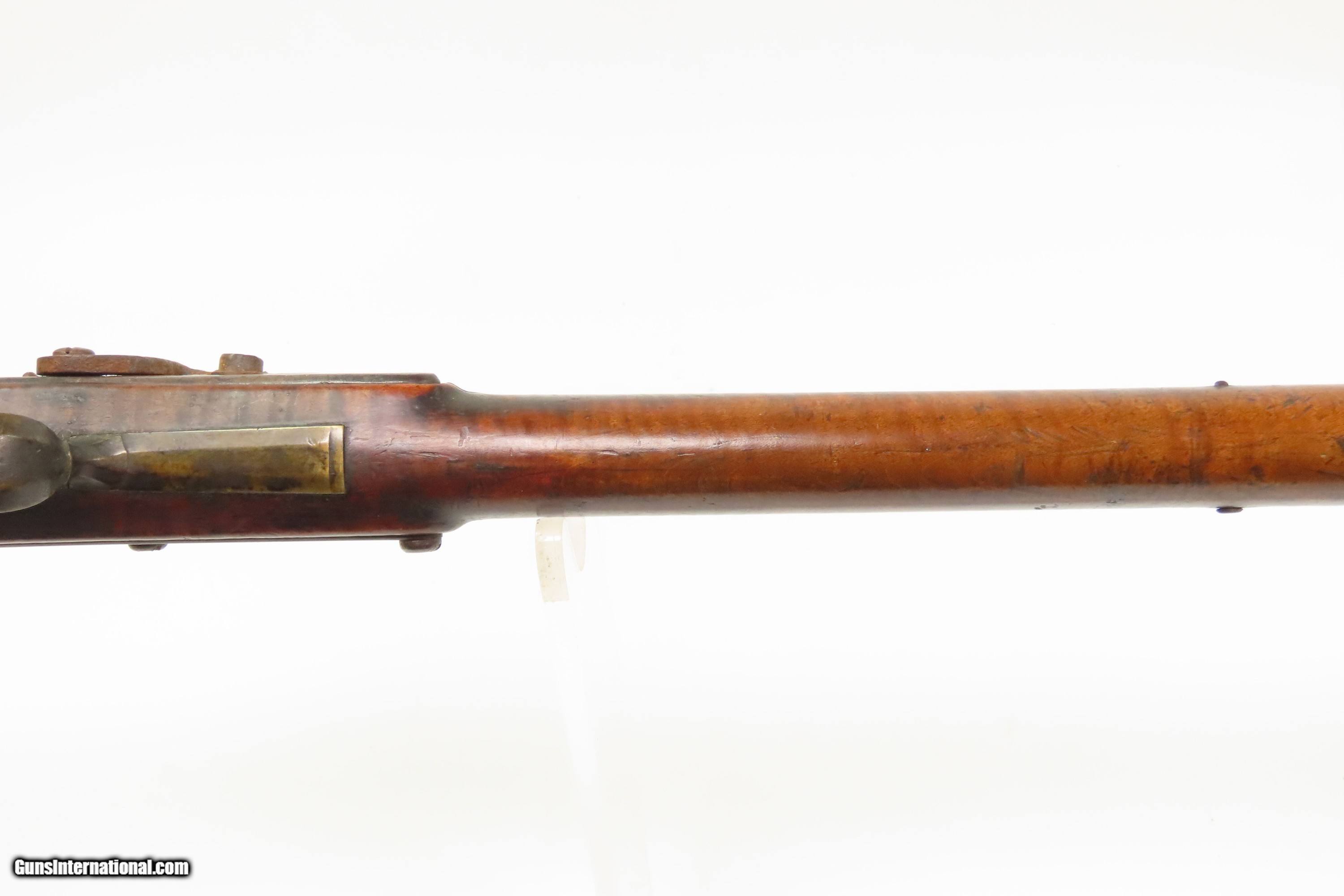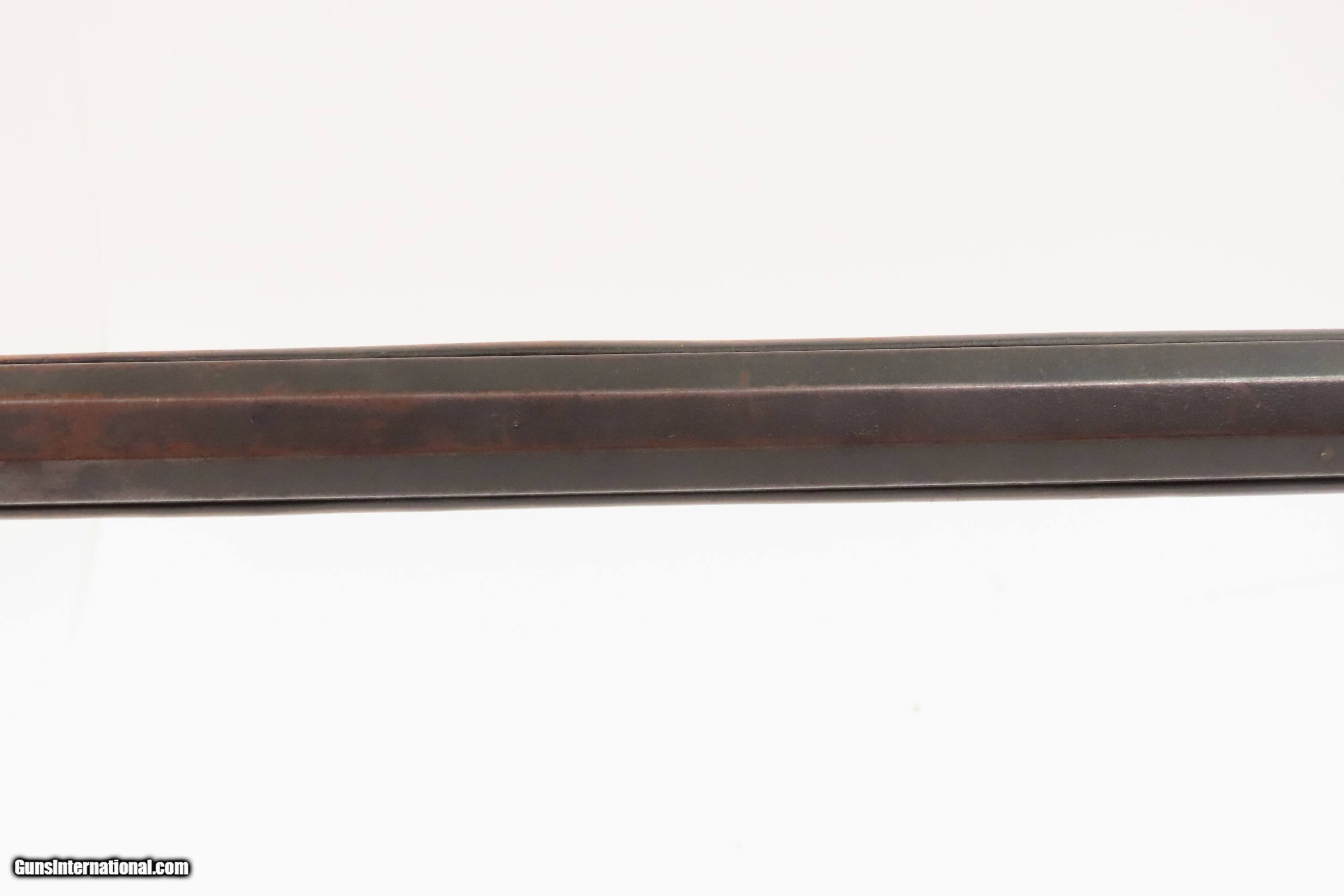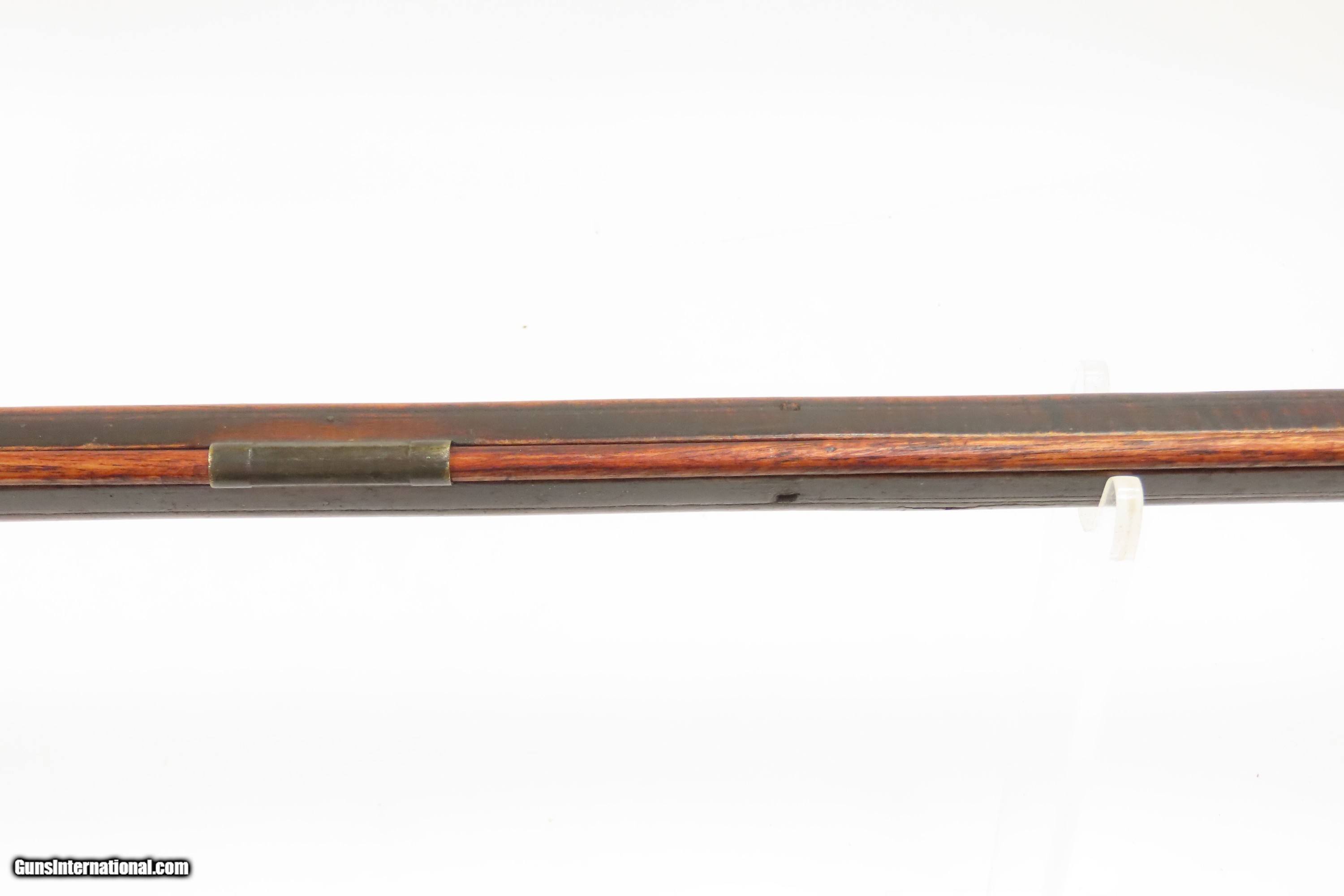 Description: SILVER INLAY Engraved JACOB DEEMER Antique Percussion Conversion LONG RIFLE “J.D.” SIGNED Kentucky Style HOMESTEAD Long Rifle Here we present an antique Silver Inlaid and Engraved Jacob Deemer Full Stock Percussion Conversion Long Rifle, made circa the early-1800s. This rifle likely began its life as a flintlock, later converted to a percussion firing system after that technology was introduced. Crafted in the Easton area of Northampton County, Pennsylvania, it is attributed to Jacob Deemer. Born in Bucks County on May 4, 1806, Deemer lived until April 27, 1870, passing away in Durham, Bucks County. It's believed that he apprenticed under Nicholas Hawk from Gilbert, Pennsylvania. This rifle shares several similarities with Hawk’s work, especially in its decorative engravings on the brass fittings and the distinctive design of its gunstock. The stock is made from curly maple with dark diagonal stripes set against a lighter brown background, complemented by silver inlays that add to its elegance. A main feature that draws the eye sturdy is an octagonal barrel chambered in .44 caliber—powerful enough for small to medium game or for defending the homestead. During the mid to late 1800s, rifle manufacturing was transitioning rapidly. Many guns were still crafted by individual artisans across the United States and frontier regions, but the rise of large factories with assembly lines was beginning to change the industry. Unfortunately, over time, many of the makers' names—especially those of the so-called Kentucky long rifles—have been lost to history. This piece stands as a fine example of that bygone era. The overall condition is good. The action functions, but the trigger spring is weak. Traces of silver finish remain on the cheek rest emblem. Brown and dark patinas intermixed on the barrel. The maple stock is solid, being refinished, with stable cracks under the muzzle. Good, darkened bore. The stock is repaired just ahead of the lock and has a small crack north of the left sideplate. Most markings are legible, but some are partially obfuscated. The barrel is signed “J.D.” Own the original! This is a legitimate antique and not a reproduction. Barrel is 43-3/4 inches. Caliber: .44 Percussion Overall condition as seen in photos. Very Fast. Very Safe. FREE SHIPPING WORLDWIDE. Delivered directly to your door by express mail! Guaranteed AUTHENTIC & Includes CERTIFICATE OF AUTHENTICITY. ancestryguns $2400 #250353 SOLD Antique: Yes |