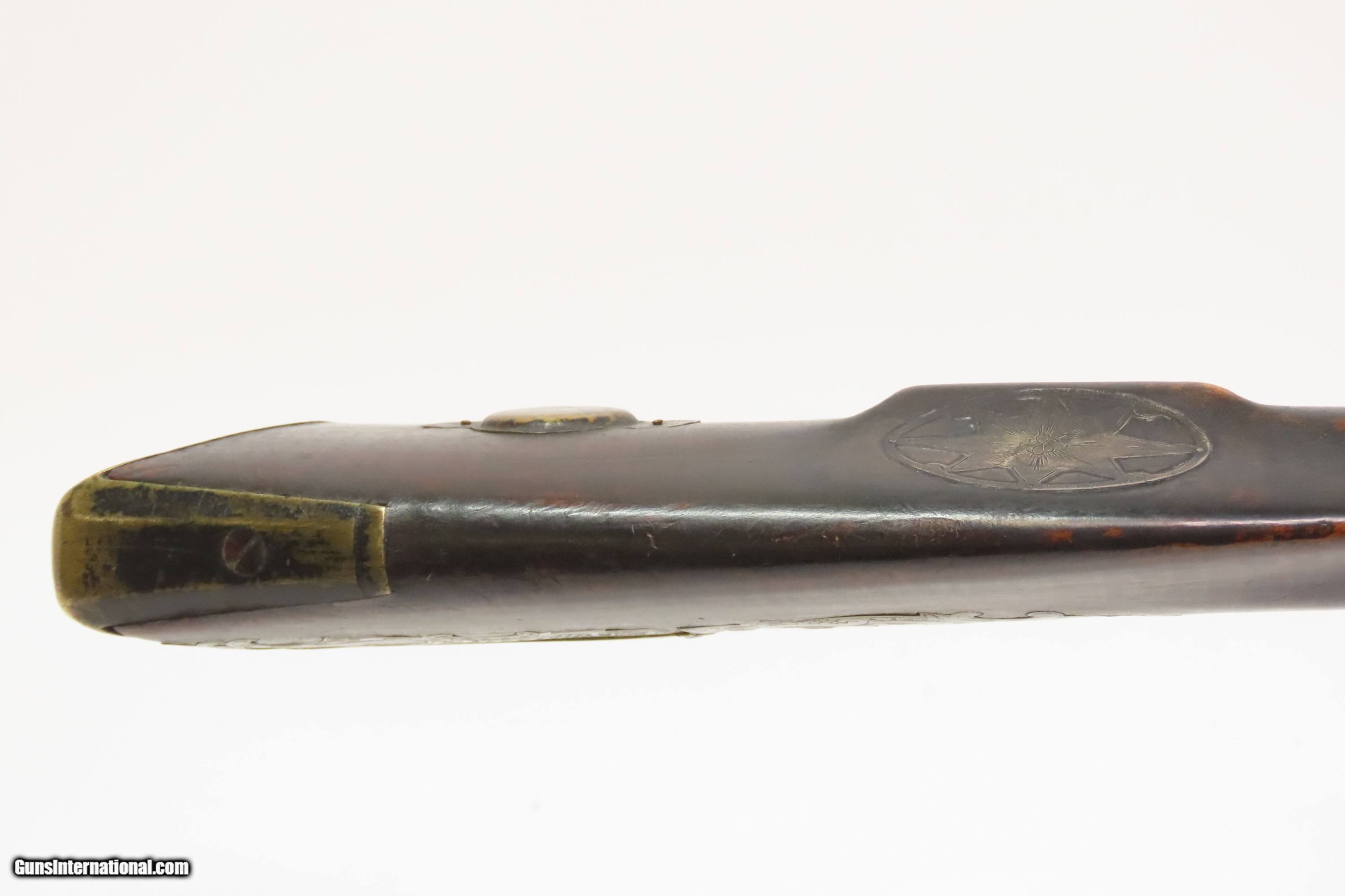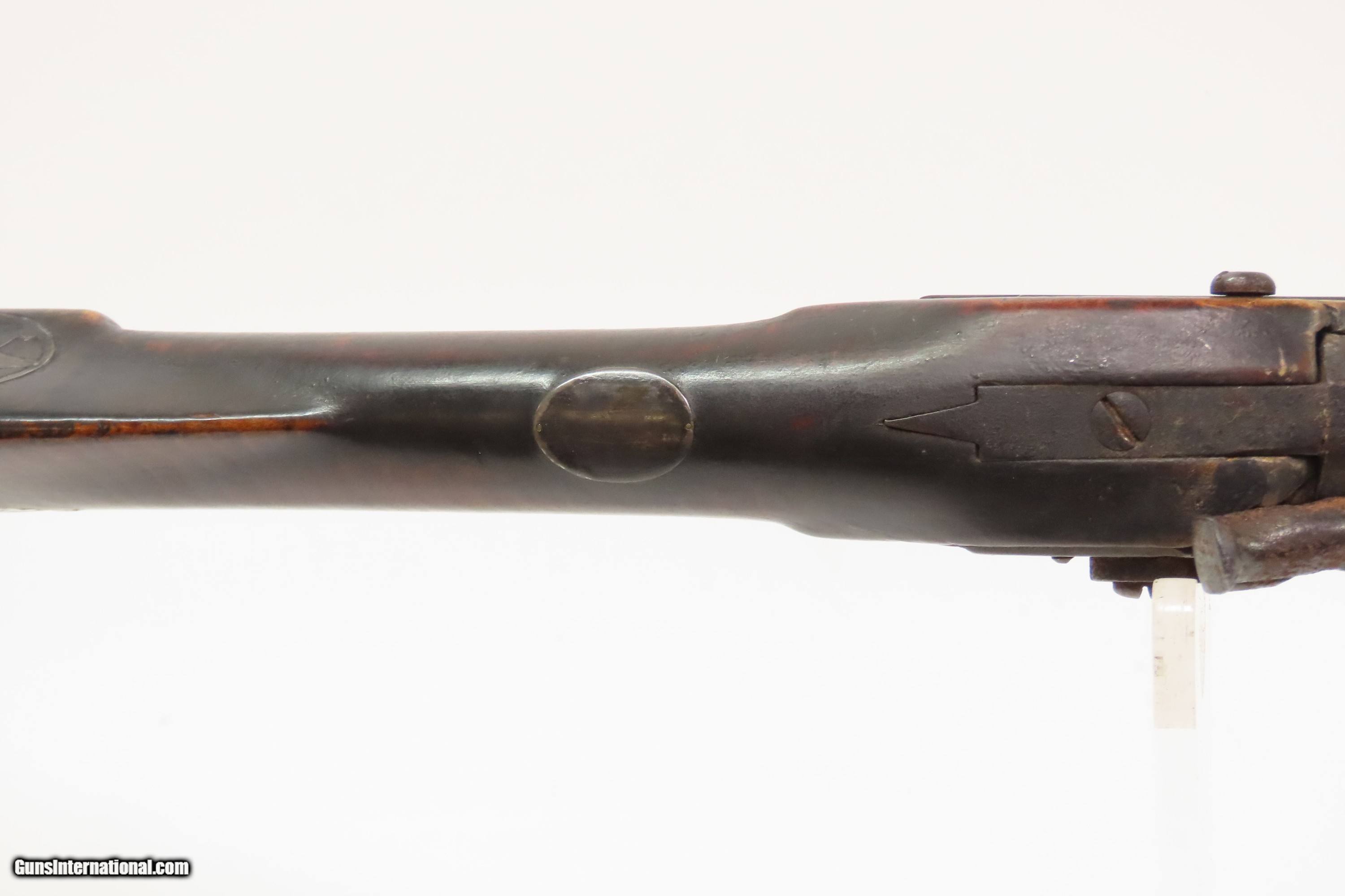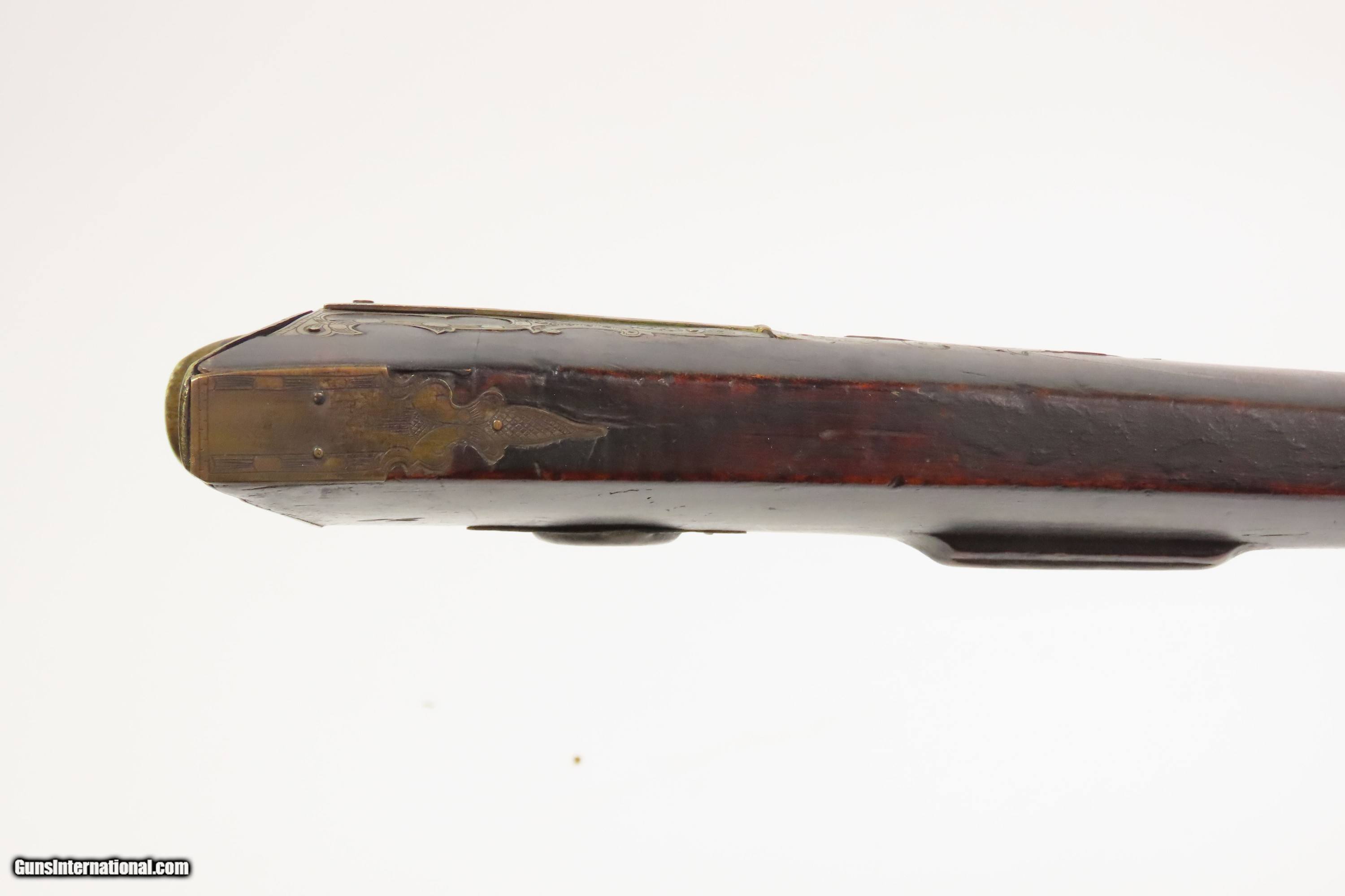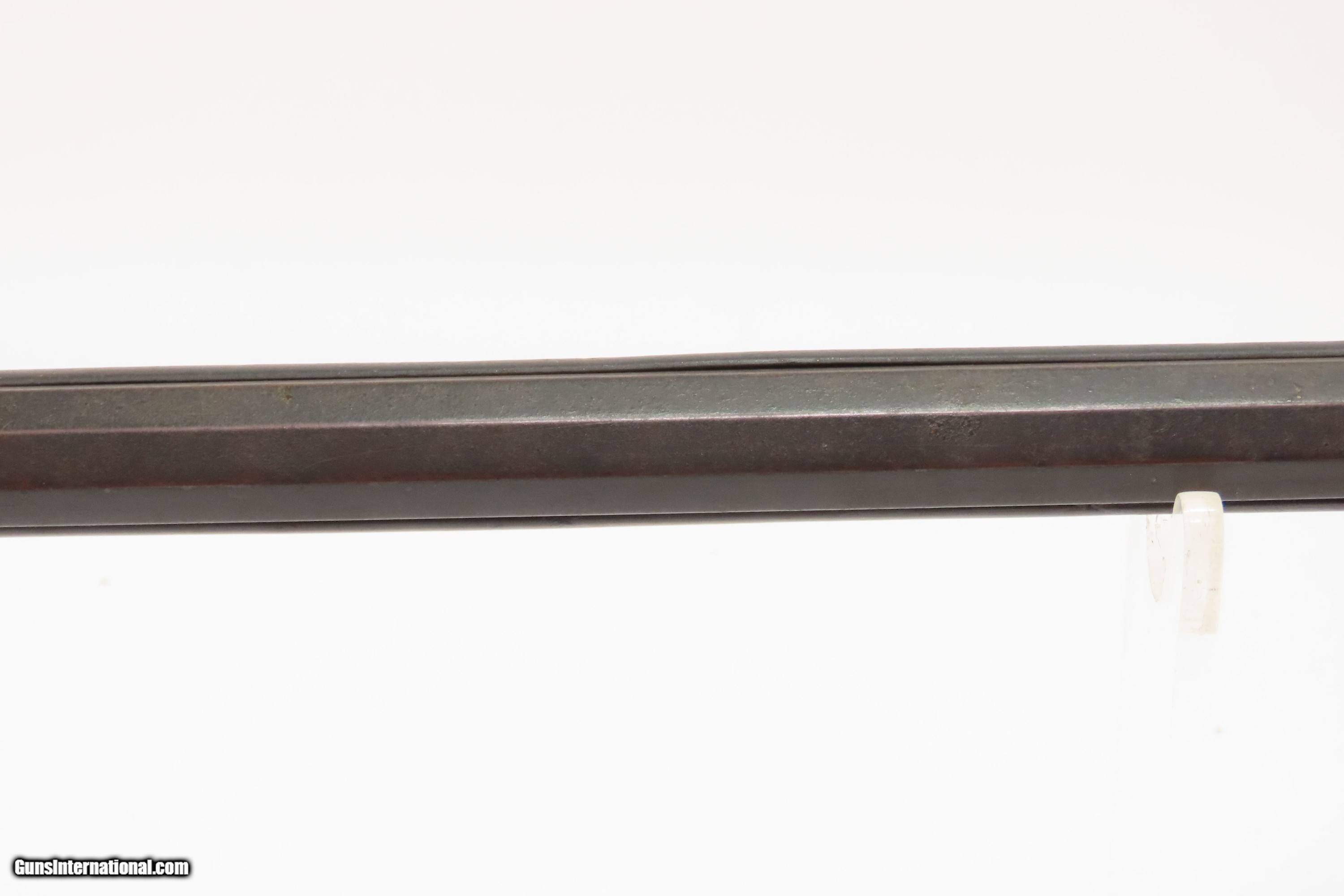 Description: SILVER INLAY Engraved JACOB DEEMER Antique Percussion Conversion LONG RIFLE “J.D.” SIGNED Kentucky Style HOMESTEAD Long Rifle Here we present an antique Silver Inlaid and Engraved Jacob Deemer Full Stock Percussion Conversion Long Rifle, made circa the early-1800s. This rifle likely began its life as a flintlock, later converted to a percussion firing system after that technology was introduced. Crafted in the Easton area of Northampton County, Pennsylvania, it is attributed to Jacob Deemer. Born in Bucks County on May 4, 1806, Deemer lived until April 27, 1870, passing away in Durham, Bucks County. It's believed that he apprenticed under Nicholas Hawk from Gilbert, Pennsylvania. This rifle shares several similarities with Hawk’s work, especially in its decorative engravings on the brass fittings and the distinctive design of its gunstock. The stock is made from curly maple with dark diagonal stripes set against a lighter brown background, complemented by silver inlays that add to its elegance. A main feature that draws the eye sturdy is an octagonal barrel chambered in .44 caliber—powerful enough for small to medium game or for defending the homestead. During the mid to late 1800s, rifle manufacturing was transitioning rapidly. Many guns were still crafted by individual artisans across the United States and frontier regions, but the rise of large factories with assembly lines was beginning to change the industry. Unfortunately, over time, many of the makers' names—especially those of the so-called Kentucky long rifles—have been lost to history. This piece stands as a fine example of that bygone era. The overall condition is good. The action functions, but the trigger spring is weak. Traces of silver finish remain on the cheek rest emblem. Brown and dark patinas intermixed on the barrel. The maple stock is solid, being refinished, with stable cracks under the muzzle. Good, darkened bore. The stock is repaired just ahead of the lock and has a small crack north of the left sideplate. Most markings are legible, but some are partially obfuscated. The barrel is signed “J.D.” Own the original! This is a legitimate antique and not a reproduction. Barrel is 43-3/4 inches. Caliber: .44 Percussion Overall condition as seen in photos. Very Fast. Very Safe. FREE SHIPPING WORLDWIDE. Delivered directly to your door by express mail! Guaranteed AUTHENTIC & Includes CERTIFICATE OF AUTHENTICITY. ancestryguns $2400 #250353 SOLD Antique: Yes |