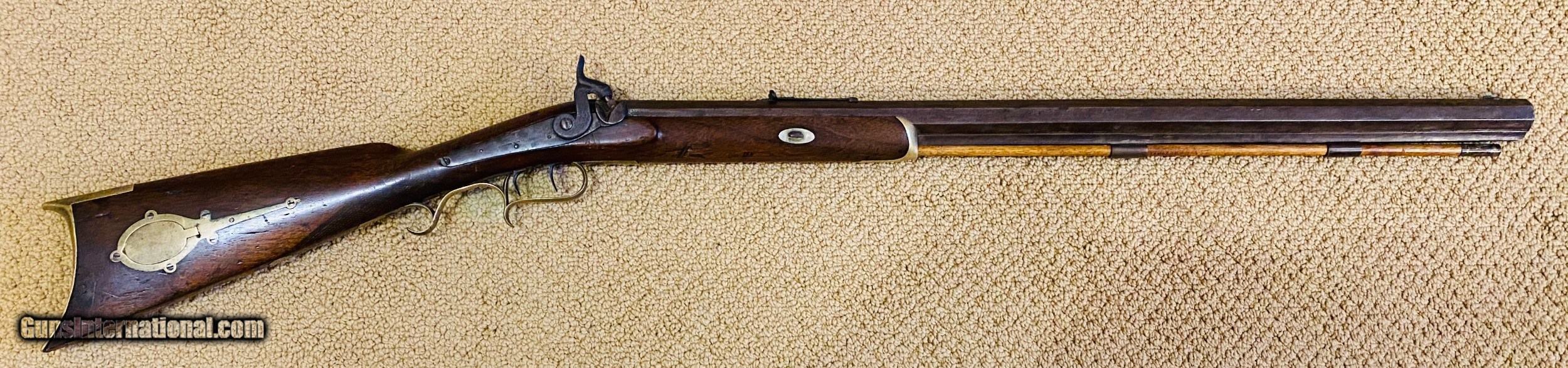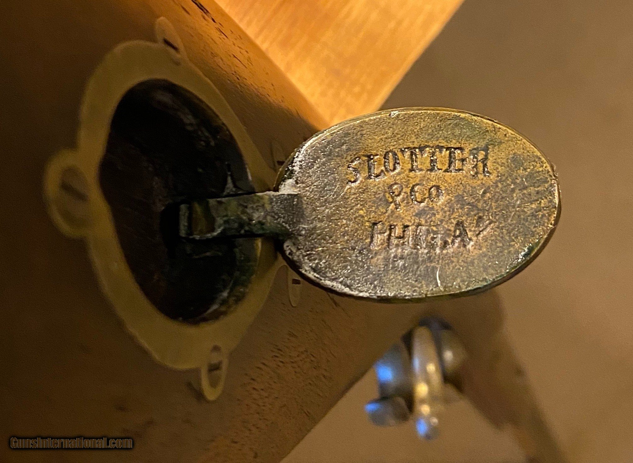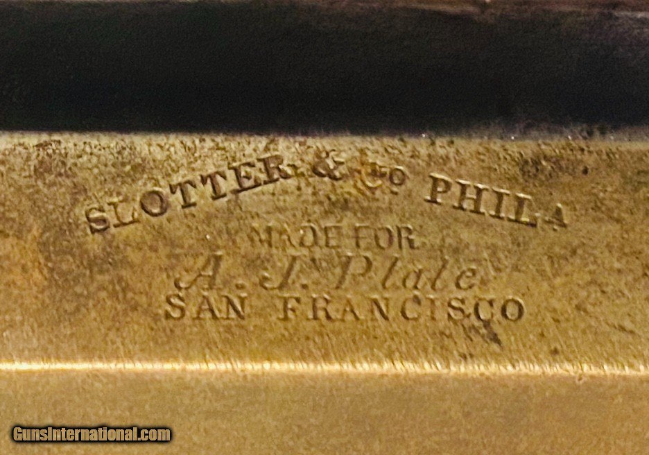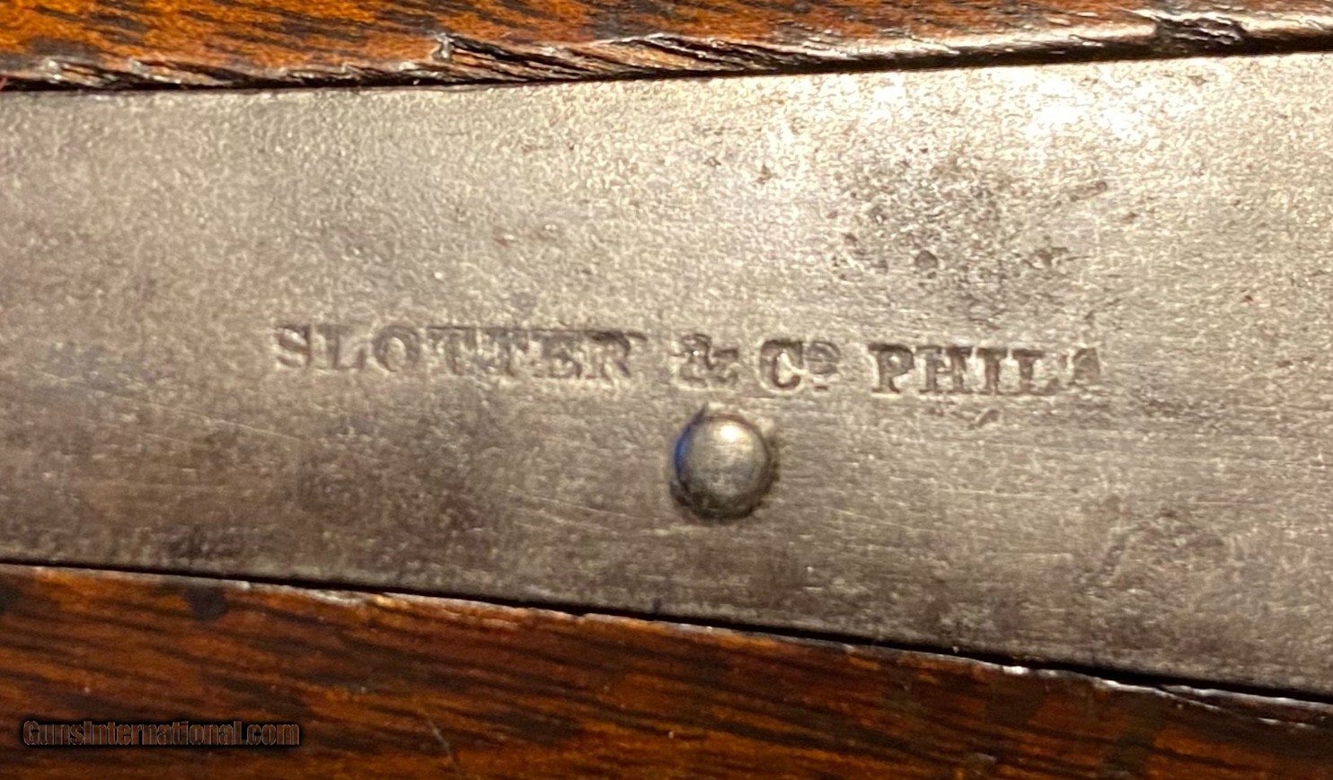Description: A fine half stock Plains rifle made by Slotter of Pa. for Plate. 30 inch 10 lb. octogan barrel, ca. .45 caliber, with double set triggers and extensive brass hardware and patchbox, which is also marked Slotter & Co. Lock is marked Slotter & Co. Phil. Pa. Barrel is marked"WART GAIN TWIST 676". Good condition with even brown patina. Full cock on hammer needs adjustment. Forearm has one keeper wedge. SOLD Antique: Yes Manufacturer: Slotter and Company Model: Plains Halfstock Barrel Length: 31 inches Condition: VG Metal Condition: VG Wood Condition: VG Bore Condition: Needs cleaning Barrel Type: Octogan Action: Lock Triggers: Set Stock: W/Comb Stock Dimensions: Half stock Stock Drop: Normal Stock Comb: Yes Stock Heel: Brass Fore End: Pewter Finish: Brown Patina Weight: 10 lbs. Sights: Rifle Manufacture Date: Ca. 1855 Engraving: Slight Item Location: TEXAS |