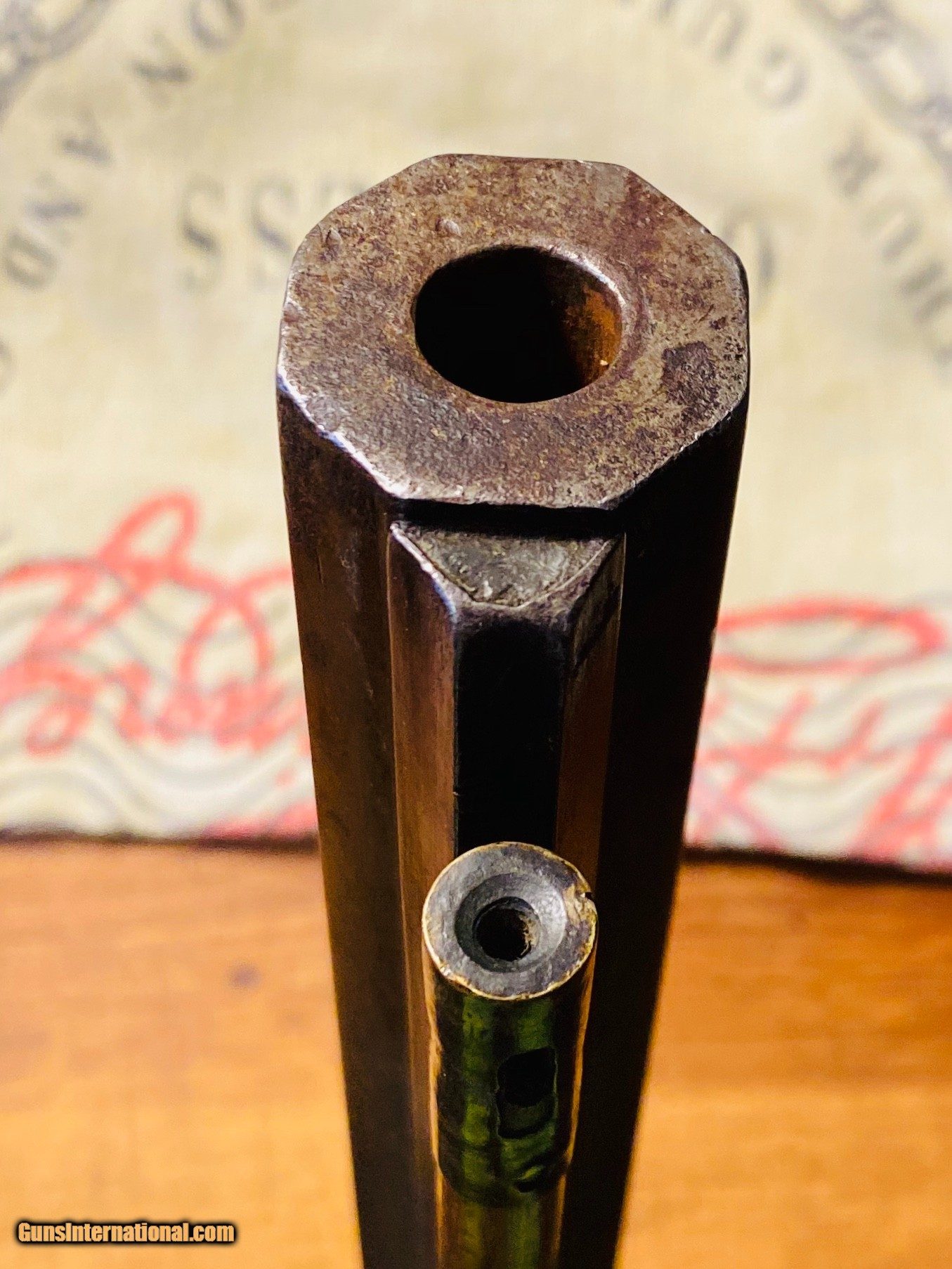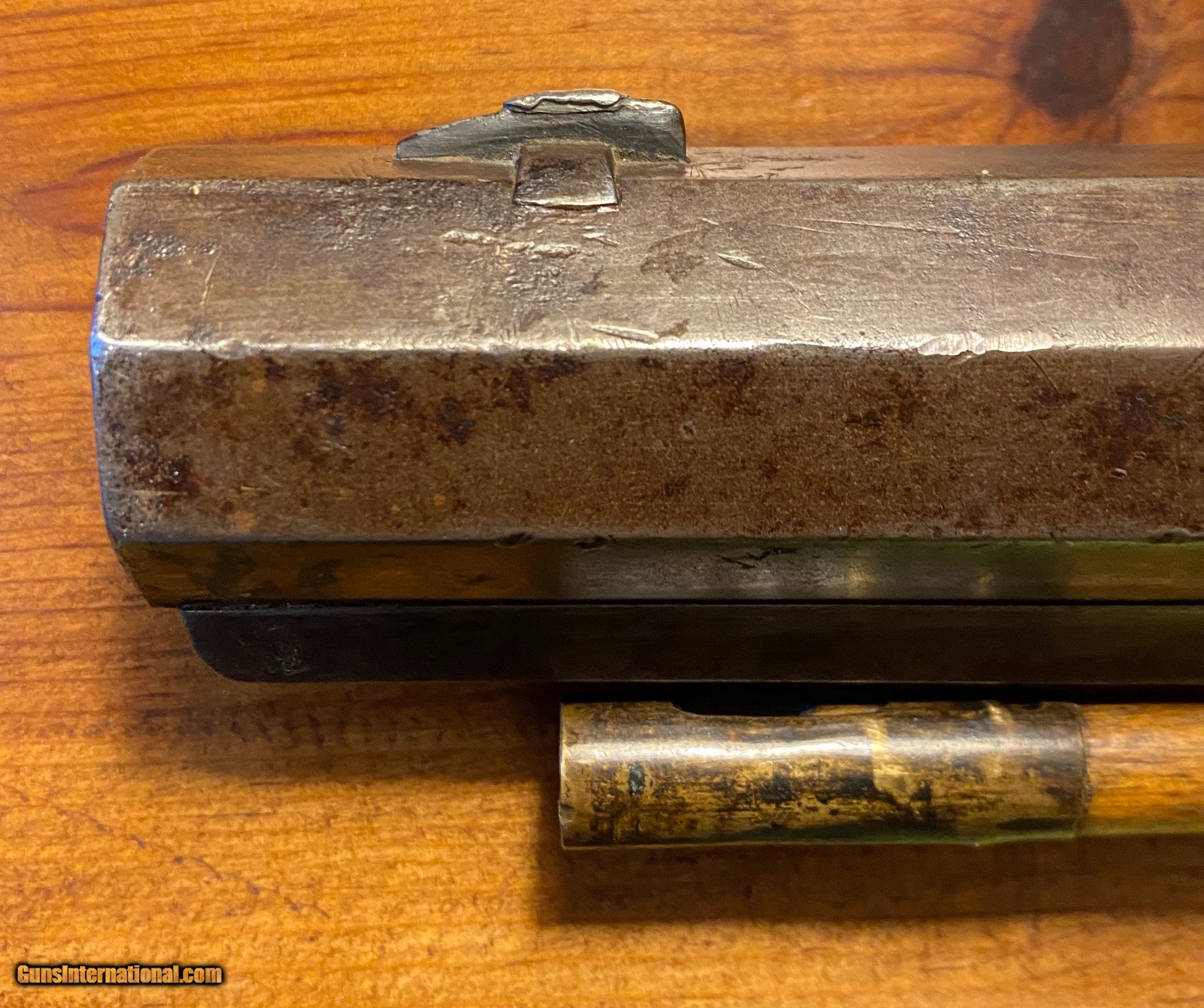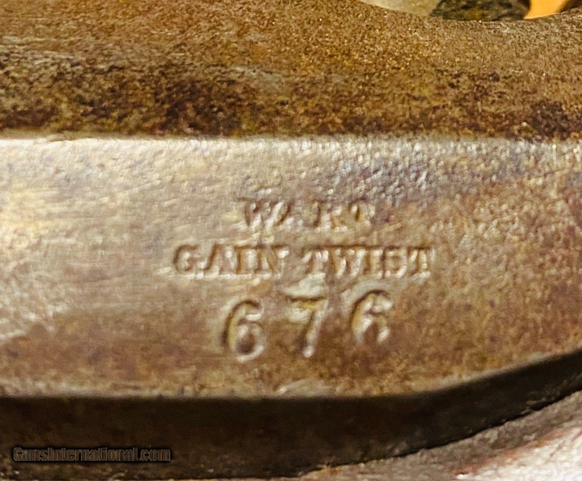 Description: A fine half stock Plains rifle made by Slotter of Pa. for Plate. 30 inch 10 lb. octogan barrel, ca. .45 caliber, with double set triggers and extensive brass hardware and patchbox, which is also marked Slotter & Co. Lock is marked Slotter & Co. Phil. Pa. Barrel is marked"WART GAIN TWIST 676". Good condition with even brown patina. Full cock on hammer needs adjustment. Forearm has one keeper wedge. SOLD Antique: Yes Manufacturer: Slotter and Company Model: Plains Halfstock Barrel Length: 31 inches Condition: VG Metal Condition: VG Wood Condition: VG Bore Condition: Needs cleaning Barrel Type: Octogan Action: Lock Triggers: Set Stock: W/Comb Stock Dimensions: Half stock Stock Drop: Normal Stock Comb: Yes Stock Heel: Brass Fore End: Pewter Finish: Brown Patina Weight: 10 lbs. Sights: Rifle Manufacture Date: Ca. 1855 Engraving: Slight Item Location: TEXAS |