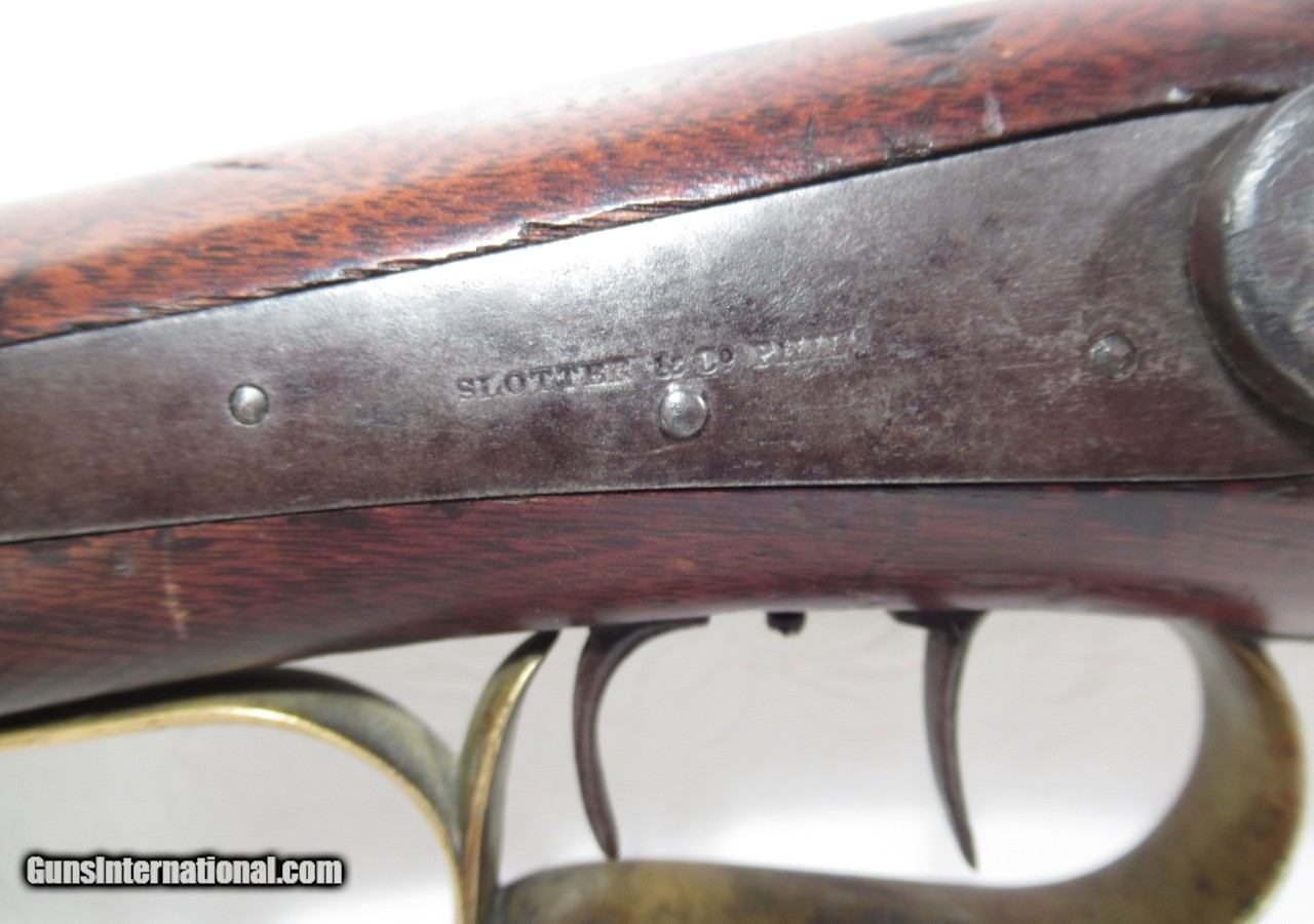 Description: Slotter & Co. Phila.; Made for A.J. Plate, San Francisco; Heavy (11 lbs.) Percussion Rifle; Double Set Triggers; Heavy Octagon 30” Barrel which Measures 1-1/8” Across Flats; Good Action and Properly Working Double Set Triggers; Rough Bore; Nice Antique Wester Shipped Rifle; See All Photos for Condition; No Texts. Call or Email Only; PERSONAL PROPERTY of Harold Wieser; Price: $2,475 + $60 S&H; Price includes insured shipping; return policy: three days inspection from the date the item is received; full refund of shipping both ways ONLY IF THE ITEM IS MISREPRESENTED. SOLD Antique: Yes Manufacturer: Slotter & Co. Model: Percussion |
