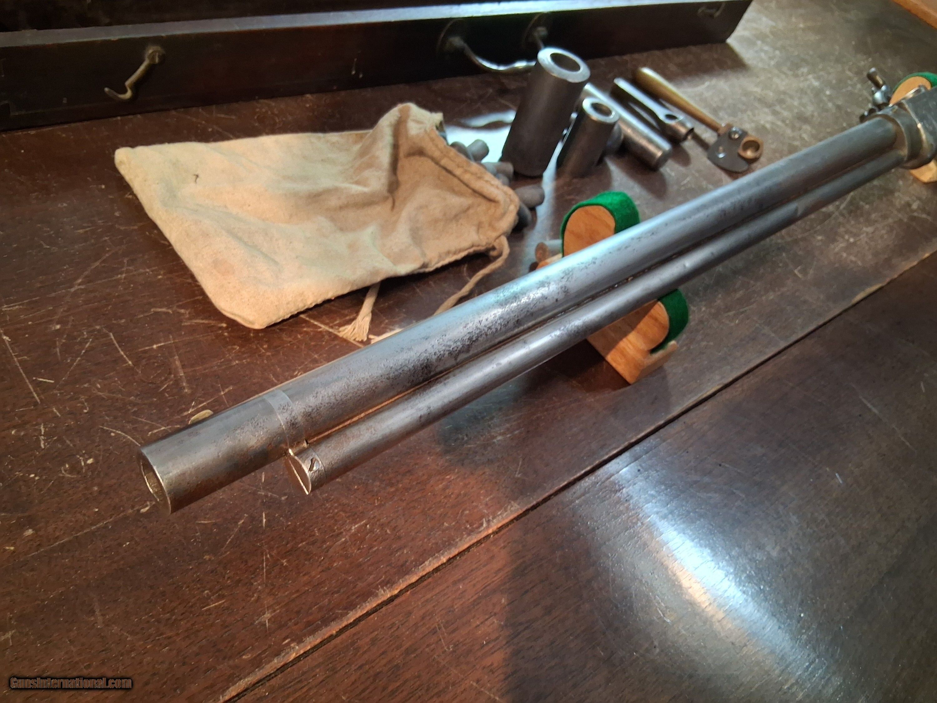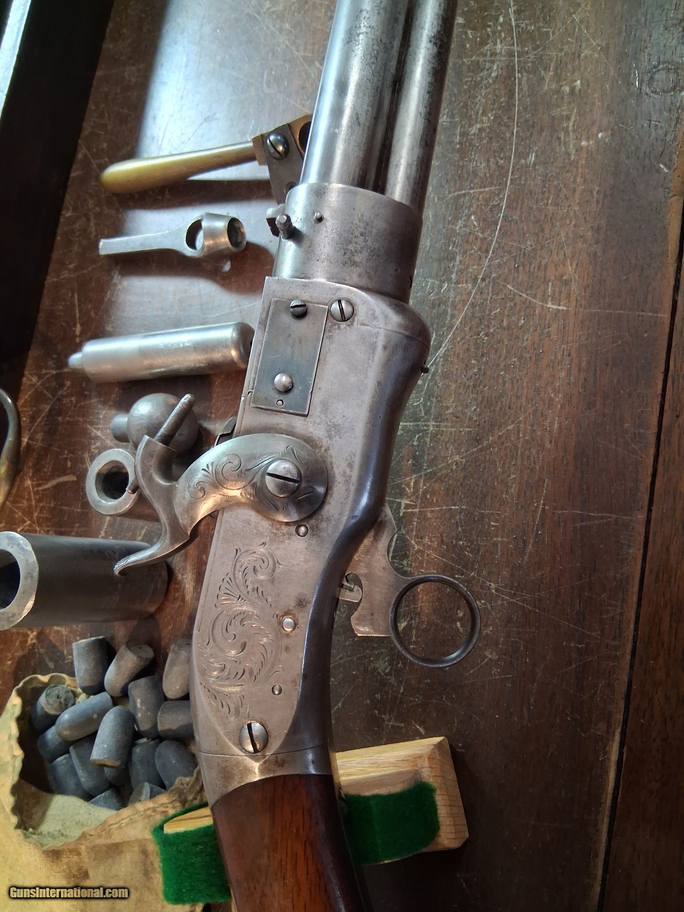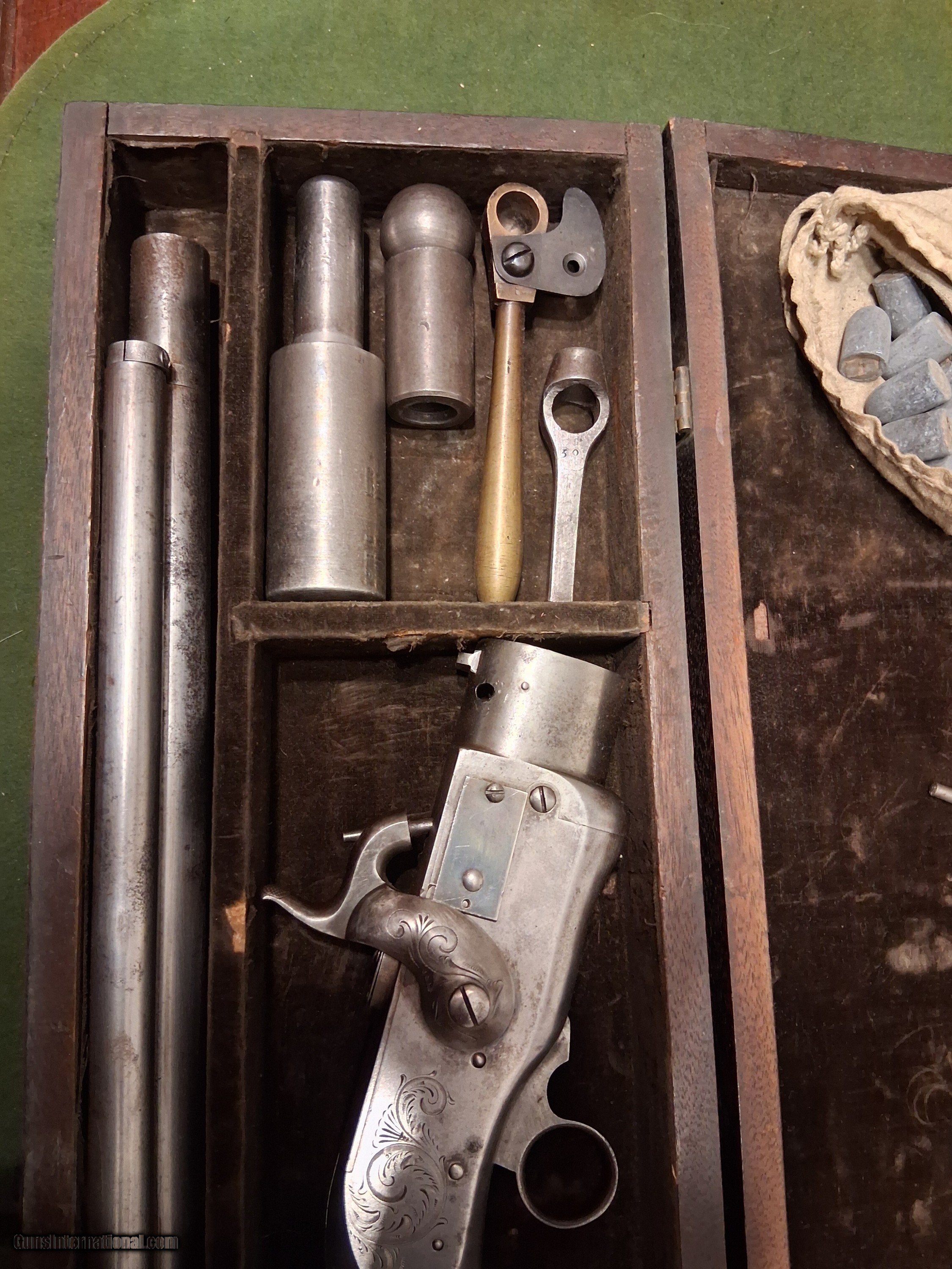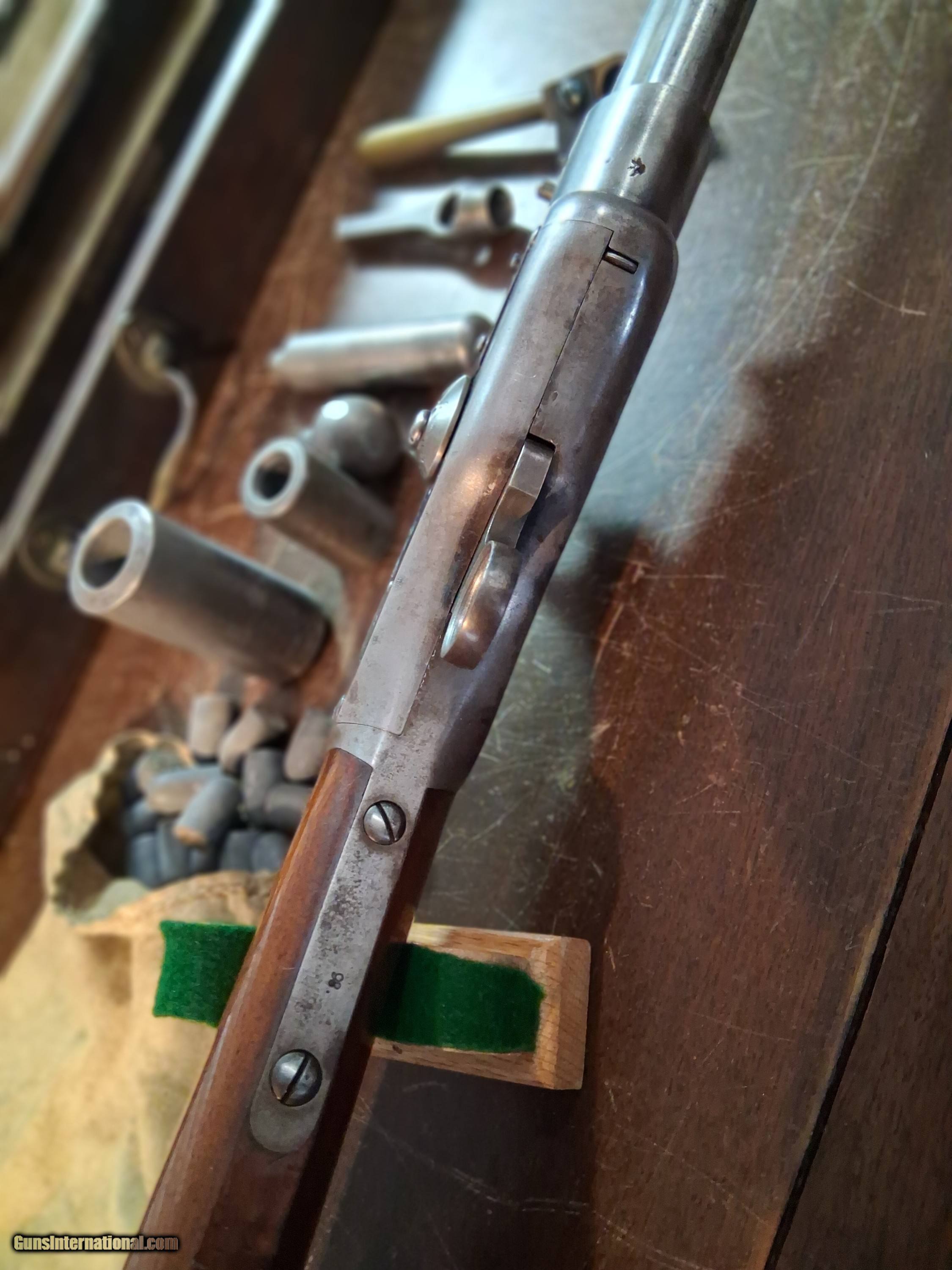 Description: SMITH JENNINGS 1st model REPEATING RIFLE 54cal PERCUSSION with LOADING TOOLS & CASE 1850,marked on left side of frame "ROBBINS & LAWRENCE MAKERS WINDSOR VT.C.P. DIXON AGENT NEW YORK PATENTED 1849" 26' barrel 7 groove rifling bright & shiny,HAS BOTH PRIMING PILL PANS SEE PICS,MISSING MAGAZINE SPRING & FOLLOWER,WOOD STOCK IN EXCELLENT CONDITION WITH ORIGINAL VARNISH,MAGAZINE TUBE HOLDS 12 ROCKET BALLS,THE BARREL & FRAME DOES NOT HAVE ANY BROWN FINISH ,CASE COLOR TRIGGER, & A LITTLE ON HAMMER SEE PICS,HAS A CASE WITH TOOLS & BULLET MOLD TO MAKE ROCKET BALLS & THERE IS SOME ROCKET BALLS. MADE 1850-EARLY 1851 NO MORE THAN 500 MADE, YOU CAN COME TO SEE IT IN N.J.WILL SHIP INSURED OR YOU CAN PICK UP Antique: Yes Price: $30,000.00 Buy Now Contact Seller |