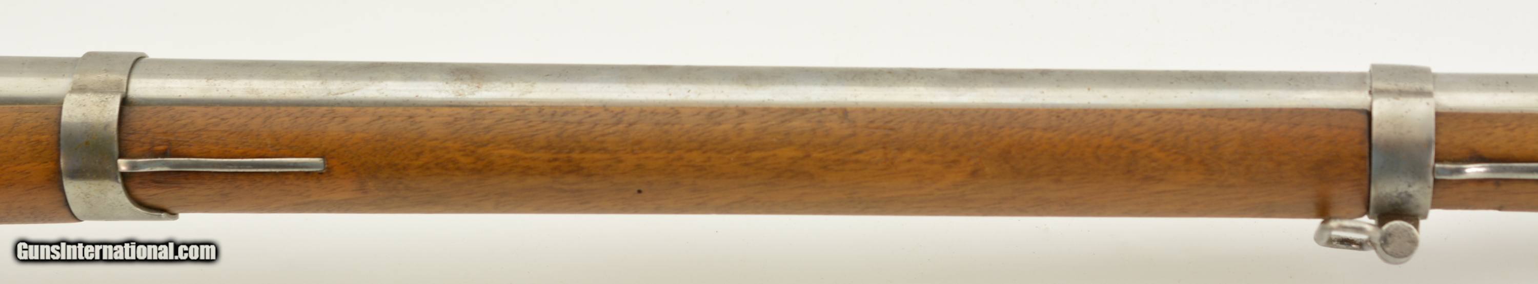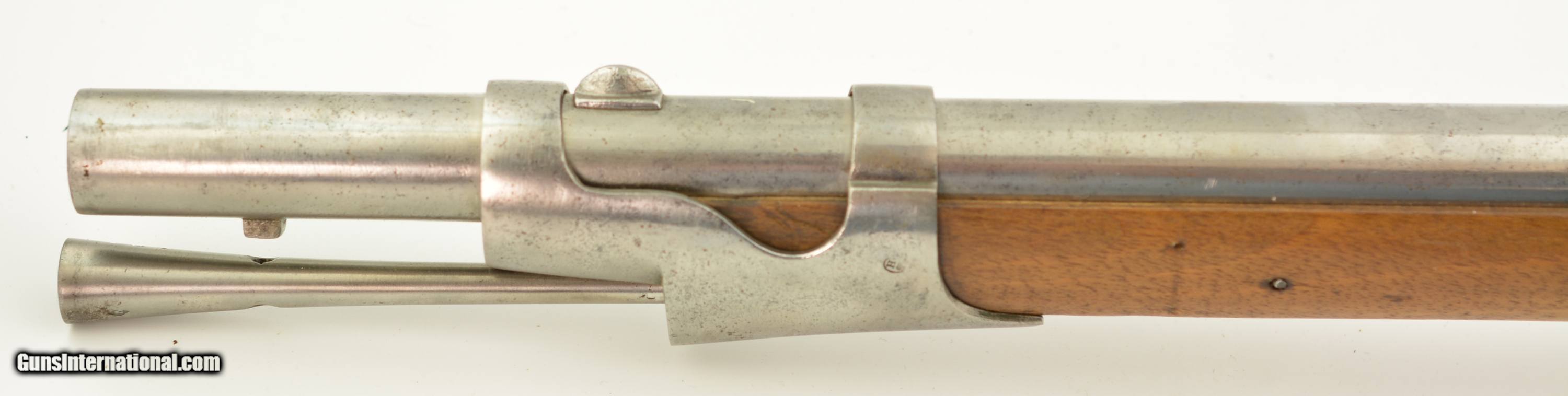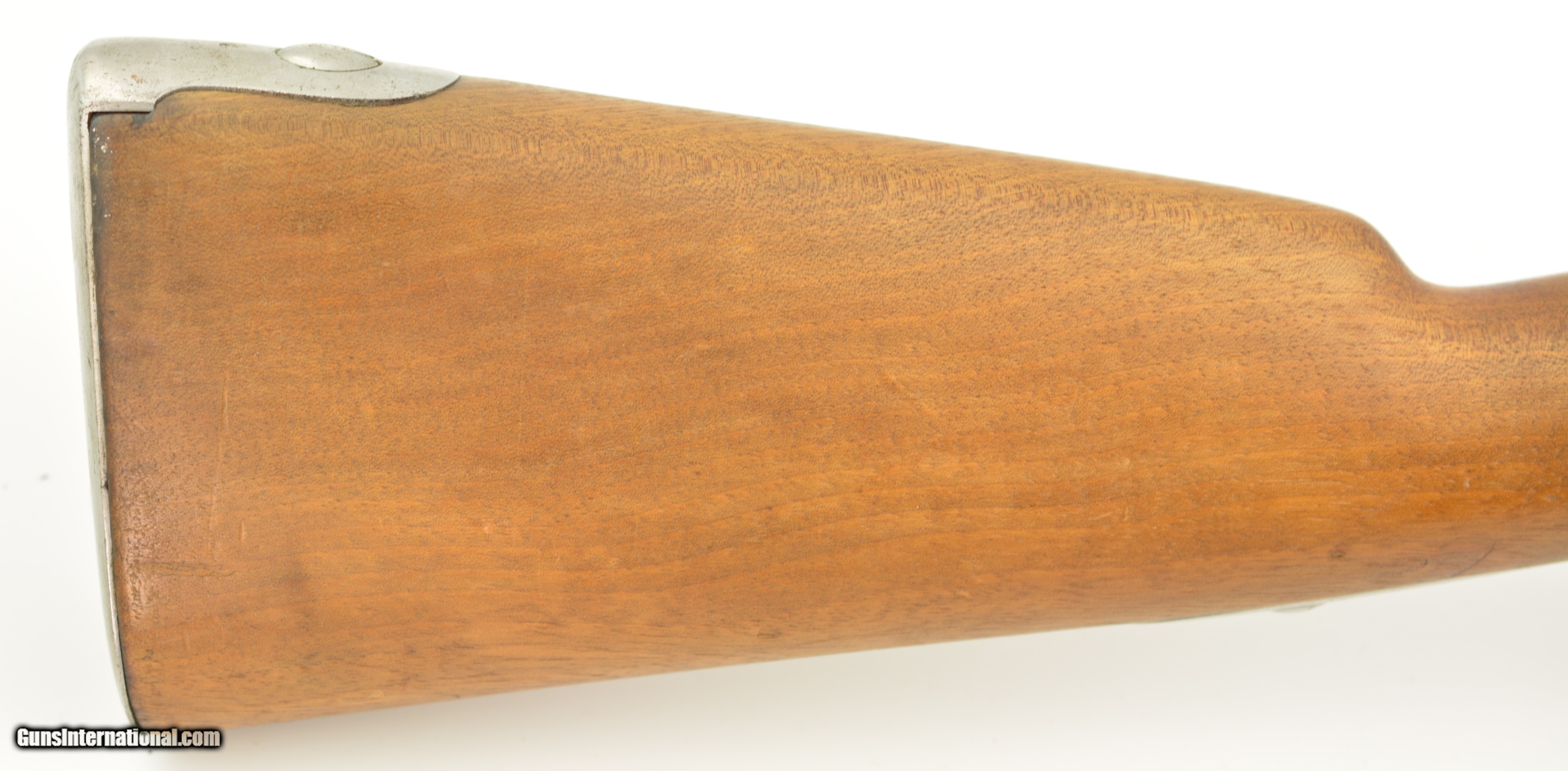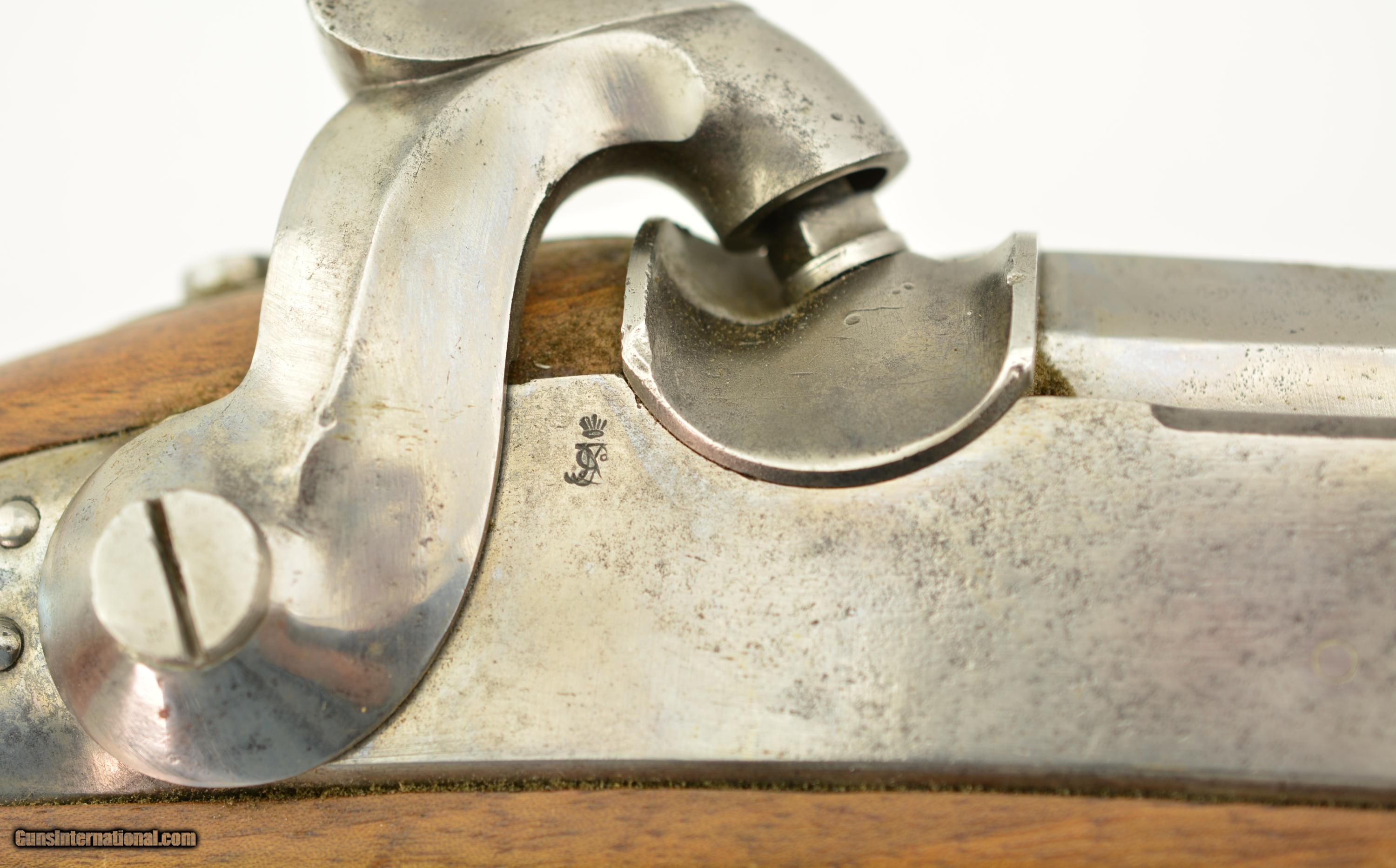 Description: Serial #13148, .70 Caliber, 42 1/2" barrel with a fair, darkly freckled bore. This is a well-made and sturdy musket that has an overall armory bright finish with scattered small spots of thin, plum-brown freckling along its length, most noticeably on the blunt-faced lockplate. The metal was cleaned long ago, but the high edges and markings were left crisp and clear, including the "VAUD" cantonal marking on the left side of the barrel breech. There are some small patches of pinprick pitting at the unusual stirrup-style rear sight, barrel breech, and around the nipple bolster as well. The matching numbered stock is in about fine shape with an armory reapplied military oil finish over scattered small handling marks and minor surface blemishes. Additionally, there are some small scratches in the wood just ahead of the lockplate, as well as a large discolored area on the left side of the wrist. The "VAUD / 13148" stock number is still crisp and clear on the left side of the buttstock. The action is fully functional, and an original ramrod is included. This is a rarely seen Swiss percussion musket, with a matching numbered stock, and in about fine condition. Antique SOLD |