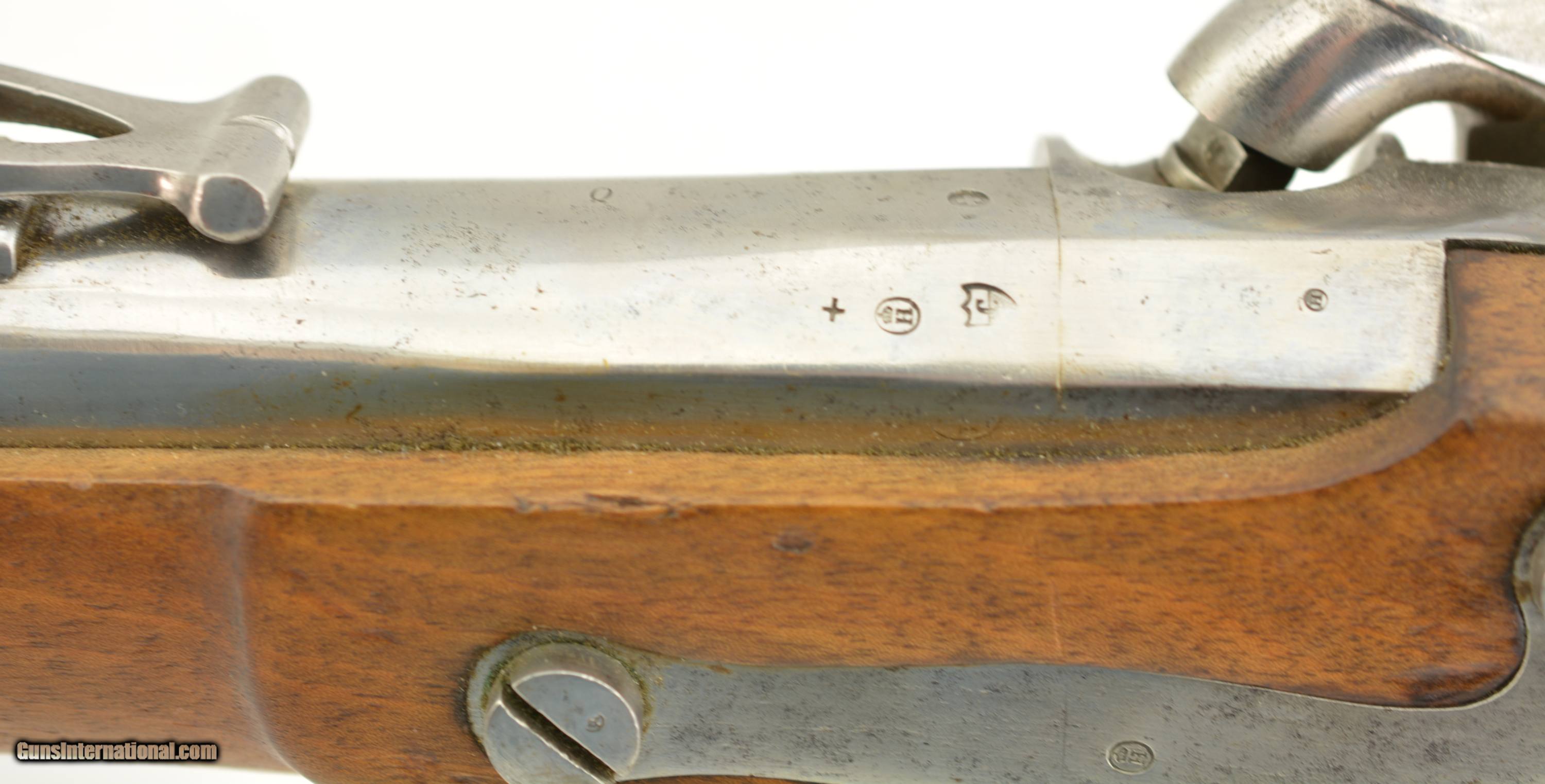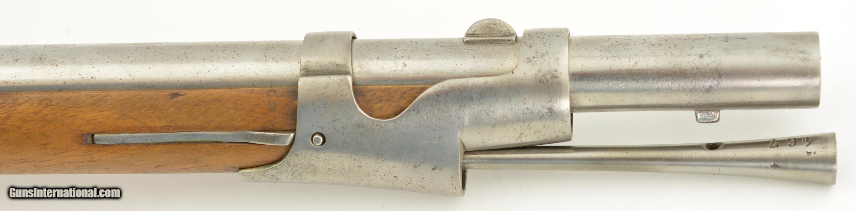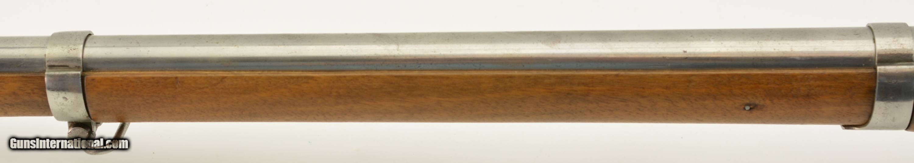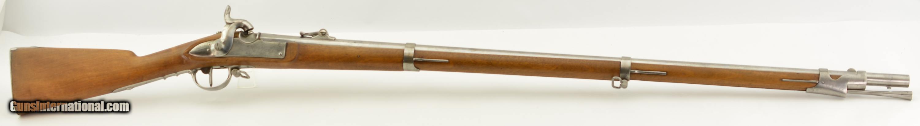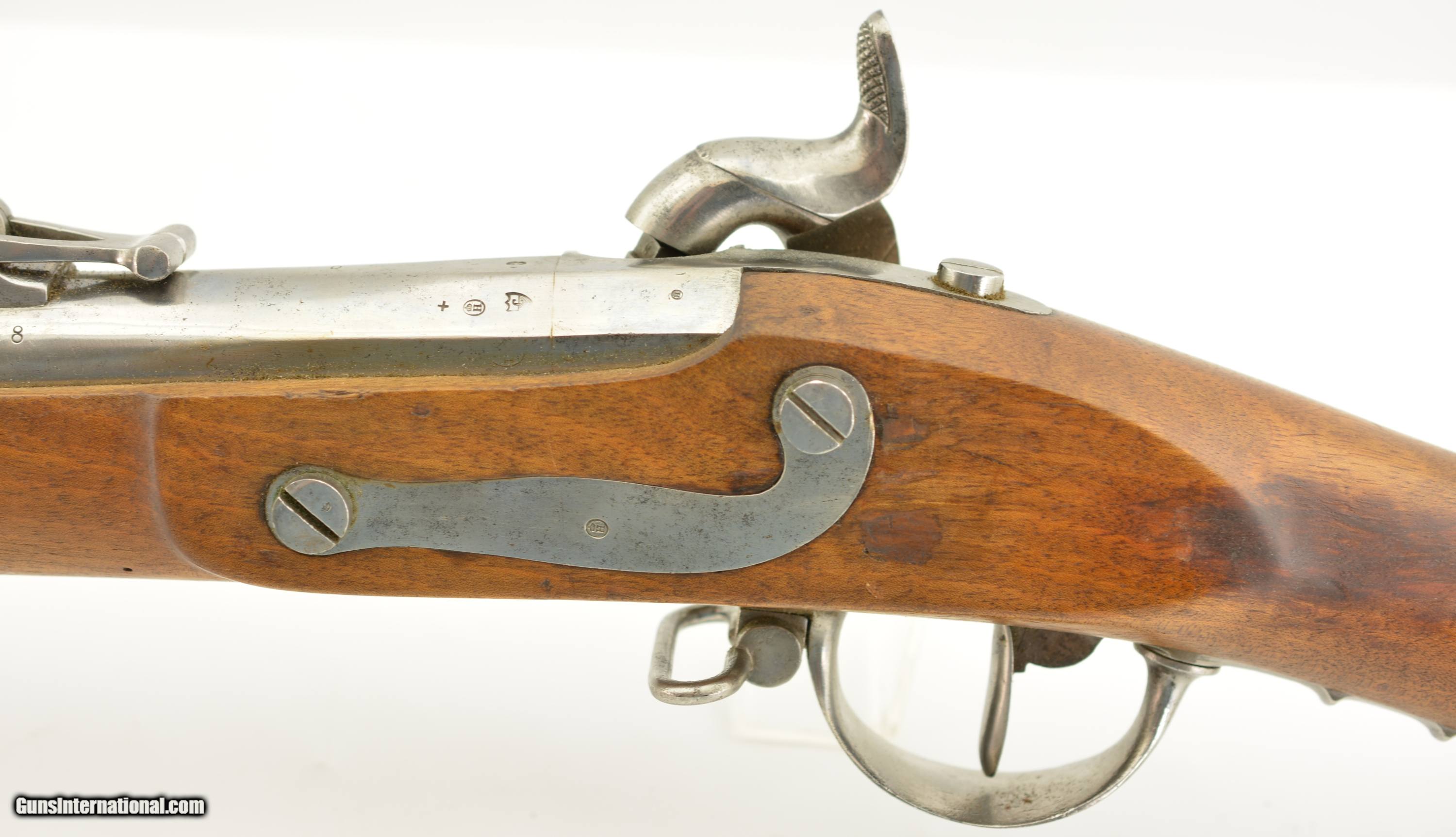 Description: Serial #13148, .70 Caliber, 42 1/2" barrel with a fair, darkly freckled bore. This is a well-made and sturdy musket that has an overall armory bright finish with scattered small spots of thin, plum-brown freckling along its length, most noticeably on the blunt-faced lockplate. The metal was cleaned long ago, but the high edges and markings were left crisp and clear, including the "VAUD" cantonal marking on the left side of the barrel breech. There are some small patches of pinprick pitting at the unusual stirrup-style rear sight, barrel breech, and around the nipple bolster as well. The matching numbered stock is in about fine shape with an armory reapplied military oil finish over scattered small handling marks and minor surface blemishes. Additionally, there are some small scratches in the wood just ahead of the lockplate, as well as a large discolored area on the left side of the wrist. The "VAUD / 13148" stock number is still crisp and clear on the left side of the buttstock. The action is fully functional, and an original ramrod is included. This is a rarely seen Swiss percussion musket, with a matching numbered stock, and in about fine condition. Antique SOLD |