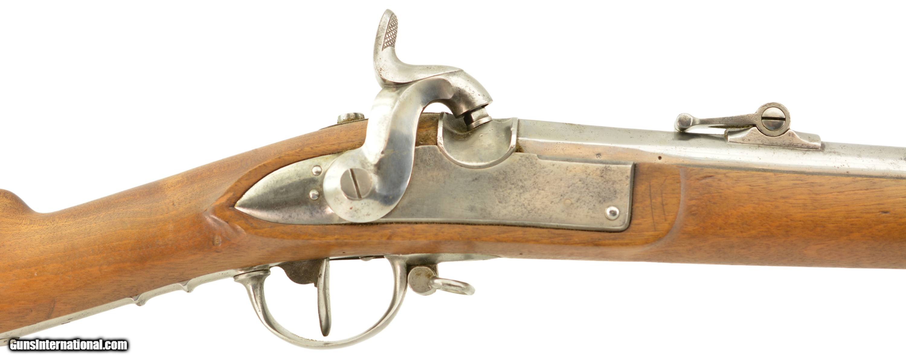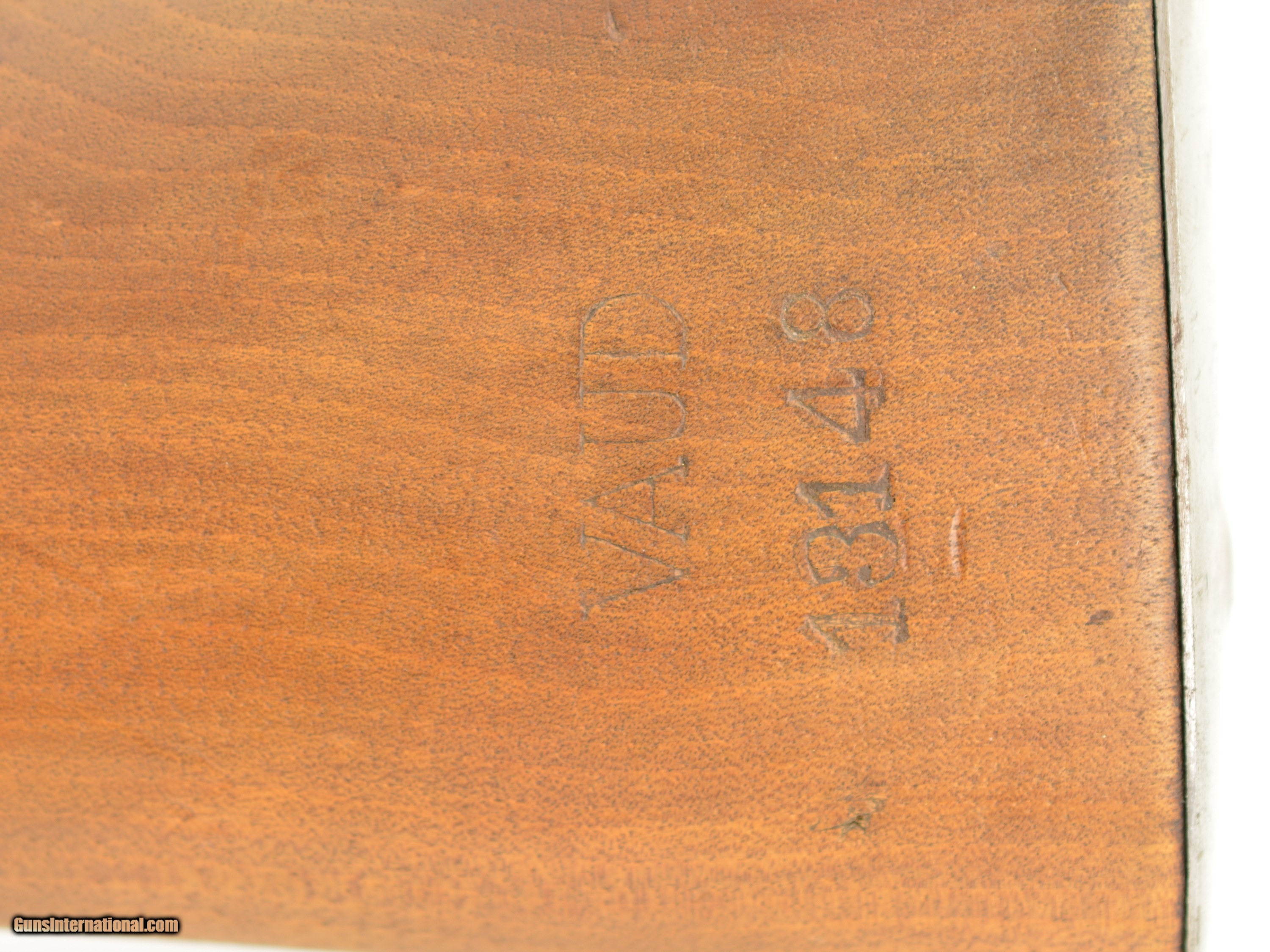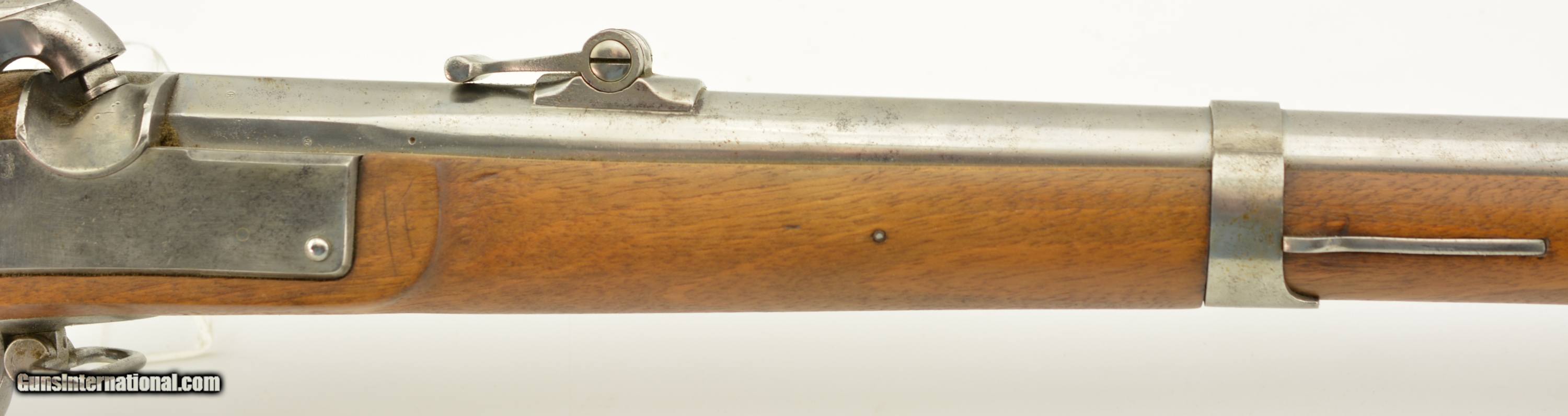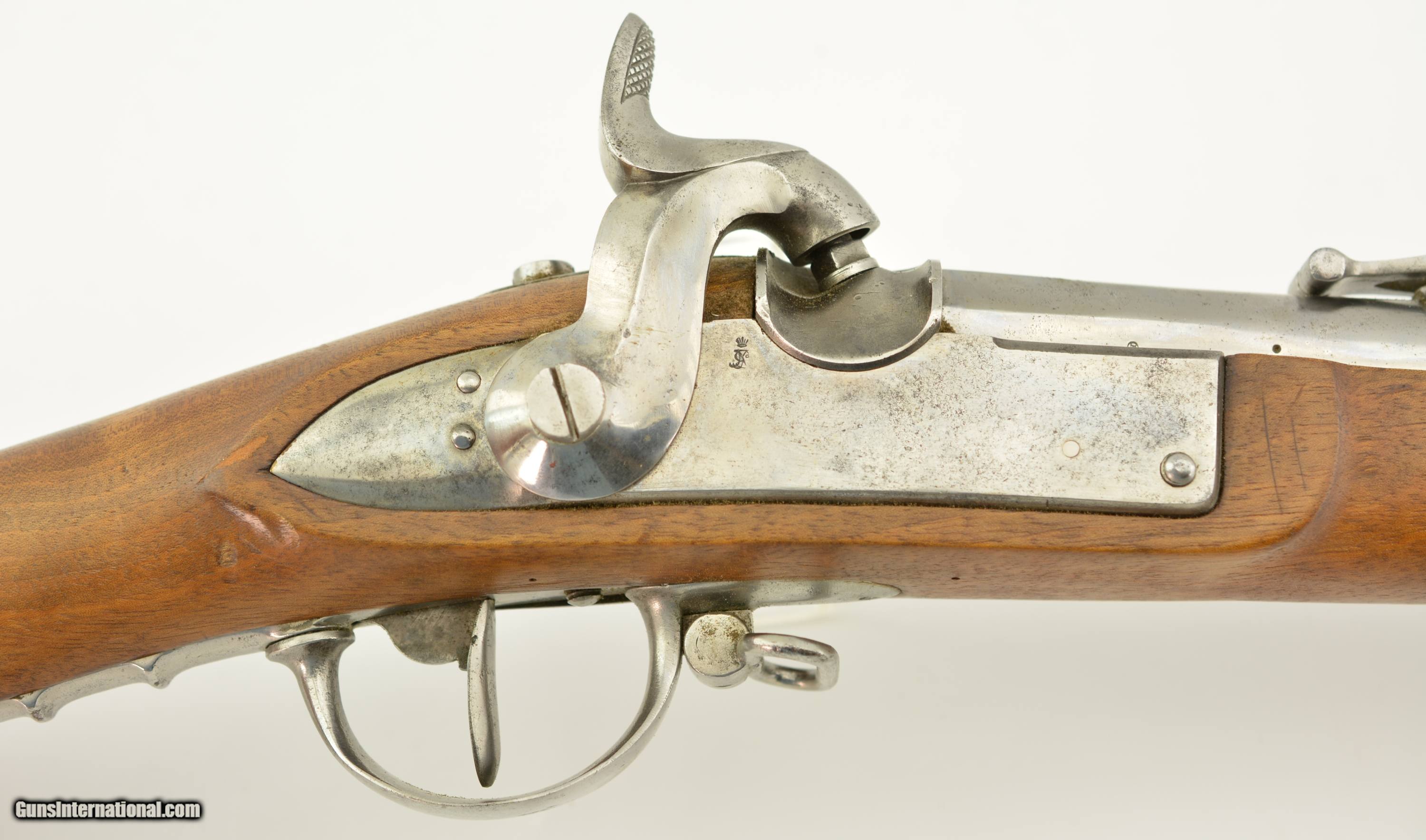 Description: Serial #13148, .70 Caliber, 42 1/2" barrel with a fair, darkly freckled bore. This is a well-made and sturdy musket that has an overall armory bright finish with scattered small spots of thin, plum-brown freckling along its length, most noticeably on the blunt-faced lockplate. The metal was cleaned long ago, but the high edges and markings were left crisp and clear, including the "VAUD" cantonal marking on the left side of the barrel breech. There are some small patches of pinprick pitting at the unusual stirrup-style rear sight, barrel breech, and around the nipple bolster as well. The matching numbered stock is in about fine shape with an armory reapplied military oil finish over scattered small handling marks and minor surface blemishes. Additionally, there are some small scratches in the wood just ahead of the lockplate, as well as a large discolored area on the left side of the wrist. The "VAUD / 13148" stock number is still crisp and clear on the left side of the buttstock. The action is fully functional, and an original ramrod is included. This is a rarely seen Swiss percussion musket, with a matching numbered stock, and in about fine condition. Antique SOLD |