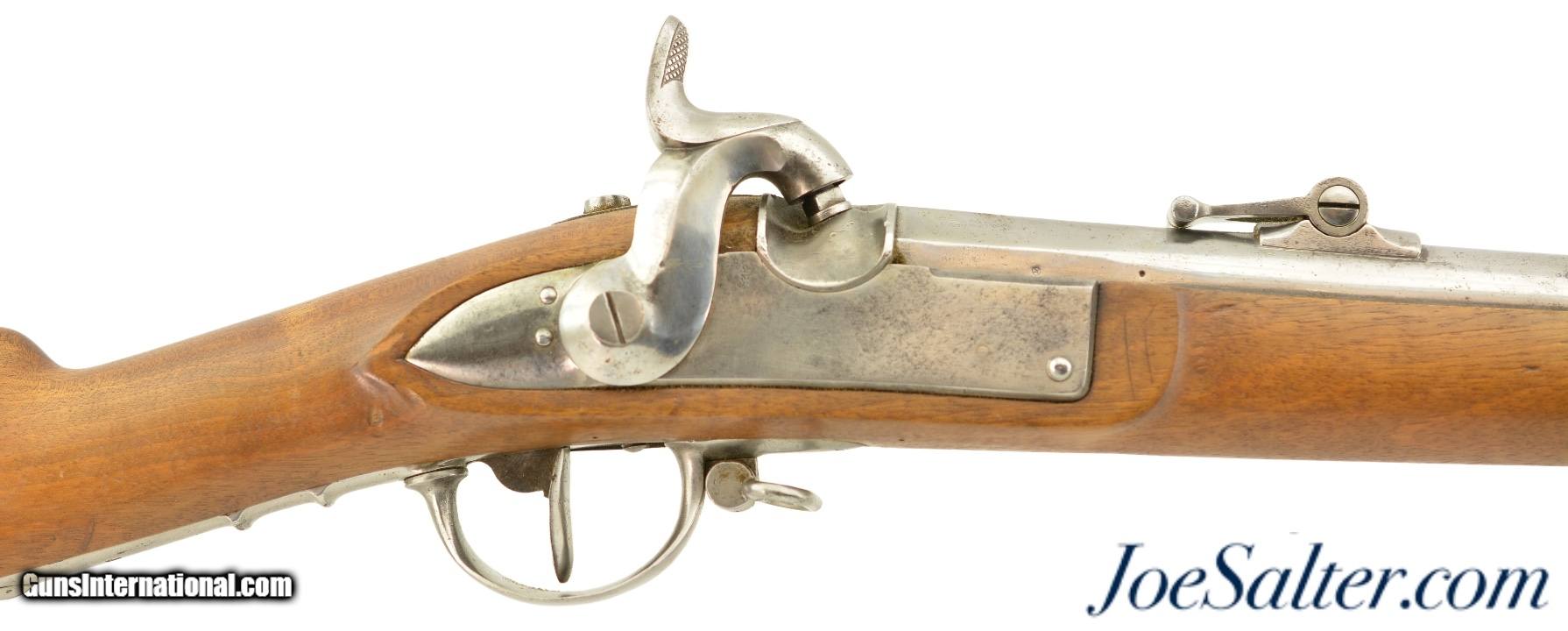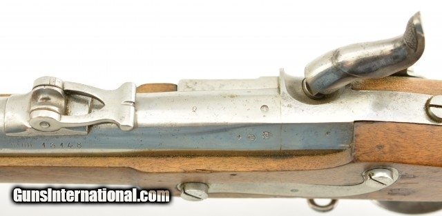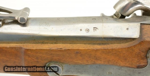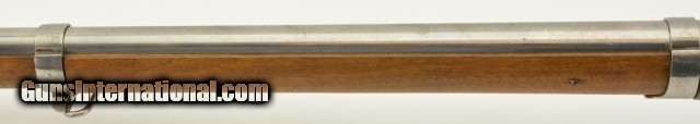 Description: Serial #13148, .70 Caliber, 42 1/2" barrel with a fair, darkly freckled bore. This is a well-made and sturdy musket that has an overall armory bright finish with scattered small spots of thin, plum-brown freckling along its length, most noticeably on the blunt-faced lockplate. The metal was cleaned long ago, but the high edges and markings were left crisp and clear, including the "VAUD" cantonal marking on the left side of the barrel breech. There are some small patches of pinprick pitting at the unusual stirrup-style rear sight, barrel breech, and around the nipple bolster as well. The matching numbered stock is in about fine shape with an armory reapplied military oil finish over scattered small handling marks and minor surface blemishes. Additionally, there are some small scratches in the wood just ahead of the lockplate, as well as a large discolored area on the left side of the wrist. The "VAUD / 13148" stock number is still crisp and clear on the left side of the buttstock. The action is fully functional, and an original ramrod is included. This is a rarely seen Swiss percussion musket, with a matching numbered stock, and in about fine condition. Antique SOLD Antique: Yes |