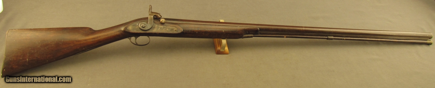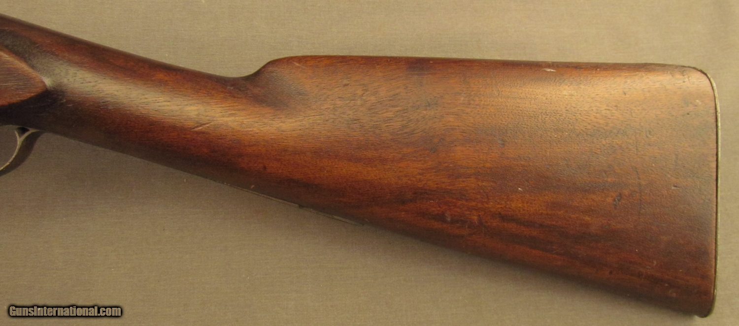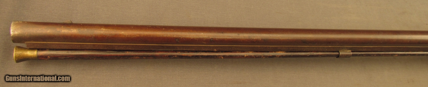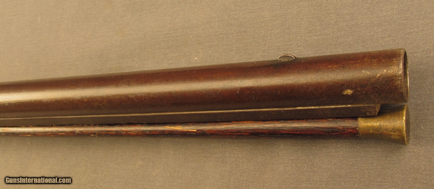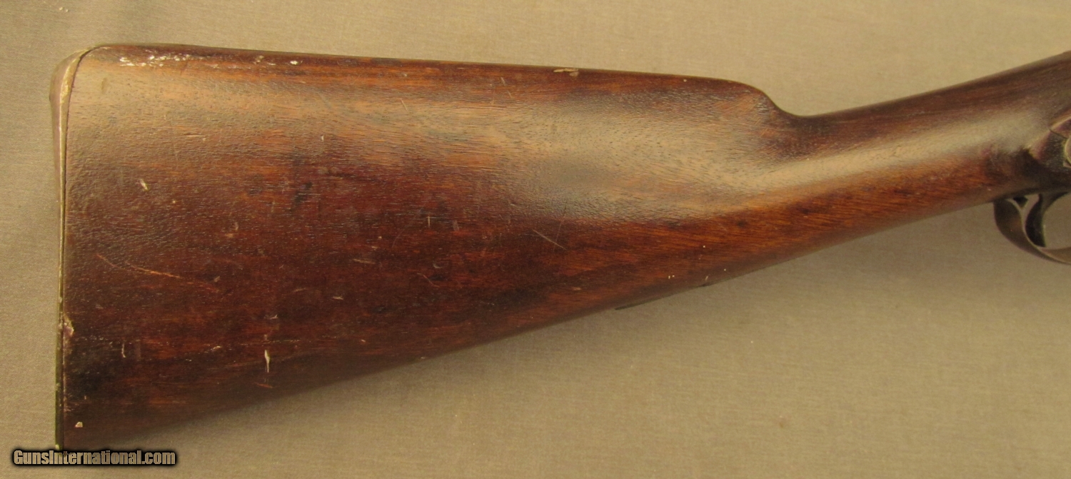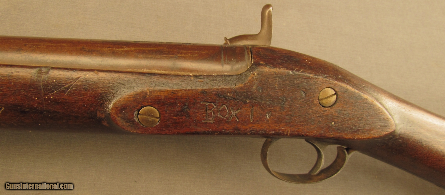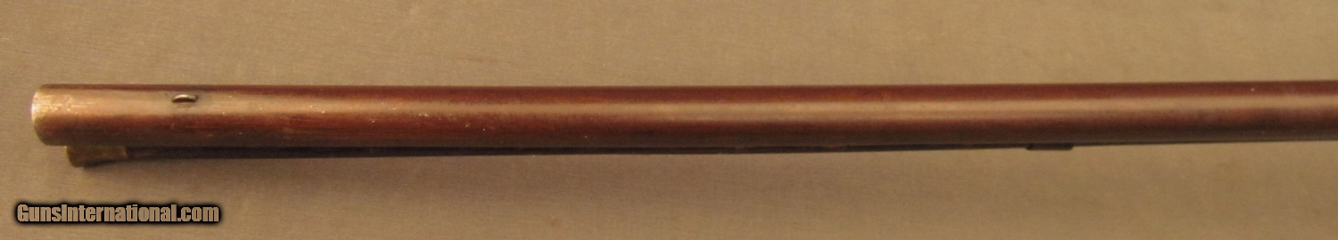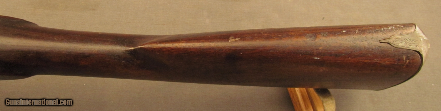 Description: An uncommon trade gun with a barrel from an East Indian Company Musket. This piece shows the 4 over heart EIC logo on the 39 1/2" barrel. The finis typical trade with crown at the rear and a 1863 date over tower. The lock shows strong original color. The hammer, drum and nipple are very sound. The overall length is 53" , the stock is the original 1/2 stock configuration with an unusual box 1 carved in the side flat on the left side (storage, security or transport container). This piece shows a sound rib with only the front rod retainer missing. The rod is the original with the brass fittings at both ends. This is an unusual trade piece that utilized an original East India Co barrel. Condition not a common patter of trade gun as usually found in North America. SOLD Antique: Yes Manufacturer: East India Co. Model: Percussion |