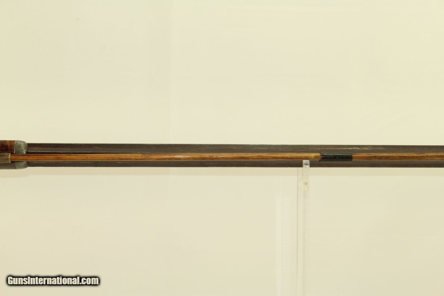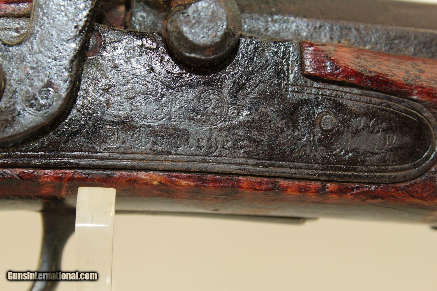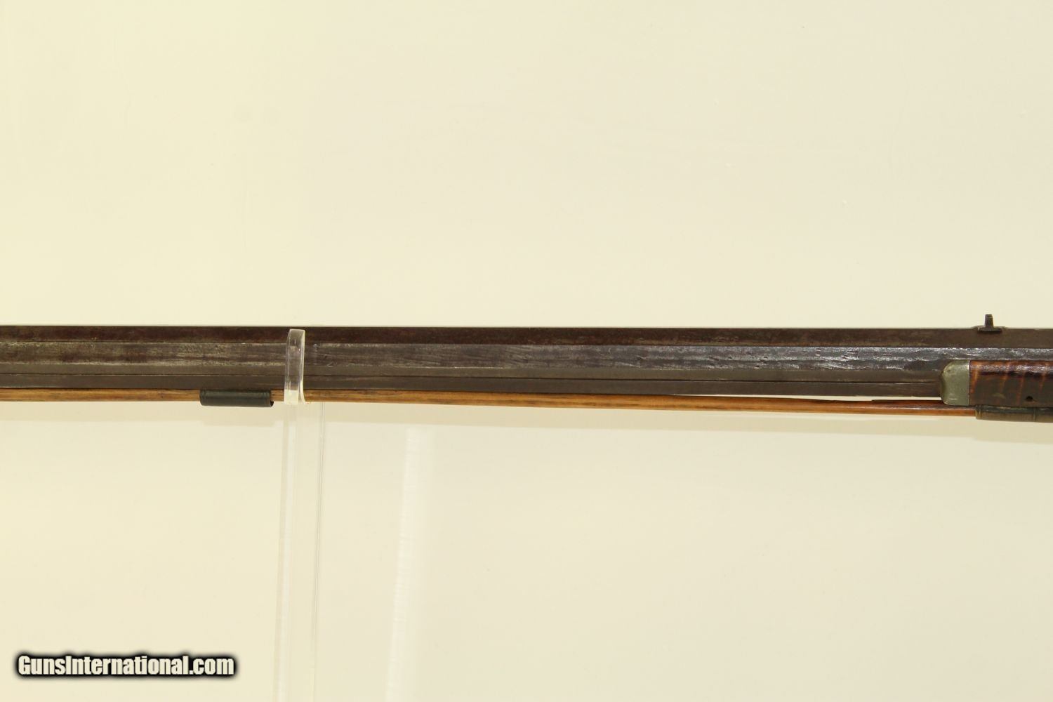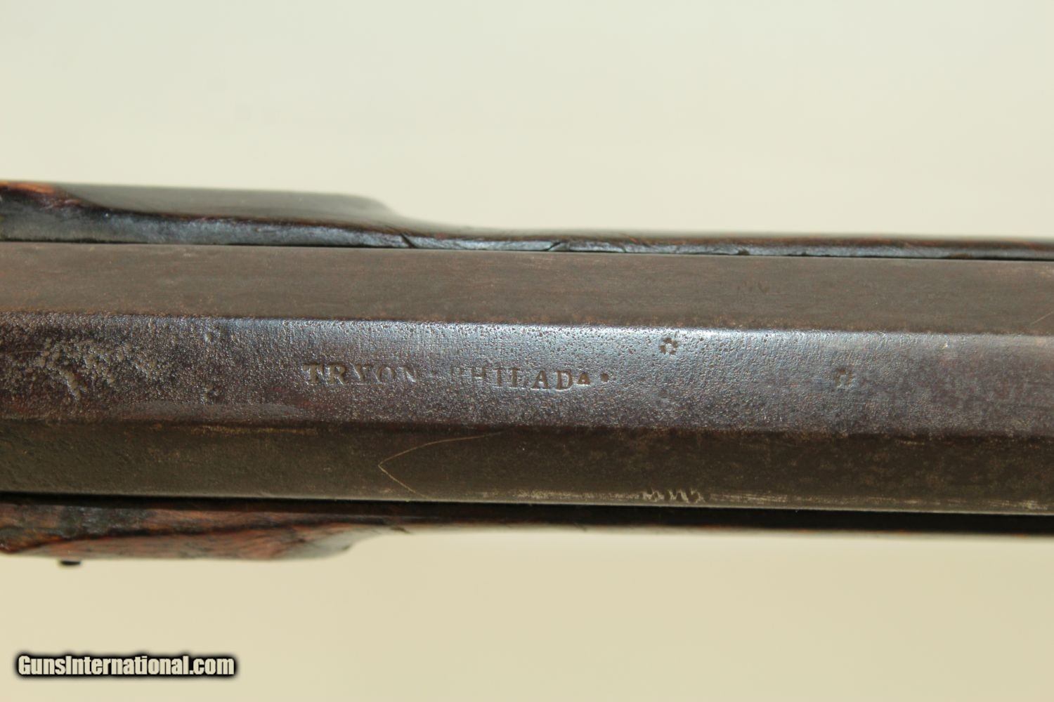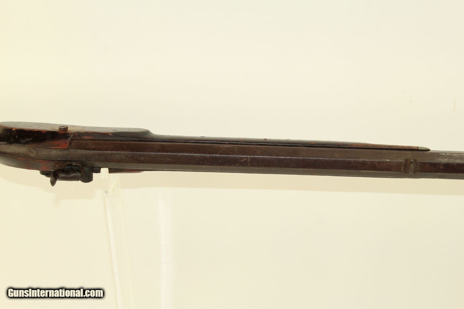Description: TYRON Half Stock .40 Caliber American LONG RIFLE ELK COUNTY, Pa. Style Manufactured by “TYRON of Philadelphia” Here we present an antique Half-Stock Back Action Long Rifle, made circa the 1850s by Edward Tyron of Philadelphia, PA. The Tyron family business started in the early 1700s with a merchant from Holland bringing arms and Indian trade goods for sale into this "New Country" and continued for over 150 years. The business prospered as a gun and gun parts dealer in the early 1800s and evolved into a leading wholesale house and hardware store in the early twentieth century. The Tryon story is important to collectors because it was in the center of the gun trade in our new country and, more specifically, in the Philadelphia area. The picture of Tryon as a gun maker is often clouded by Tryon's hardware store image of the late 1800s and the 1900s. The sale of imported and brand-name arms during this later period led many to consider Tryon merely another early Sears and Roebuck or Montgomery Ward with arms as a side line, when he was actually one of the leading gunmakers of high quality guns in the mid-1800s. This rifle features a J. Goulcher marked lock. The top of the barrel is marked “TRYON” and “PHILADA”. It bears a fancy patch box set into the right side of the stock. The maple stock has very nice grain. The overall condition is very good. The iron parts are dark with age. The markings are legible. The stock is in good shape. The butt plate stops short of the toe and there is a somewhat crude strap that has been mounted to the bottom of the stock there. The bore is dark and dusty with deep rifling. The action remains excellent. Here is a good-looking gun that would have been a game-getter for the table and a measure of protection for the homestead in mid-19th Century America. Own the original! This is a legitimate antique and not a reproduction. Barrel is 41 inches. Caliber: .36 Percussion Overall condition as seen in photos. Very Fast. Very Safe. FREE SHIPPING WORLDWIDE. Delivered directly to your door by express mail! Guaranteed AUTHENTIC & Includes CERTIFICATE OF AUTHENTICITY. ancestryguns $1350 #190340 SOLD Antique: Yes |