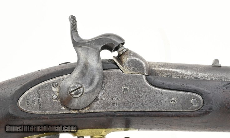 U.S. Model 1841 percussion “Mississippi” Rifle. By George W. Tryon of Philadelphia. The Mississippi rifle got its name due to its use during the Mexican-American War by a Mississippi regiment commanded by Jefferson Davis. The overall length is approximately 48½”. The 33” round .54 caliber barrel has a fine, bright bore with strong rifling. Barrel has a smooth brown patina, except in the bolster area where there is light pitting, and is marked “US/JH/P” at the breech. It also has small “H” sub inspection stamp on the left flat, side plate, and trigger guard. The lock has a gray patina. It has “Tryon/US” at the center and “Philada/PA/1844” at the tail. The hammer has most of its original blue finish. The bands, trigger guard, patch box, and buttplate show a nicely aged brass patina. The stock is very good with a scattering of issue/use dents and dings and a 1” missing chip on the left at the barrel between the bands. There are two strong cartouches and the spare nipple is in the patchbox. The two swivels and ramrod are present. The action functions correctly. Out of the approximately 91,800 Mississippi rifles, made by five manufactures, Tryon made the fewest, 5000. This is a nice example of a Mexican-American War Mississippi rifle made by the hardest to find manufacturer. It’s good for a Mexican-American War or Civil War collection.