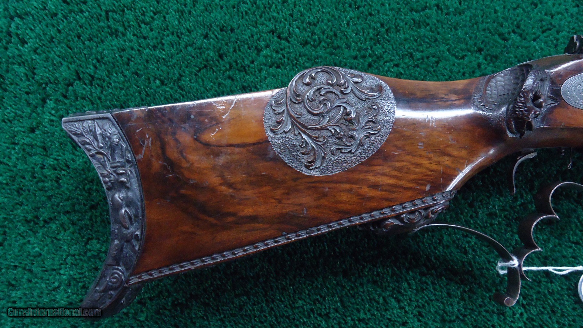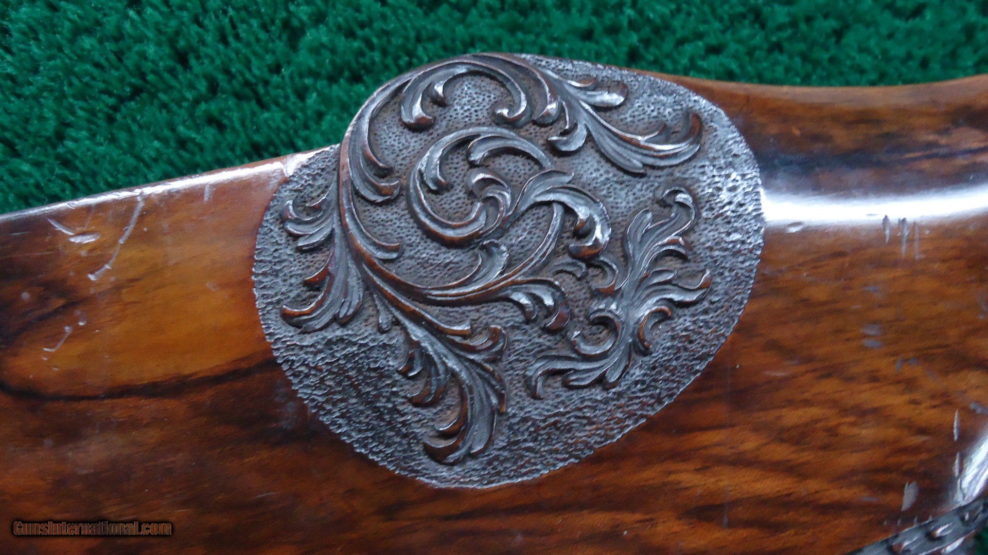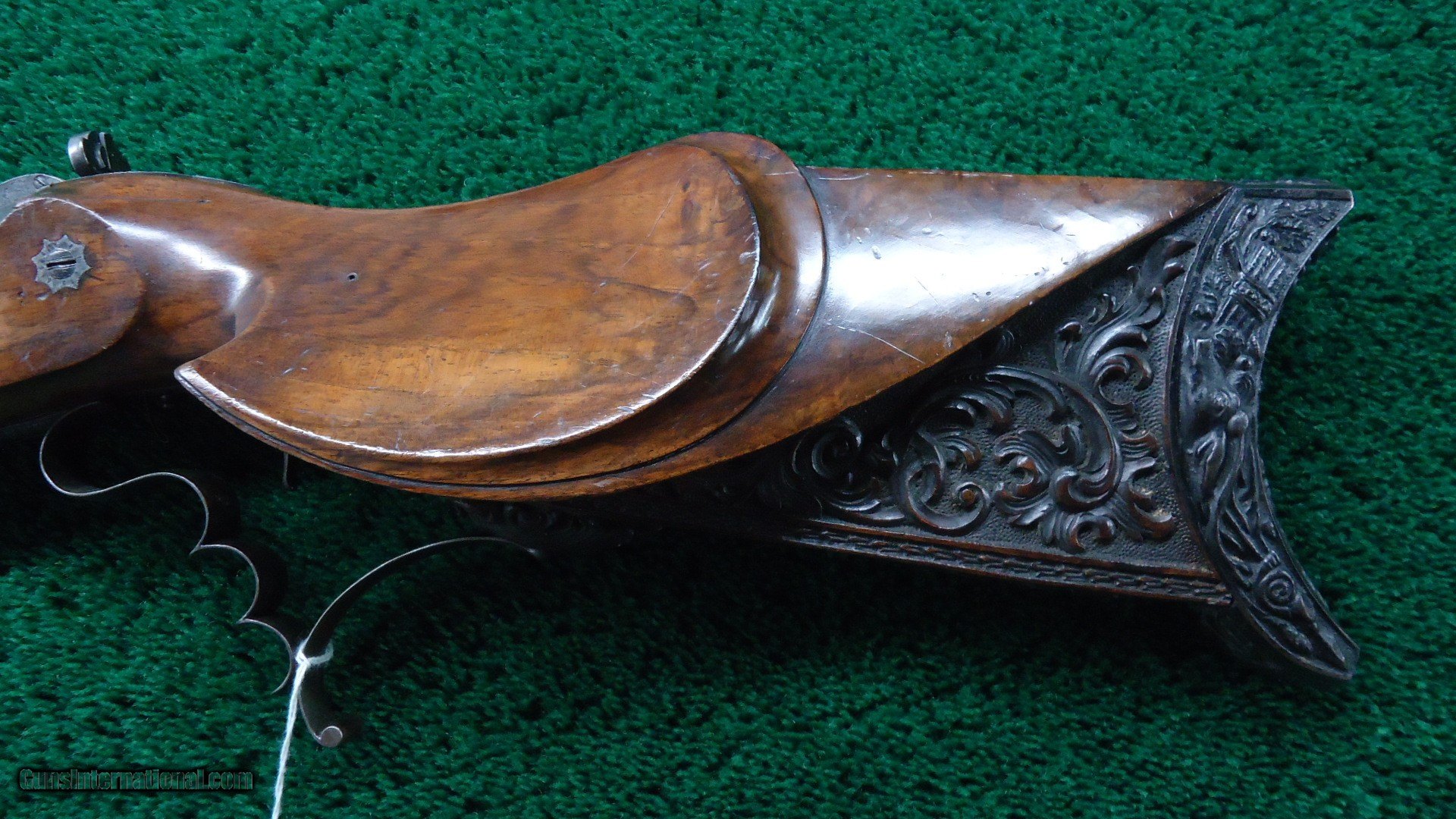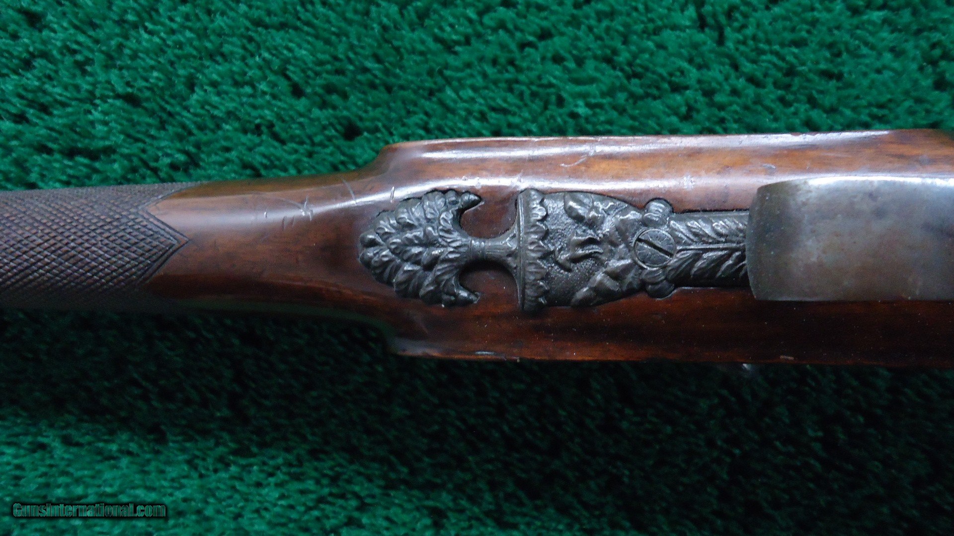Description: Very interesting gun. On top of the breech is a beautifully engraved Roman soldier. Just a head of the barrel is the makers name is deeply chiseled into the barrel. Gun has a 33 inch octagon barrel. Bore is excellent. Hooded rear barrel sight and correct tang sight. Wood has quite an elaborate cheek piece and rear stock is nicely carved. Buttplate, trigger guard and other pieces are deep relief engraved. I don't know if they are cast bronze? Definitely high quality. Delicate set trigger that works very good. Metal has turned a darker color with good finish remaining. Stock is in beautiful condition. Leroy Merz Antique Firearms specializes in antique and vintage Winchesters and other fine American firearms. Since 1965 Mr. Merz has taken part in the world of firearms and has been a contributor to many well known reference books. We have hundreds of additional guns in every price range at our home online. Search for Merz Antiques in google. SOLD Antique: Yes |