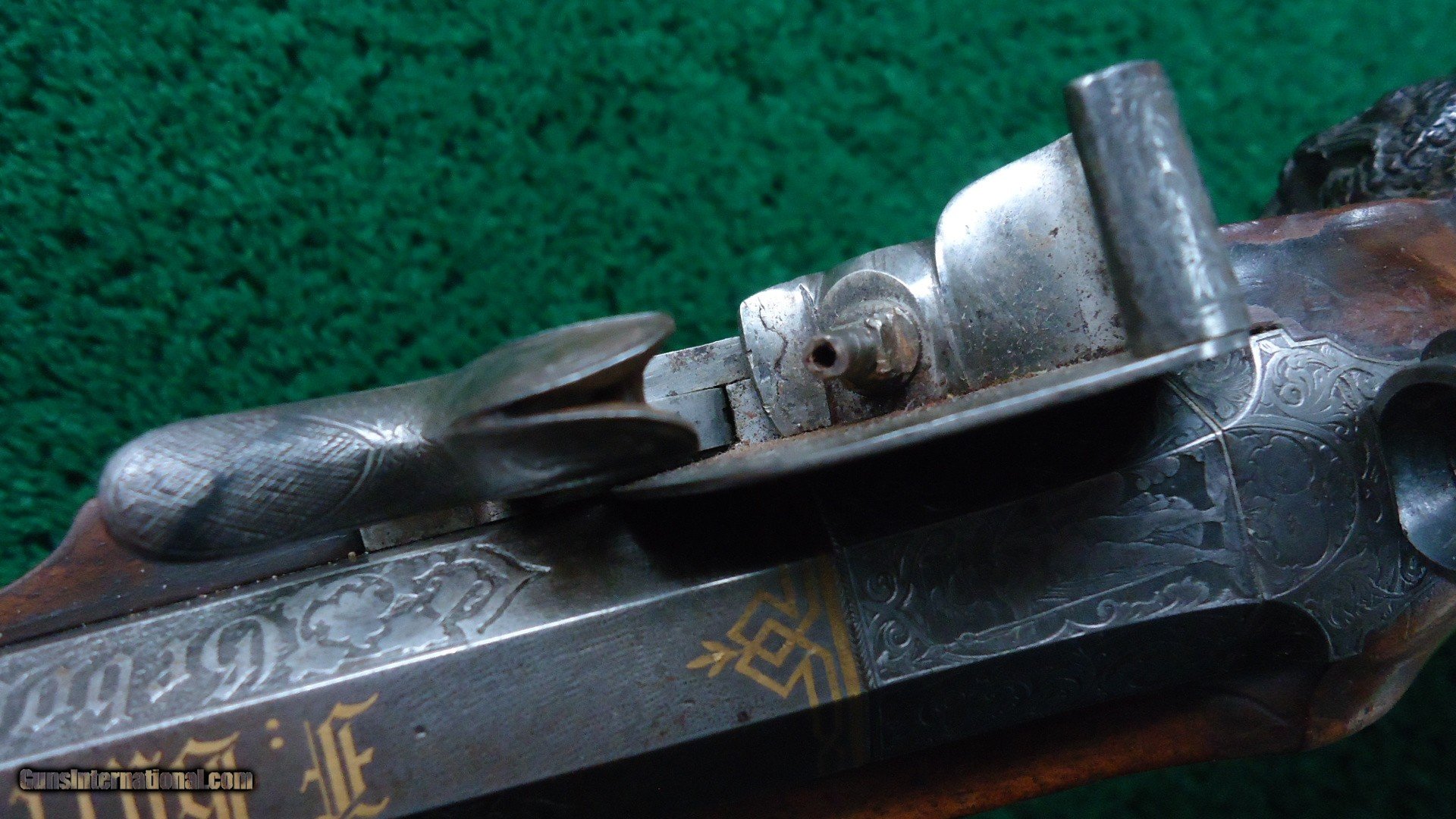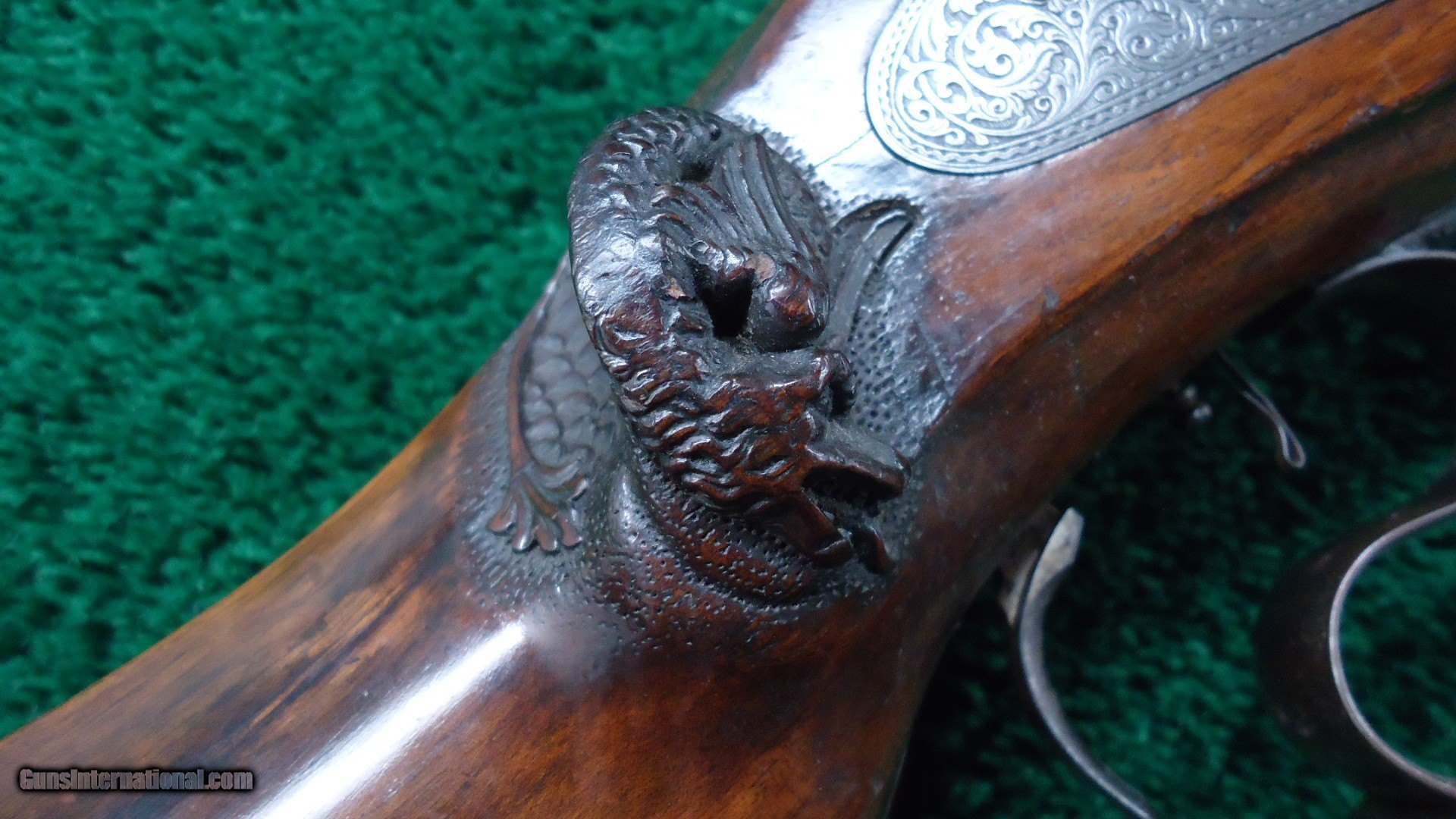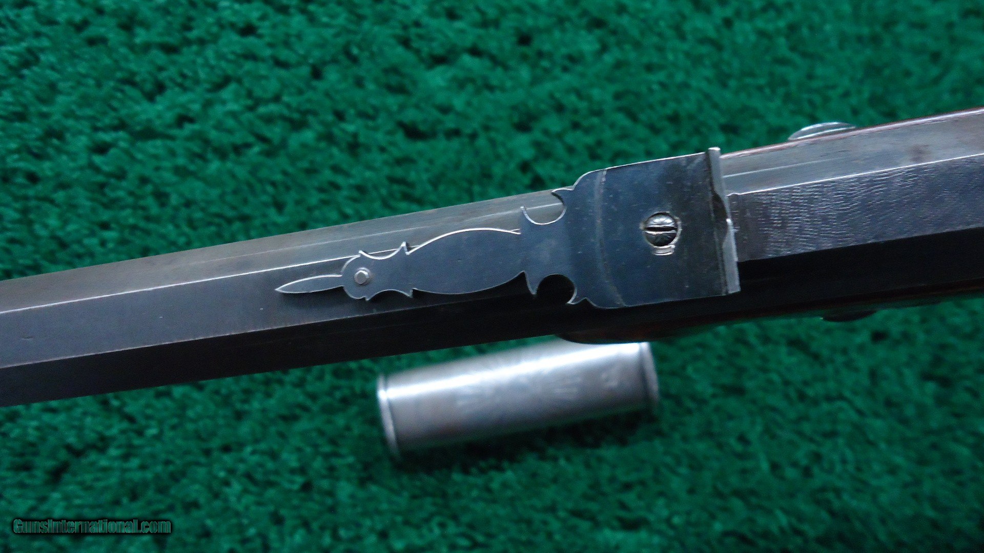 Description: Very interesting gun. On top of the breech is a beautifully engraved Roman soldier. Just a head of the barrel is the makers name is deeply chiseled into the barrel. Gun has a 33 inch octagon barrel. Bore is excellent. Hooded rear barrel sight and correct tang sight. Wood has quite an elaborate cheek piece and rear stock is nicely carved. Buttplate, trigger guard and other pieces are deep relief engraved. I don't know if they are cast bronze? Definitely high quality. Delicate set trigger that works very good. Metal has turned a darker color with good finish remaining. Stock is in beautiful condition. Leroy Merz Antique Firearms specializes in antique and vintage Winchesters and other fine American firearms. Since 1965 Mr. Merz has taken part in the world of firearms and has been a contributor to many well known reference books. We have hundreds of additional guns in every price range at our home online. Search for Merz Antiques in google. SOLD Antique: Yes |
