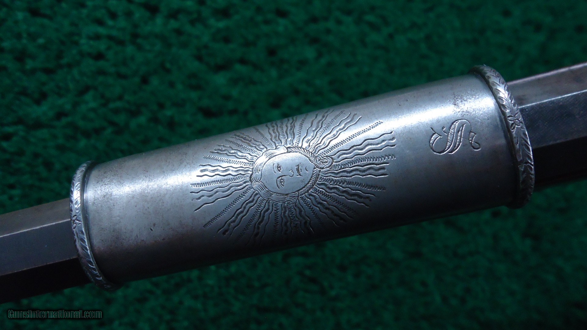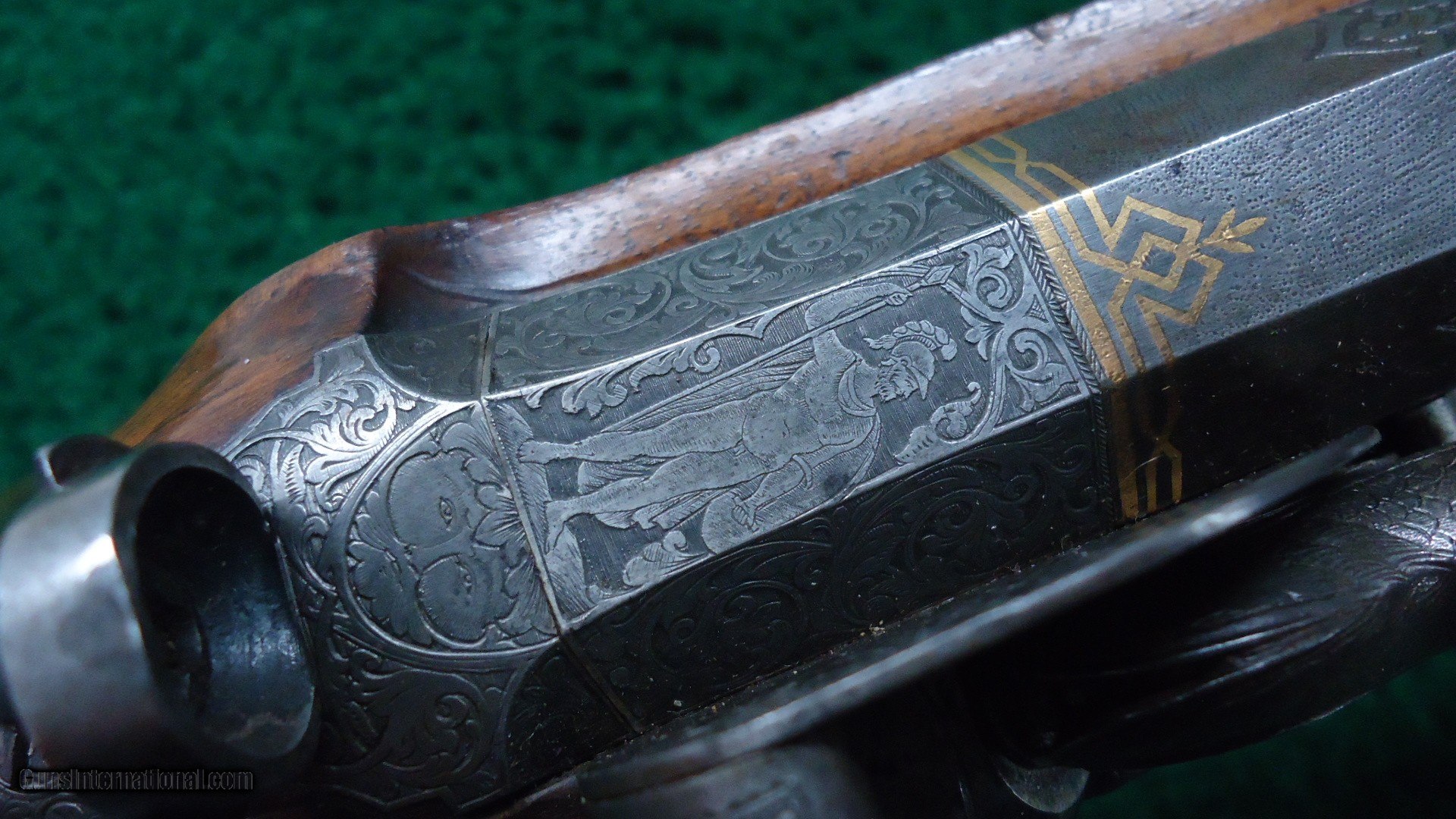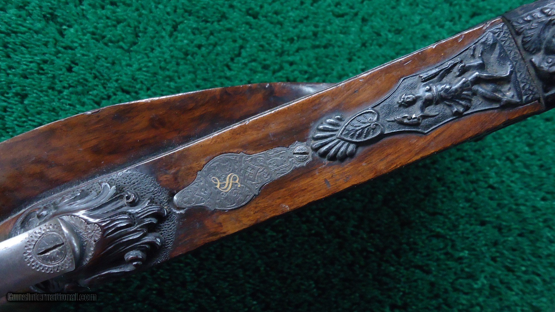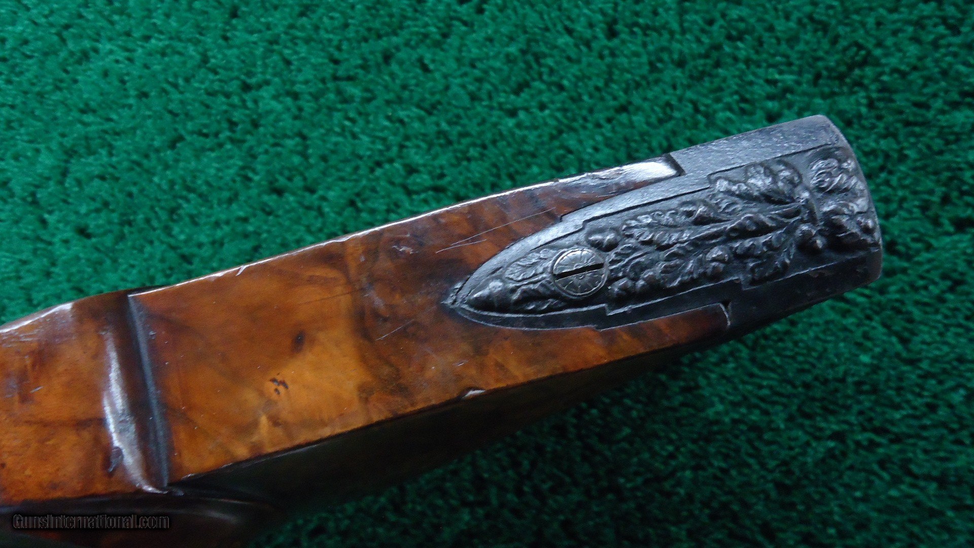 Description: Very interesting gun. On top of the breech is a beautifully engraved Roman soldier. Just a head of the barrel is the makers name is deeply chiseled into the barrel. Gun has a 33 inch octagon barrel. Bore is excellent. Hooded rear barrel sight and correct tang sight. Wood has quite an elaborate cheek piece and rear stock is nicely carved. Buttplate, trigger guard and other pieces are deep relief engraved. I don't know if they are cast bronze? Definitely high quality. Delicate set trigger that works very good. Metal has turned a darker color with good finish remaining. Stock is in beautiful condition. Leroy Merz Antique Firearms specializes in antique and vintage Winchesters and other fine American firearms. Since 1965 Mr. Merz has taken part in the world of firearms and has been a contributor to many well known reference books. We have hundreds of additional guns in every price range at our home online. Search for Merz Antiques in google. SOLD Antique: Yes |