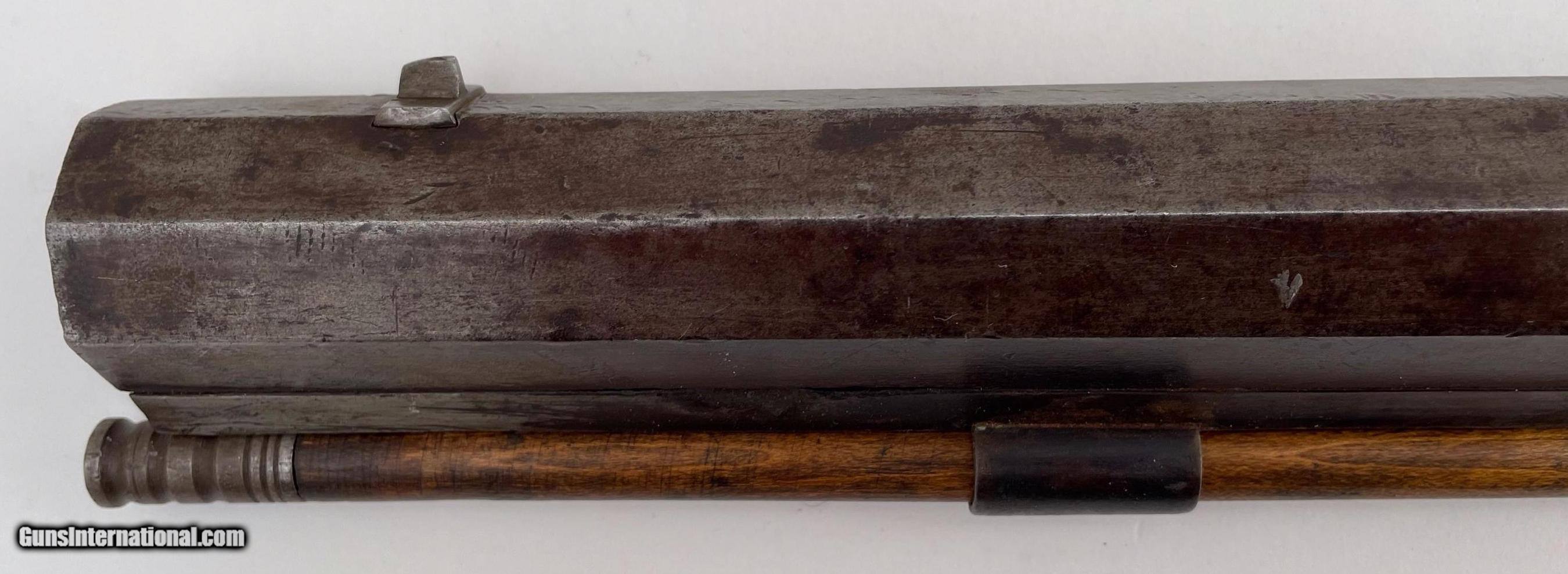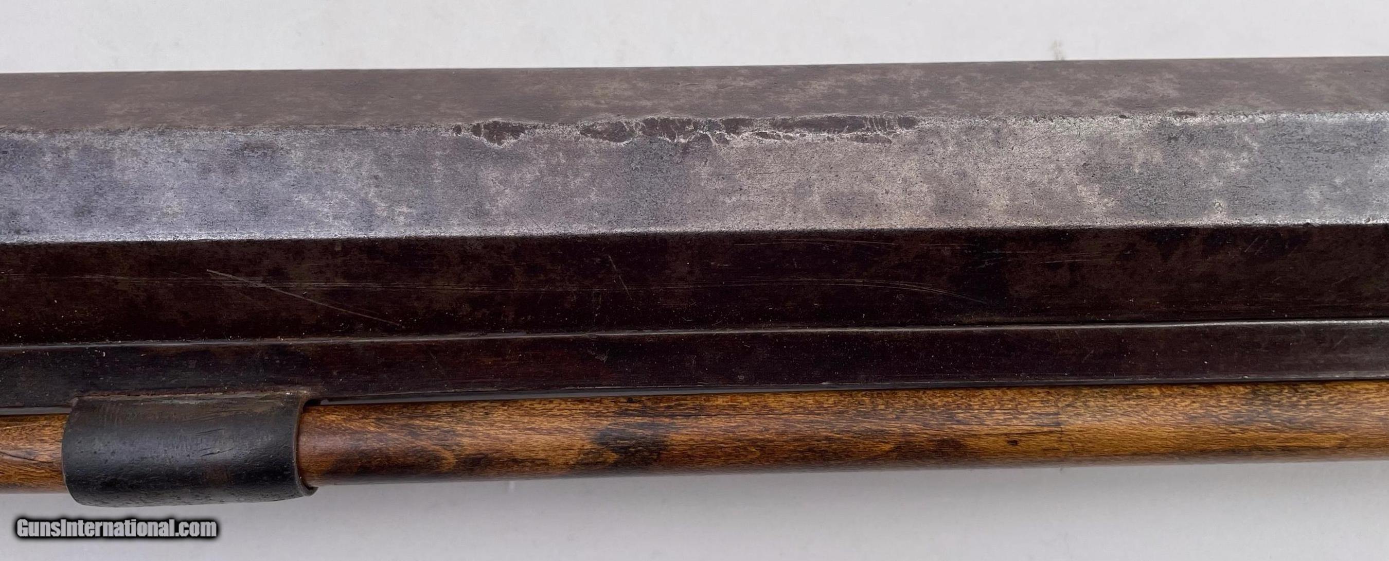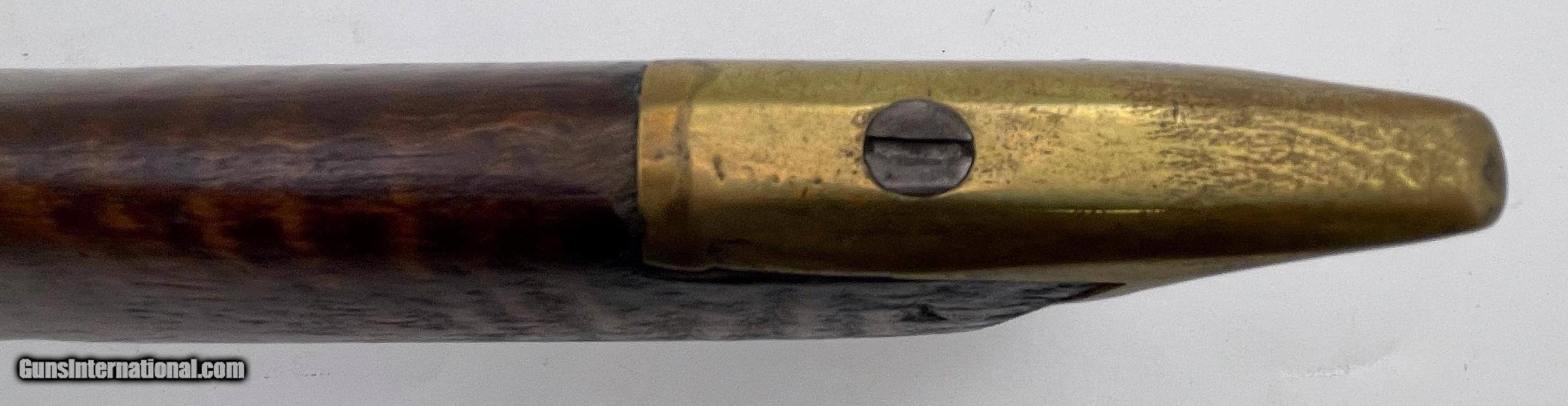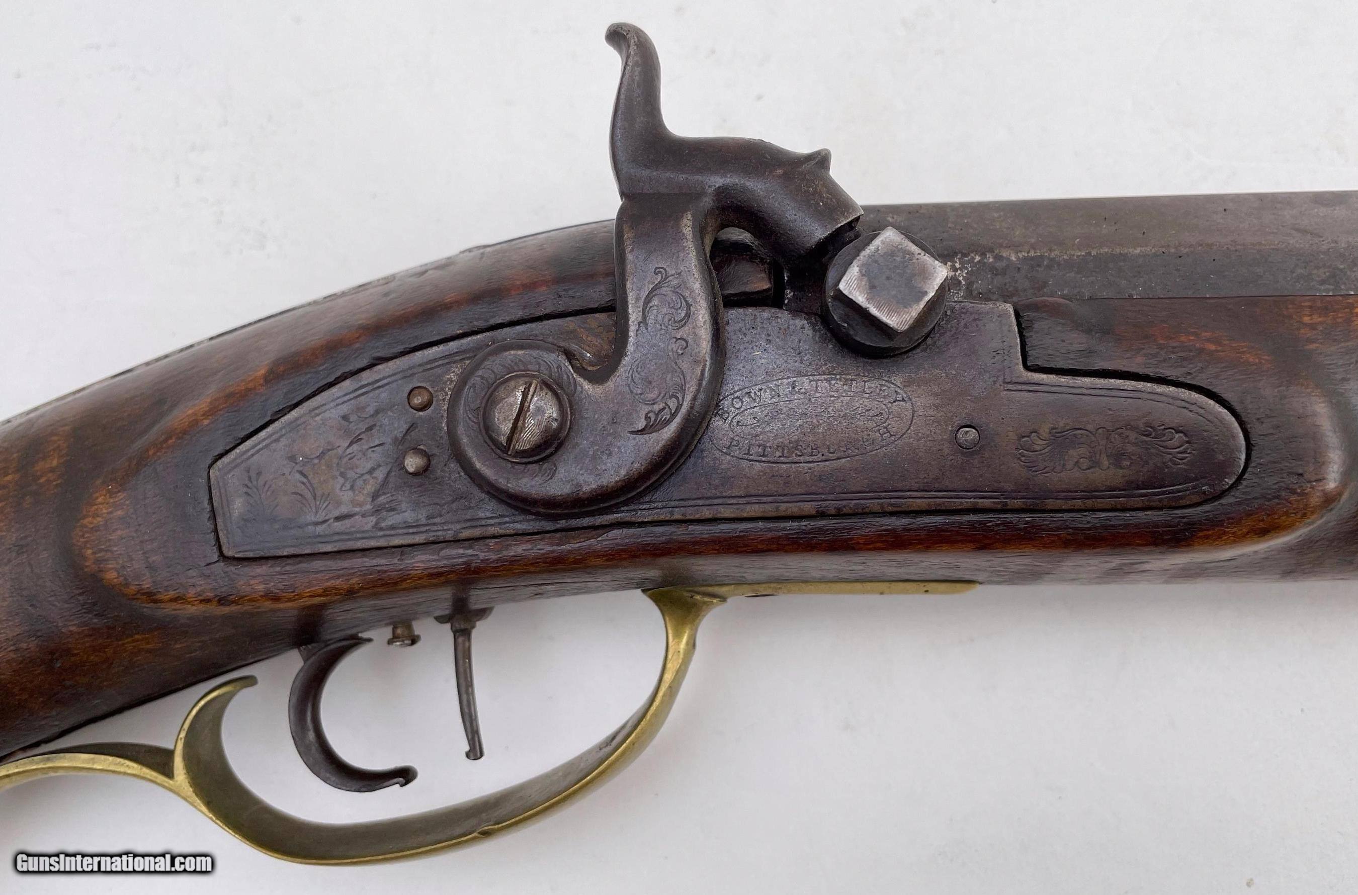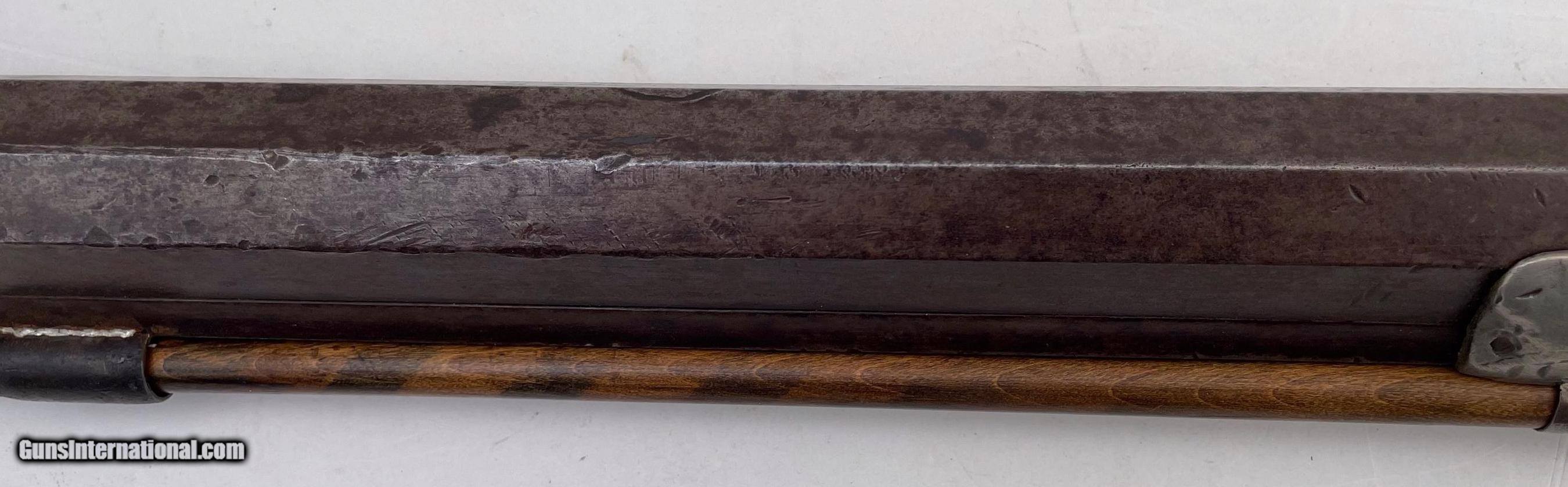 Description: The lockplate is marked "Bown & Tetley Pittsburgh The weight is over 14 1/2 Pounds. Barrel measures 1.30" across the flats at the muzzle. The bore measures .58" The rifling is a very fast twist and the bore is somewhat dark but the lands and grooves are strong. See photos for condition. SOLD Antique: Yes Manufacturer: J.C. Johnson Barrel Length: 34 |